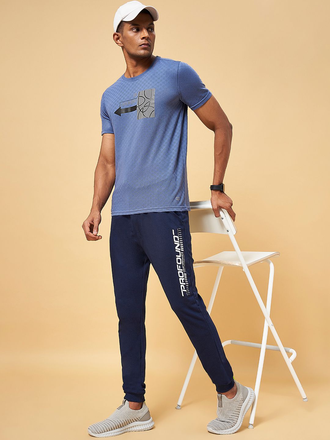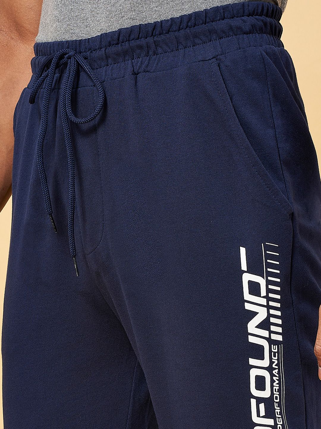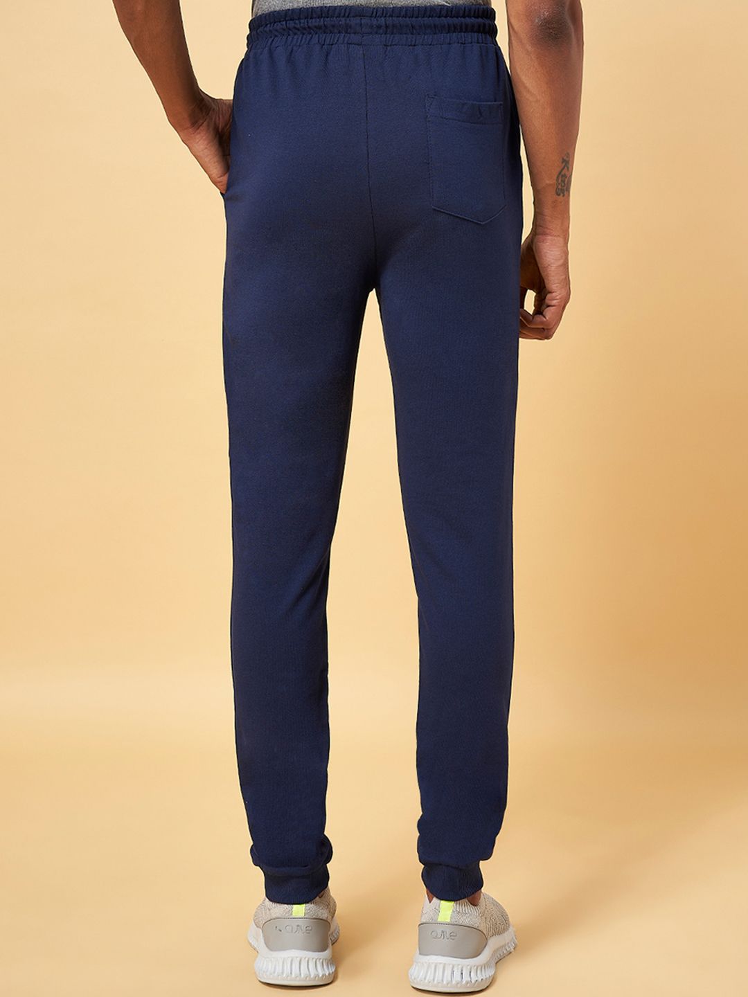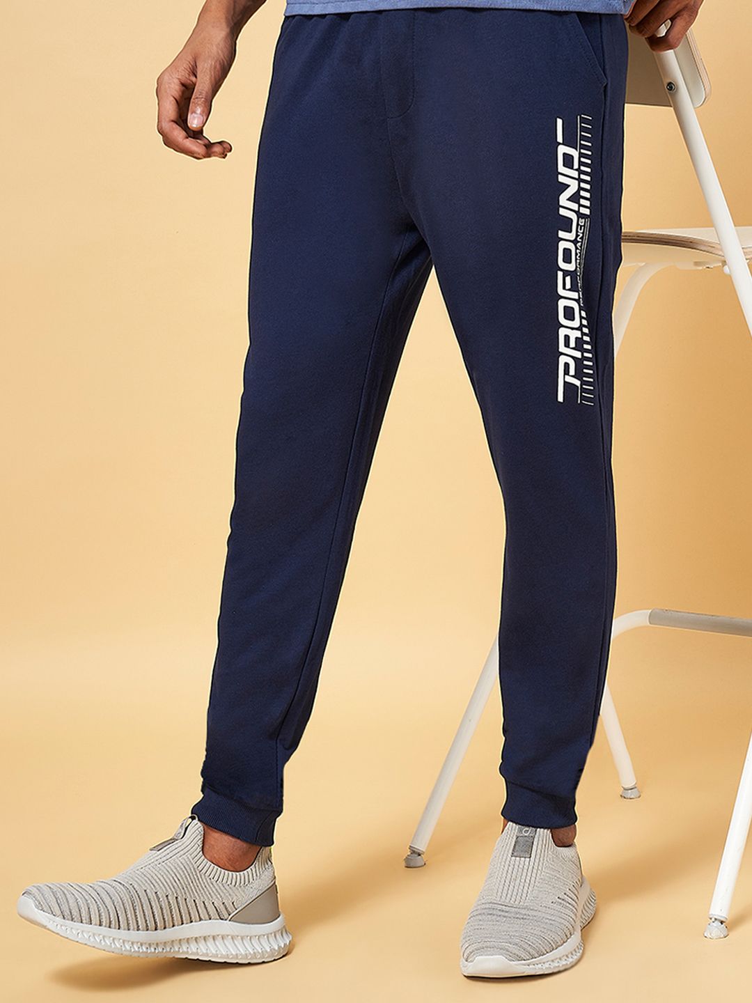 Navy blue solid slim-fit joggers with white typography detail on one side, has an elasticated waistband with drawstring closure, three pockets and cuffed hems