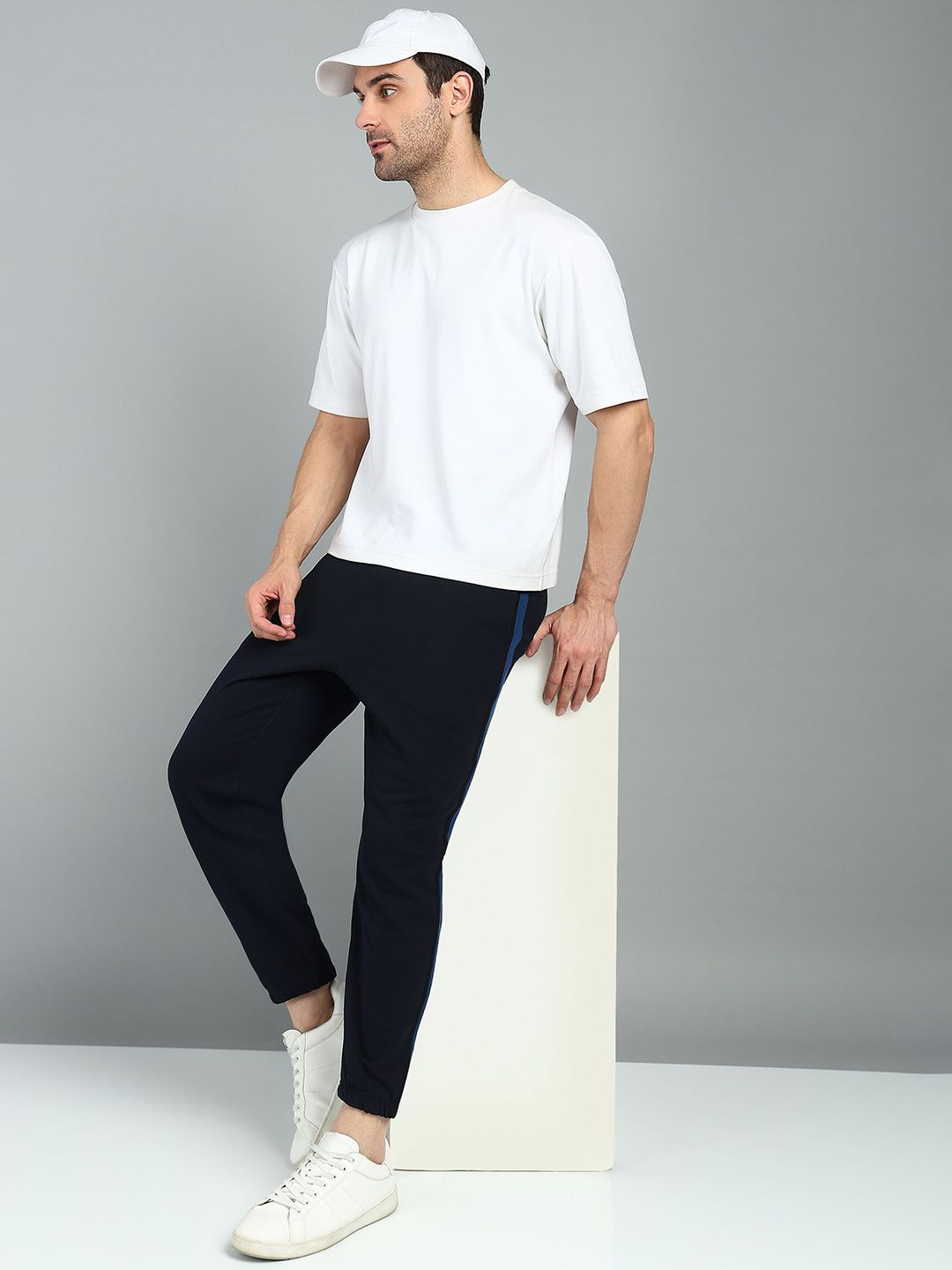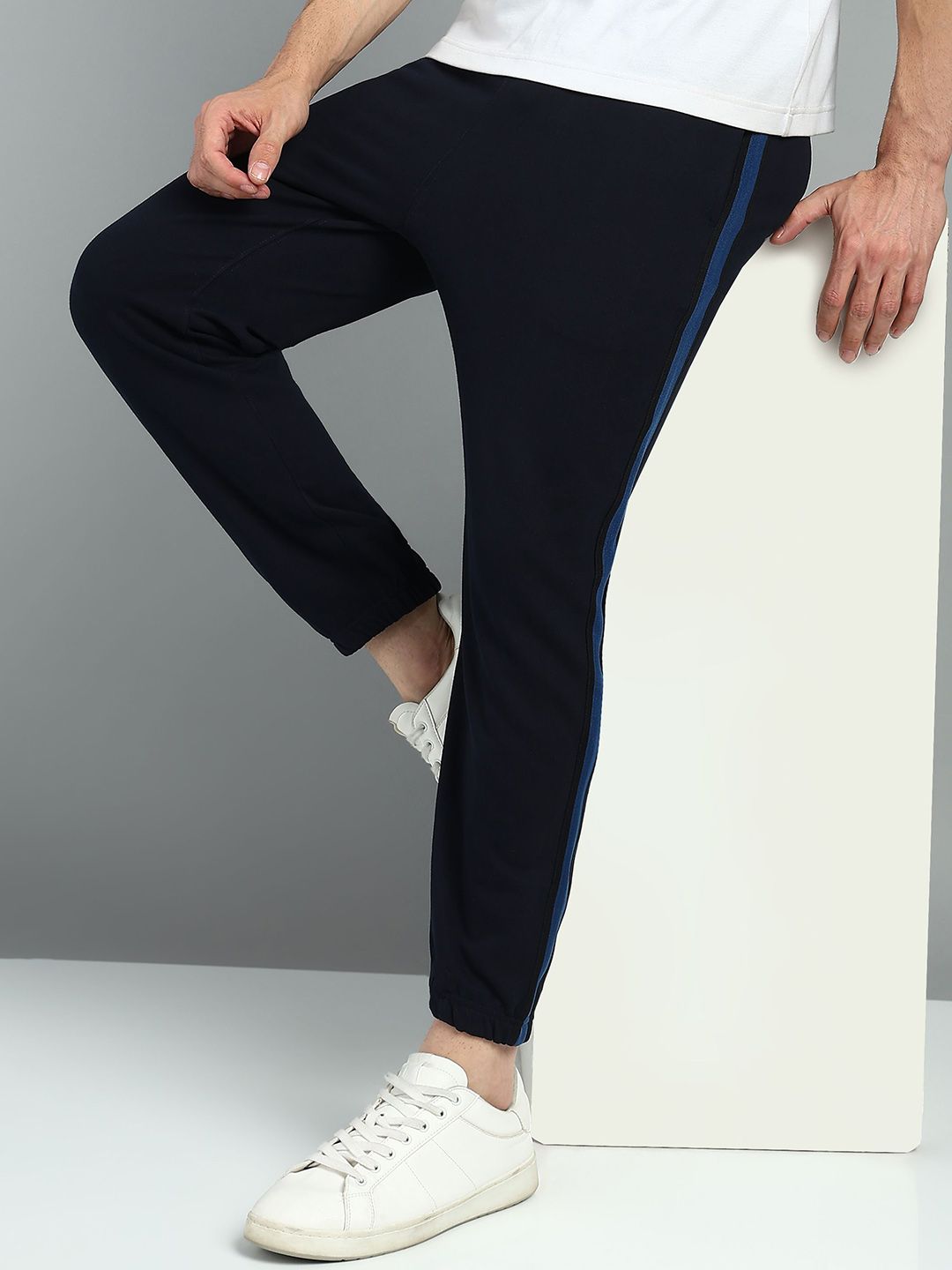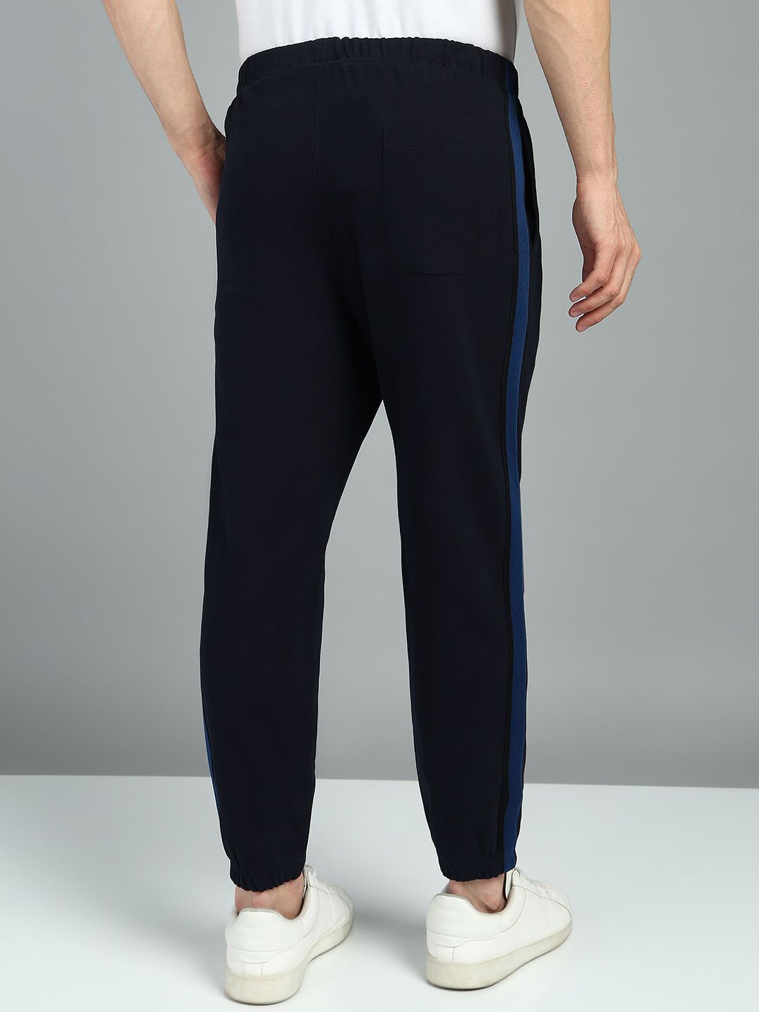 Navy-blue solid regular-fit mid-rise joggers with side stripe detail, has an elasticated waistband with slip-on closure, three pockets and cuffed hemsFeatures:Comfortable