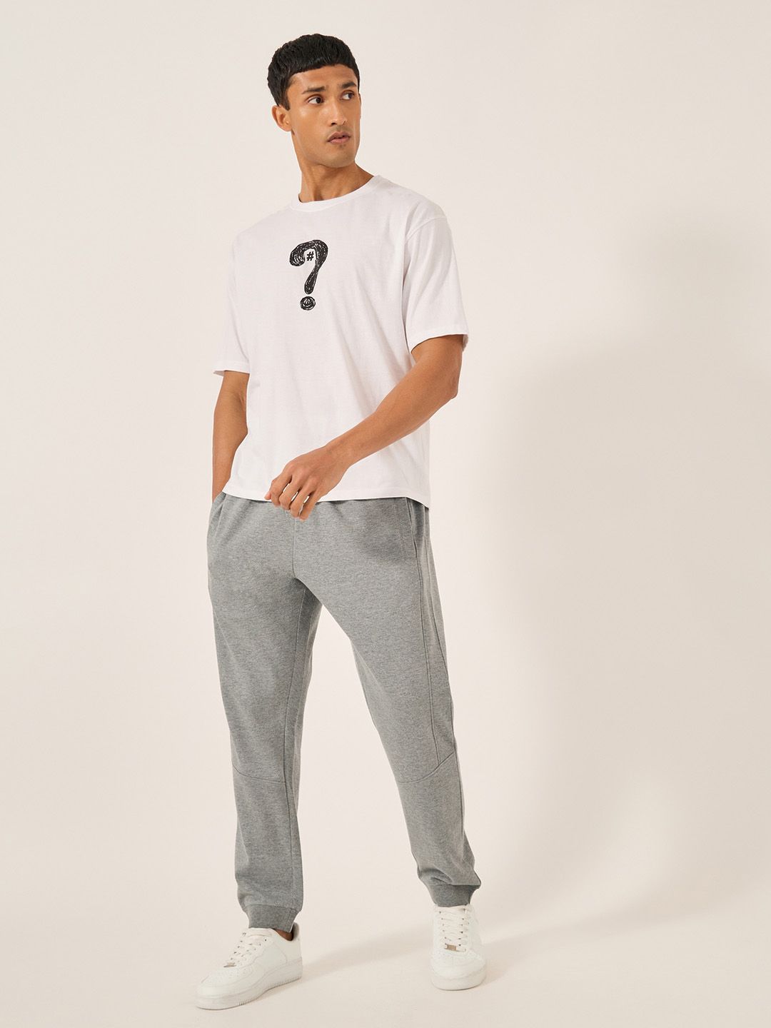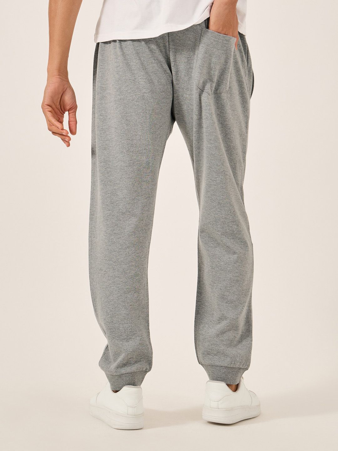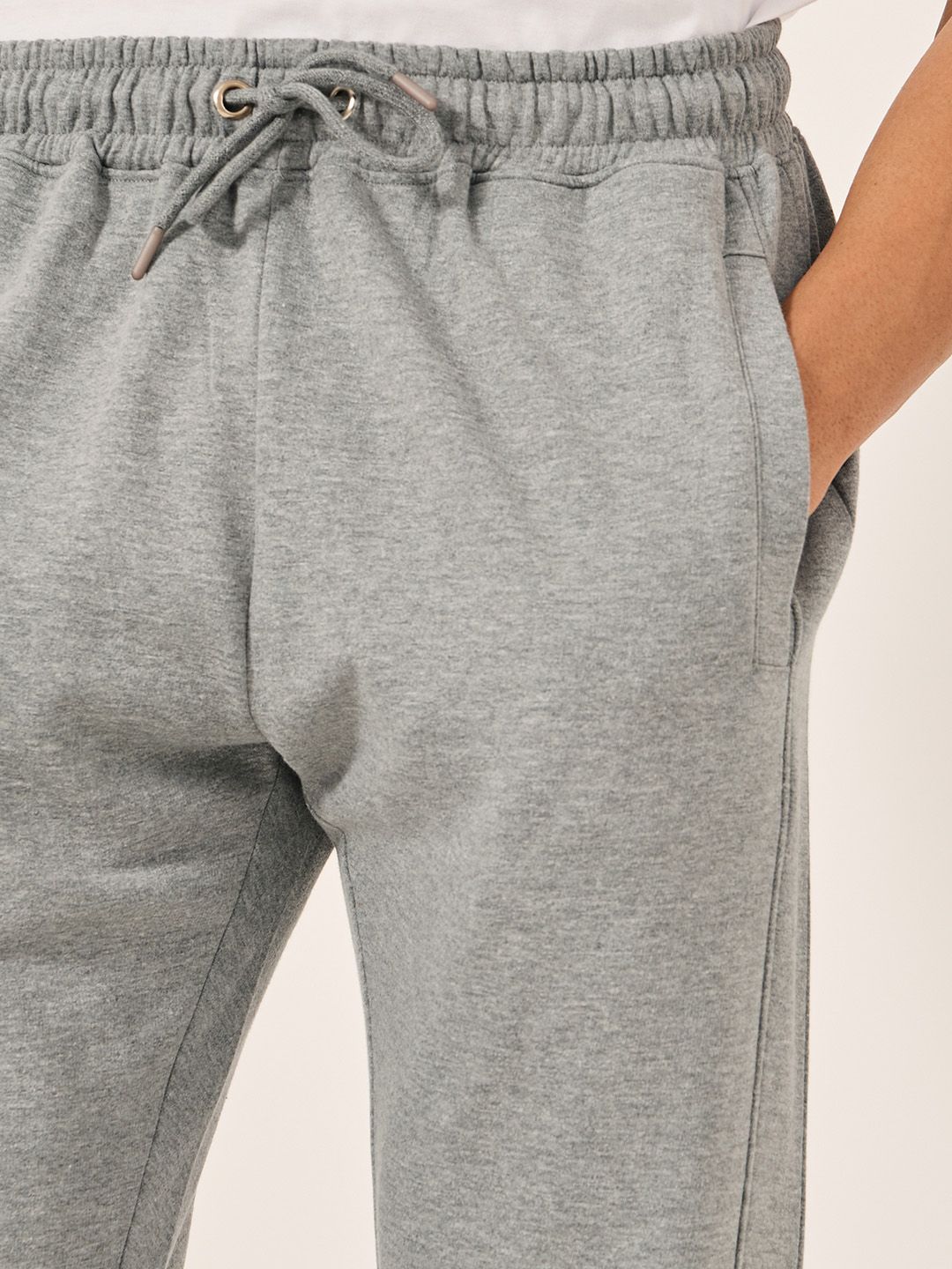 Grey solid slim-fit mid-rise joggers has an elasticated waistband with drawstring closure and two pockets