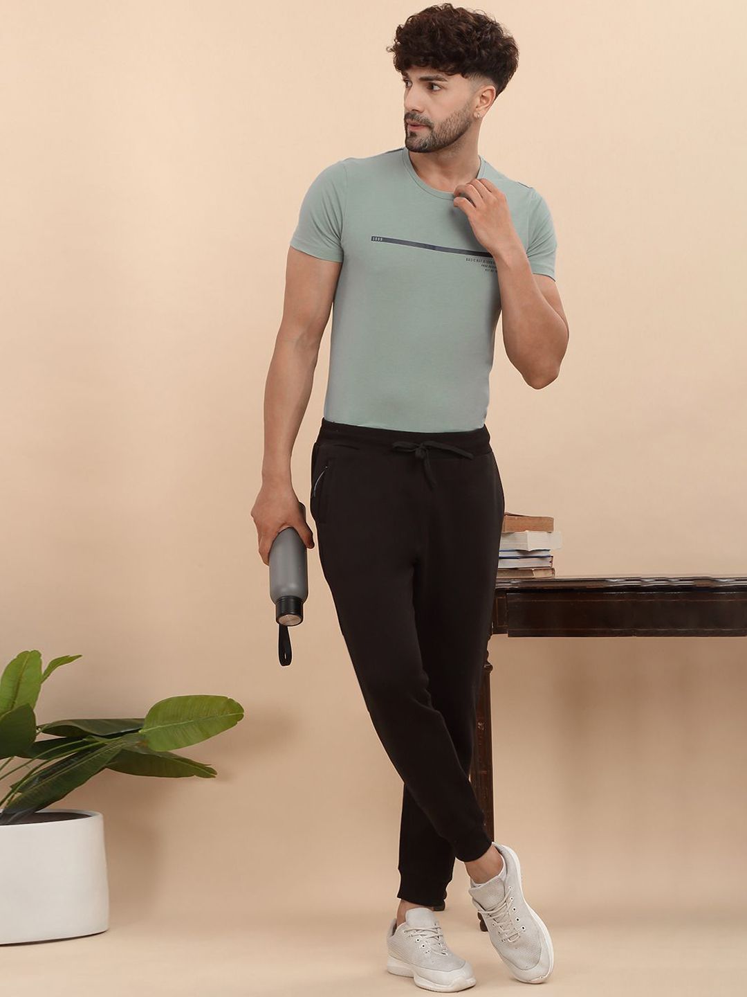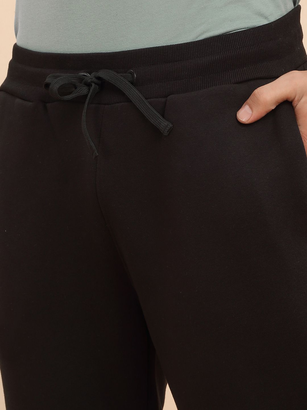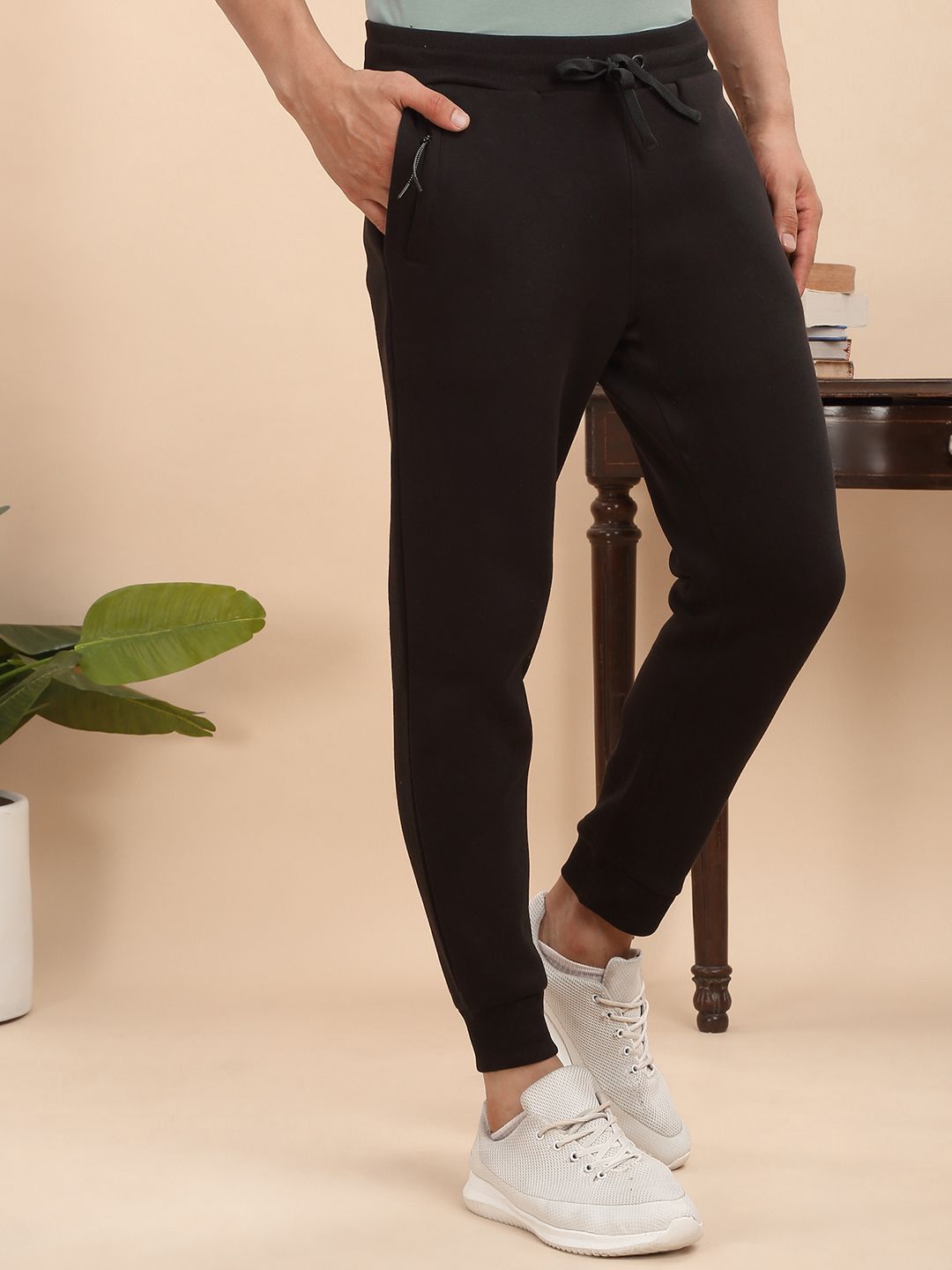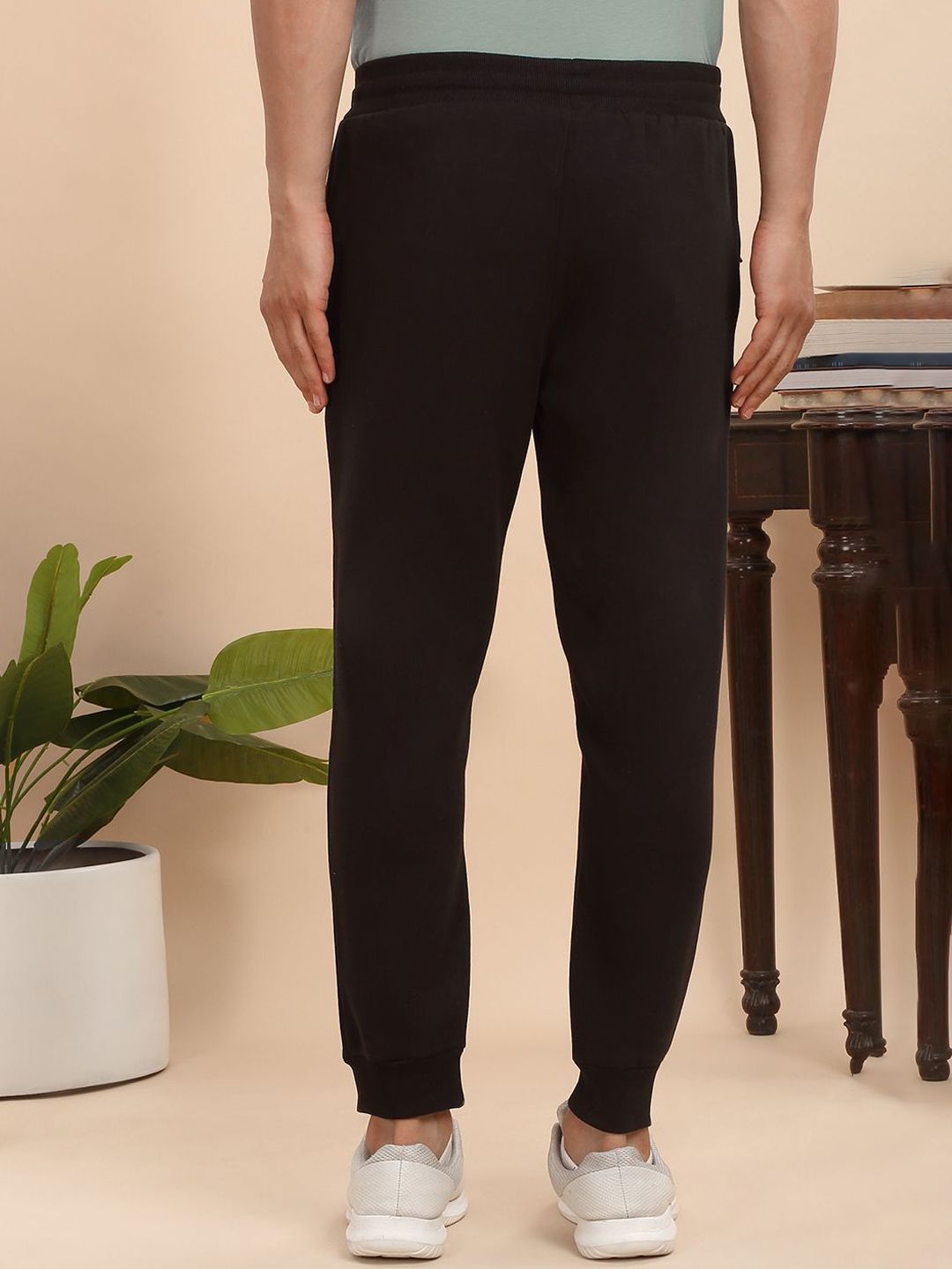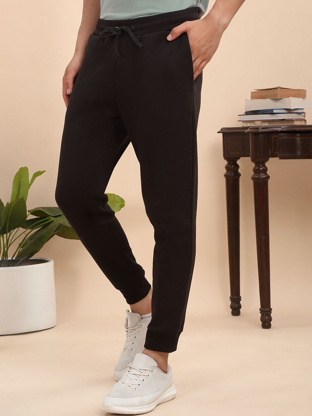 Black solid regular-fit mid-rise Joggers, has an elasticated waistband with drawstring closure, cuffed hem and two pocket