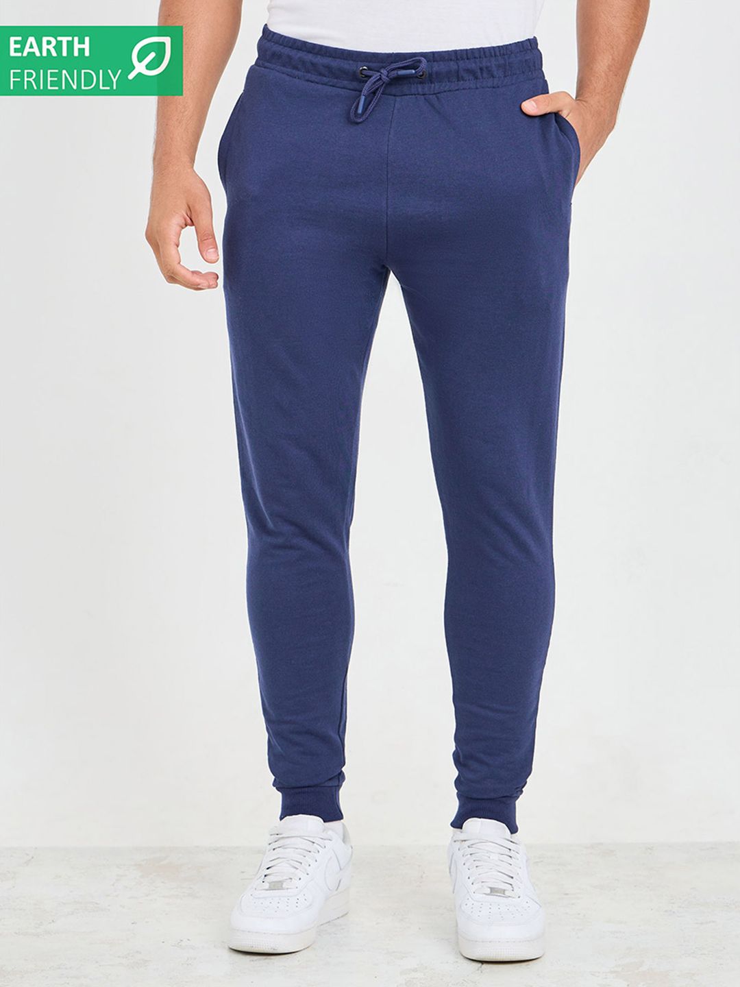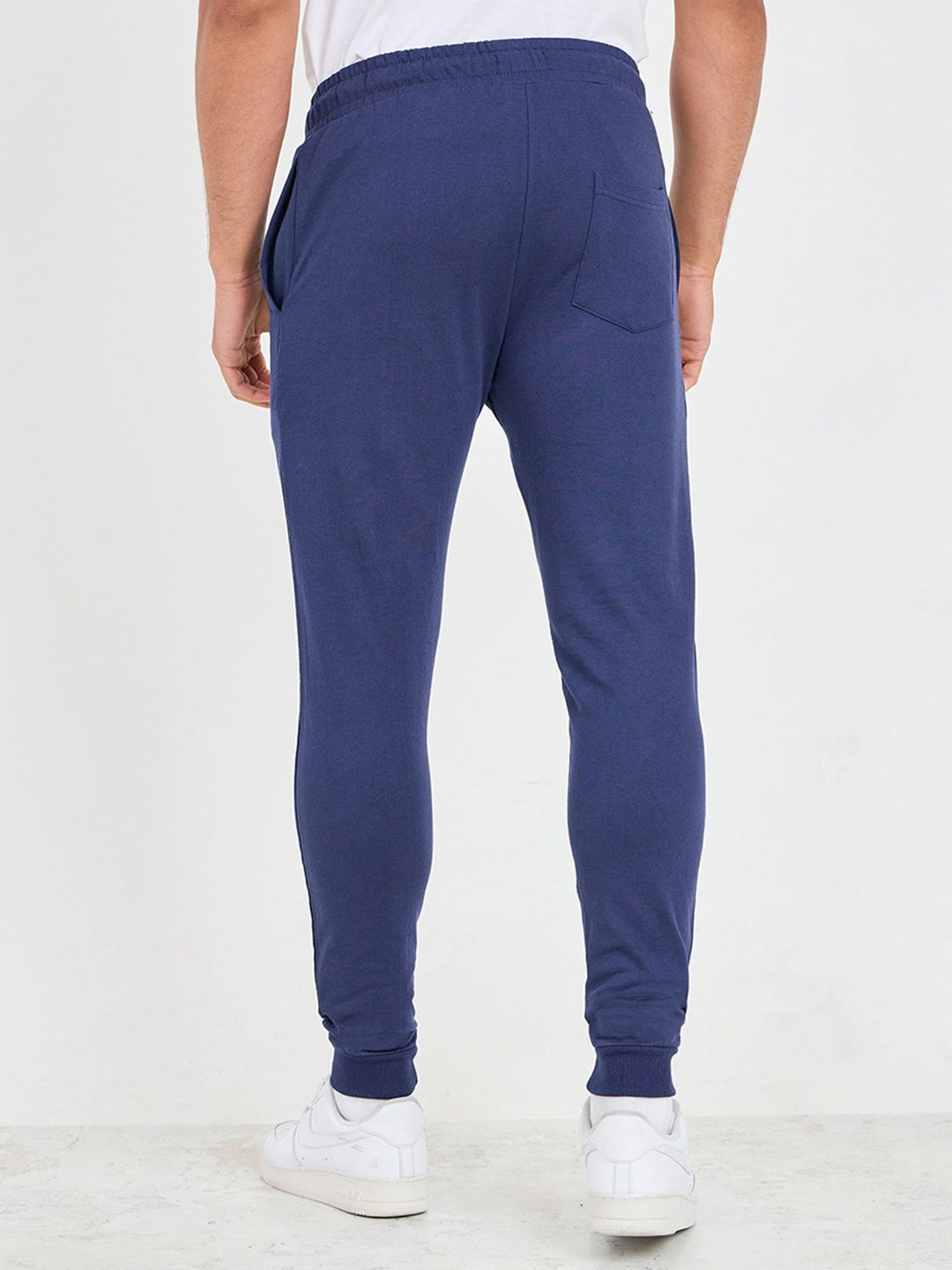 Navy-blue solid slim-fit mid-rise joggers, has elasticated waistband with drawstring closure, two side pockets, one back welt pocket and cuffed hems