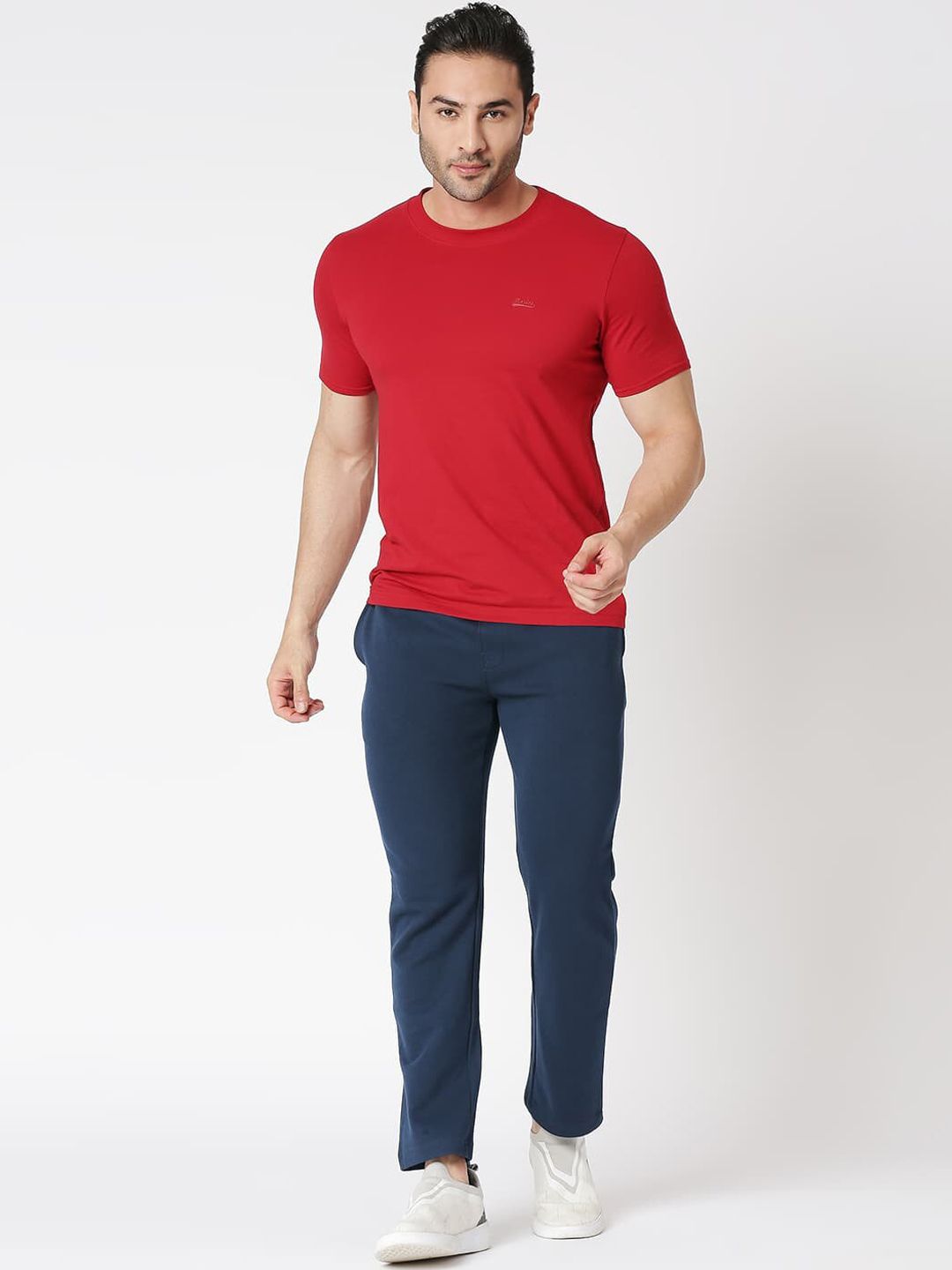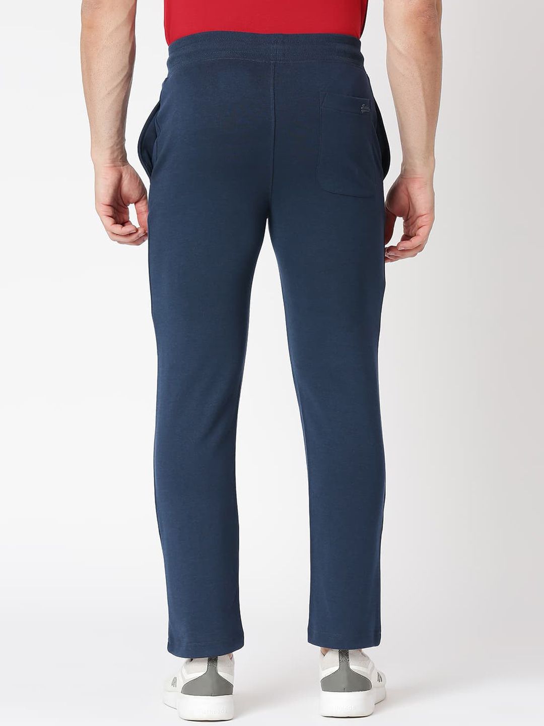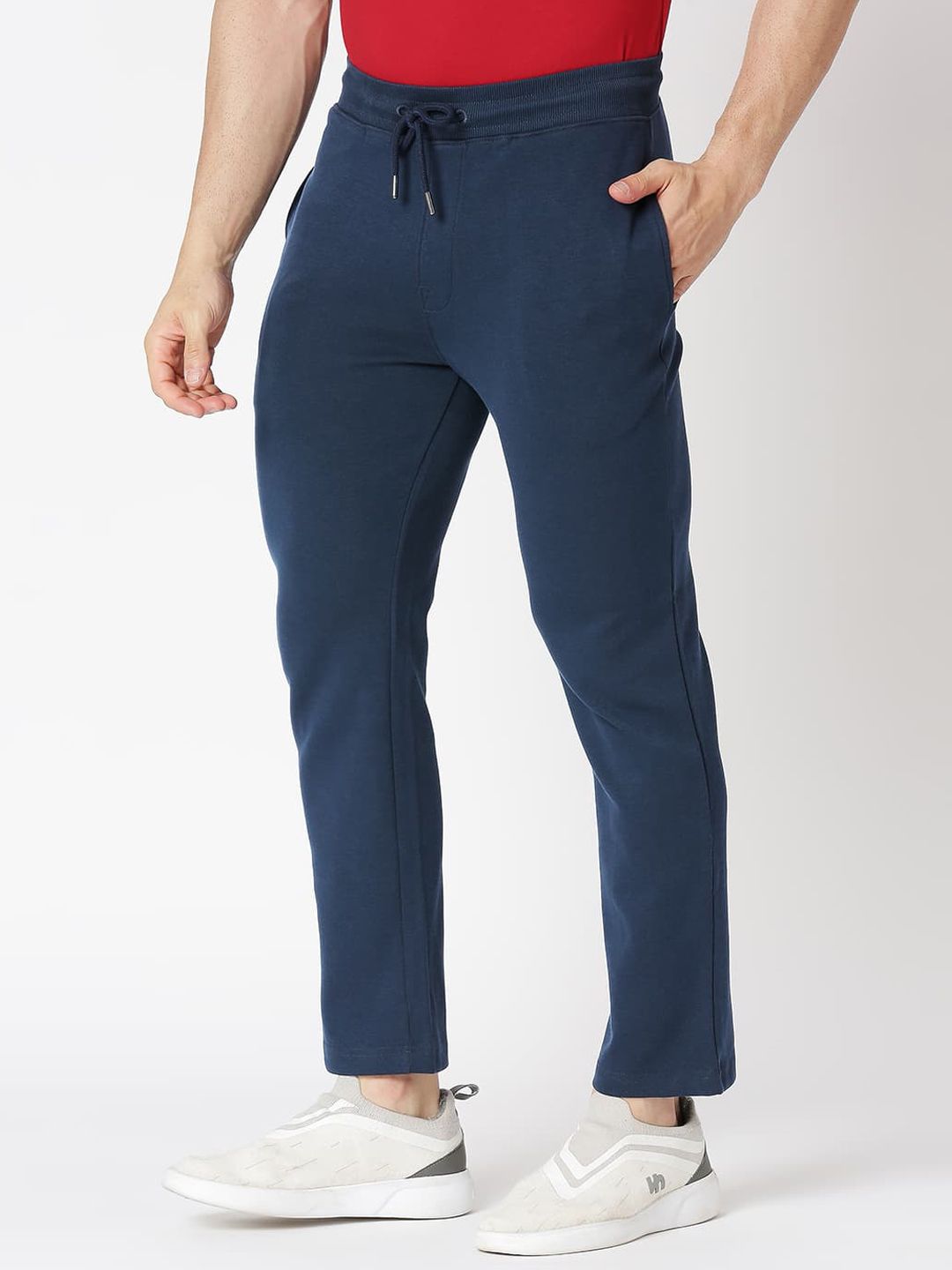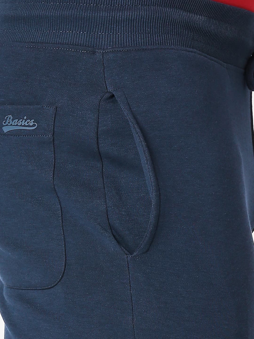 Navy-blue solid slim-fit mid-rise track pants, has an elasticated waistband with drawstring closure and three pockets