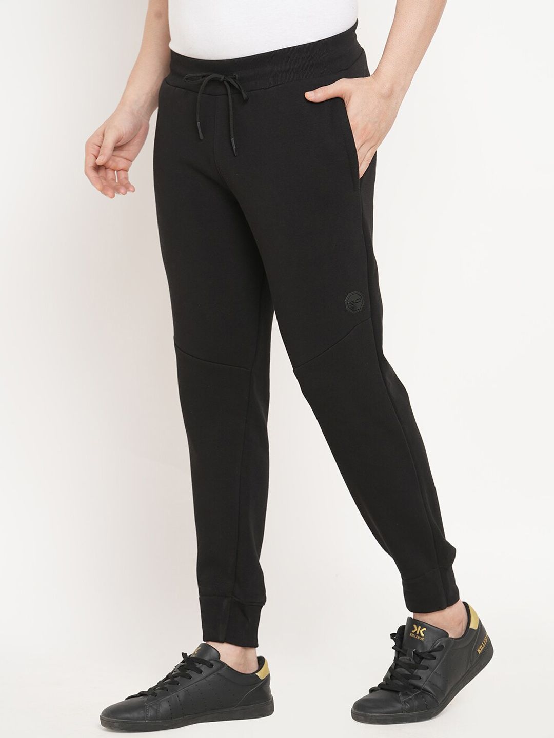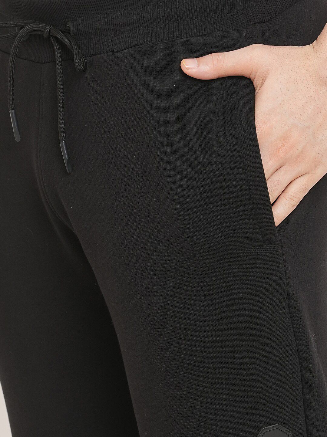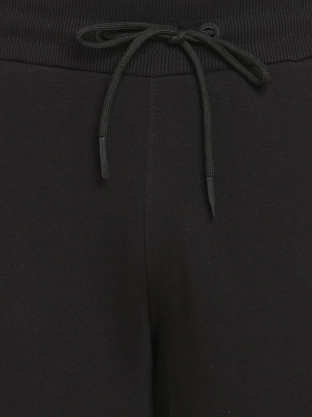 Black solid regular-fit mid-rise joggers has an elasticated waistband with drawstring closure and two pockets