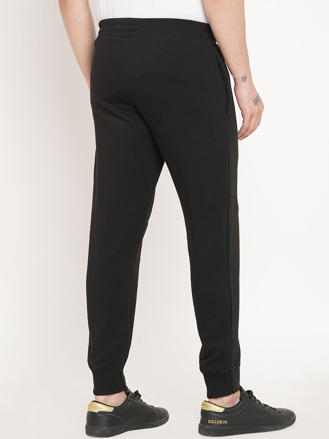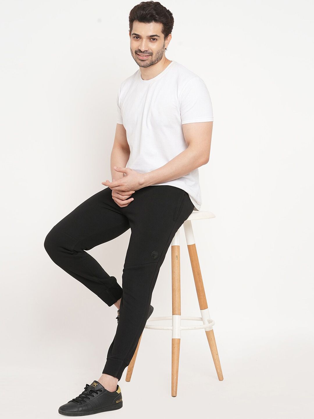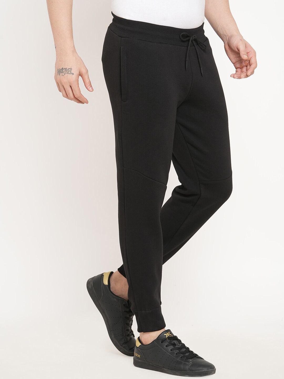 Black solid regular-fit mid-rise joggers has an elasticated waistband with drawstring closure and two pockets