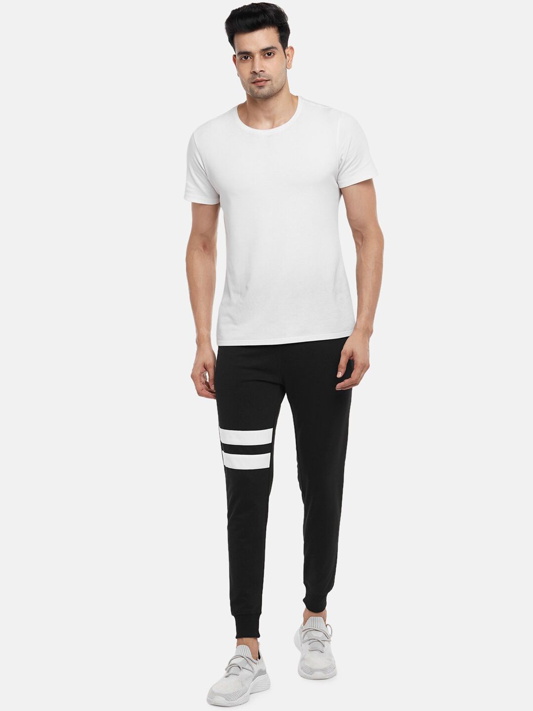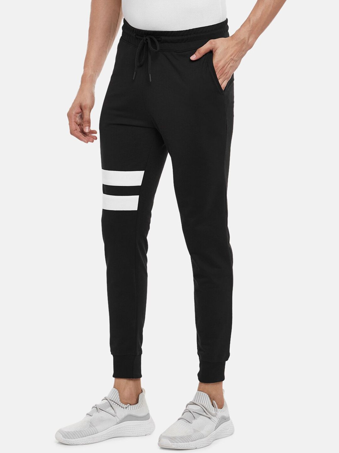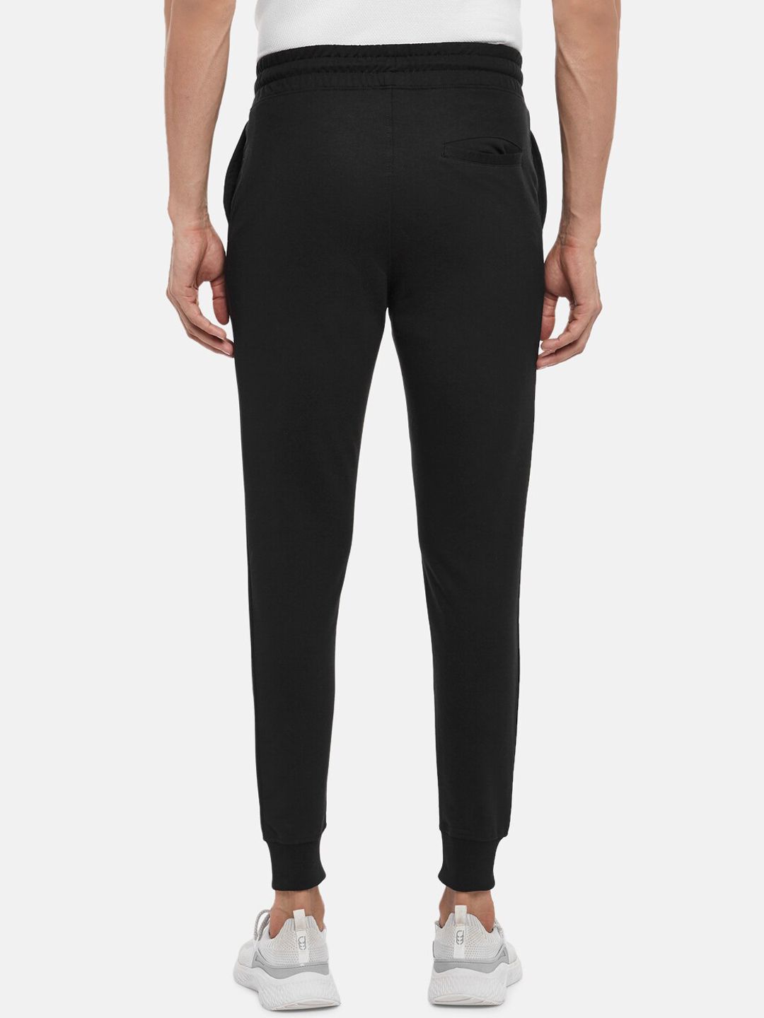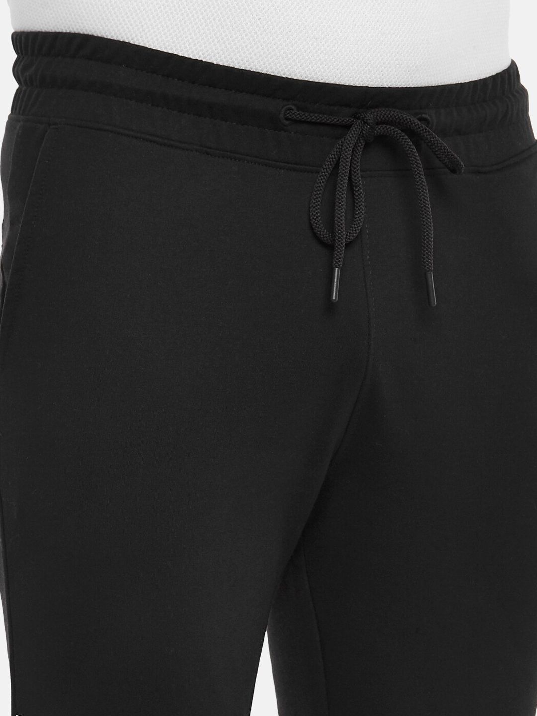 Black solid slim-fit joggers, has three pockets, a drawstring fastening detail, cuffed hem