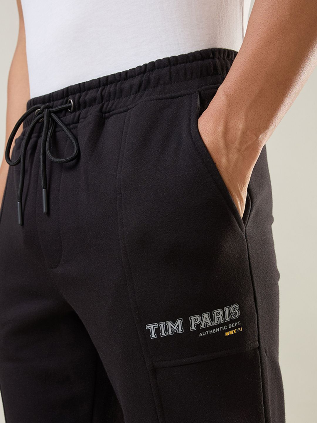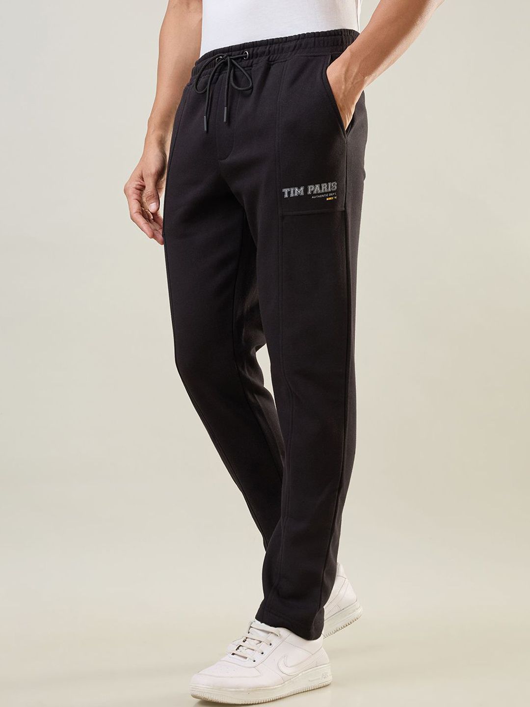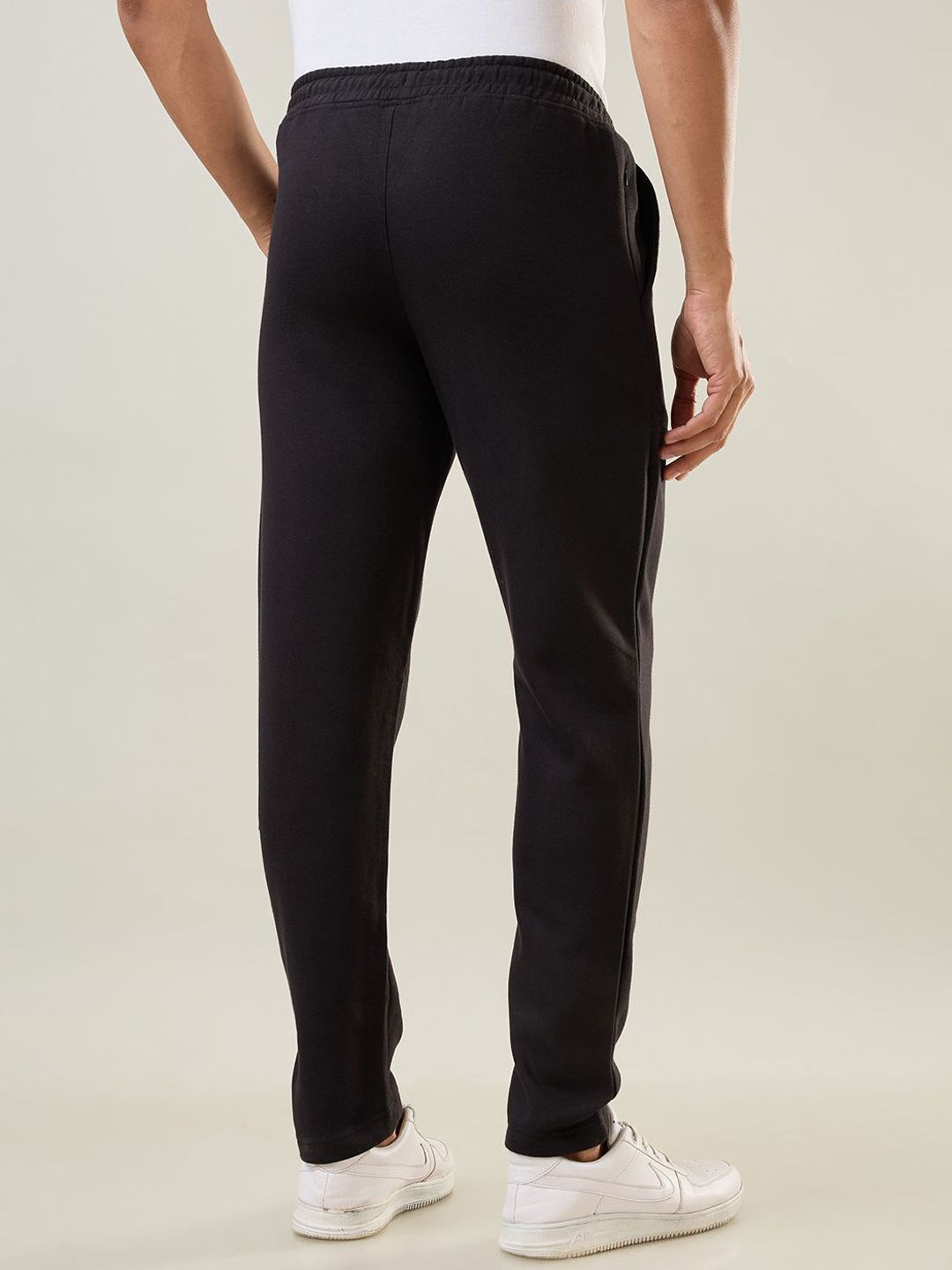 Black solid regular-fit track pant has an elasticated waistband with drawstring closure and two pockets