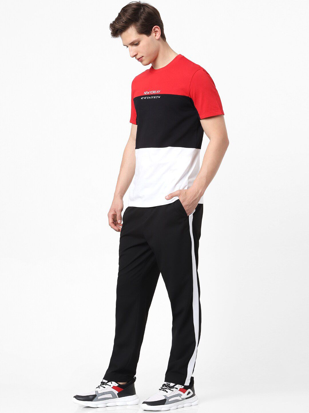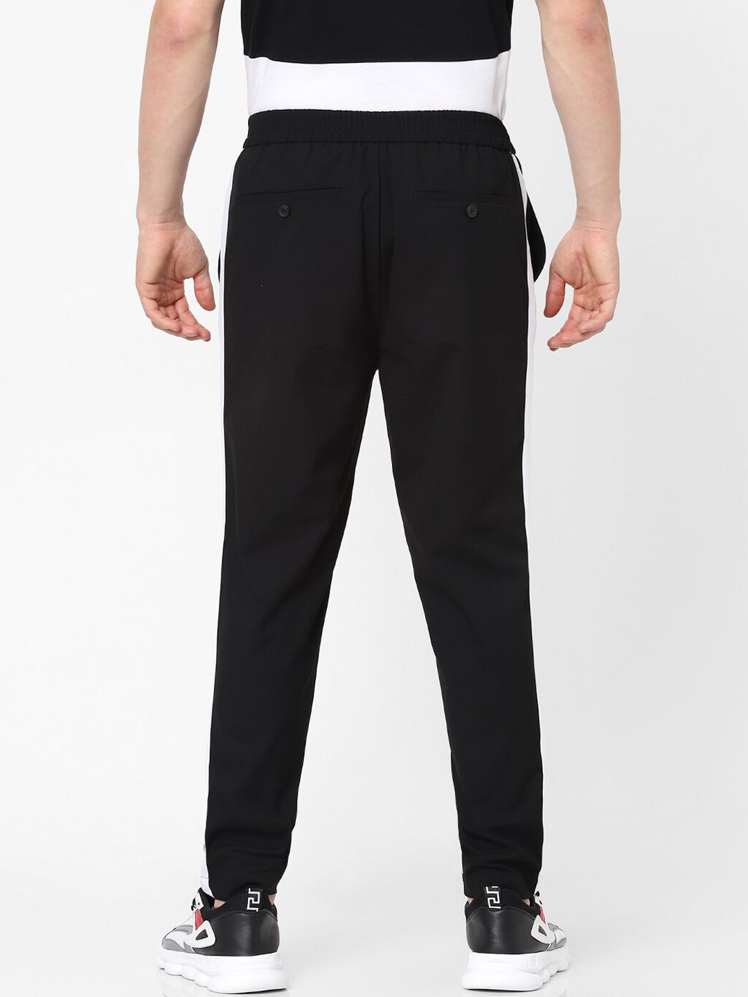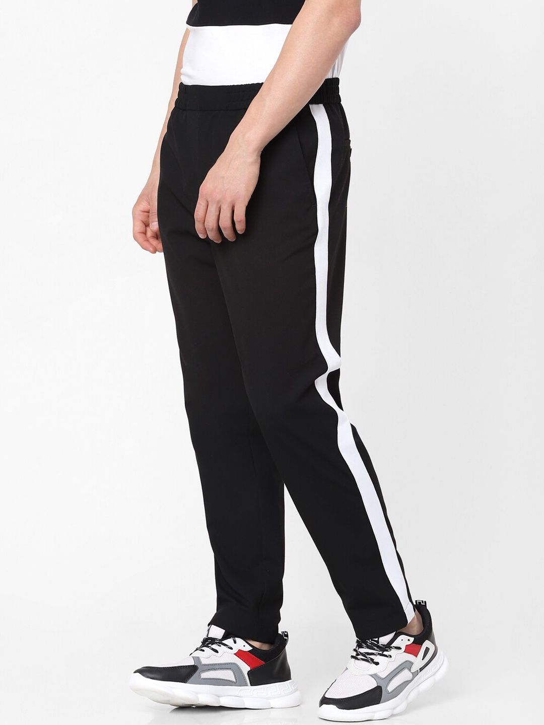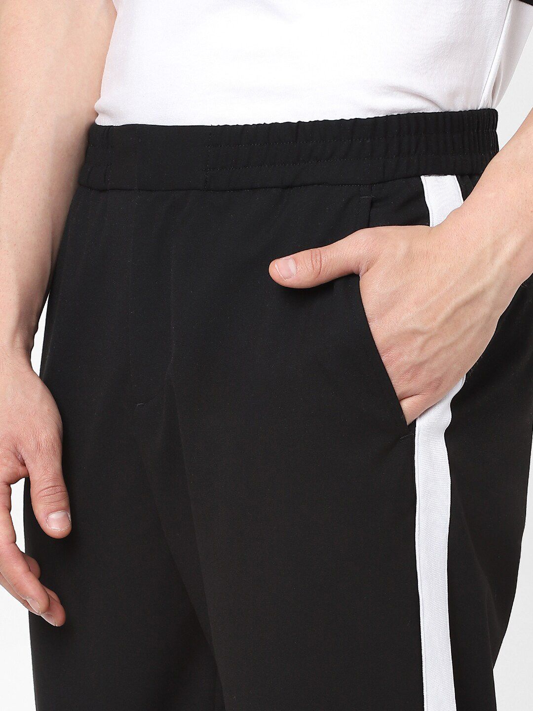 Black solid regular-fit track pants with contrast striped detail, has an elasticated waistband with slip-on closure and 4 pockets