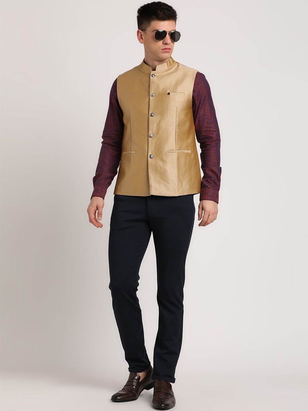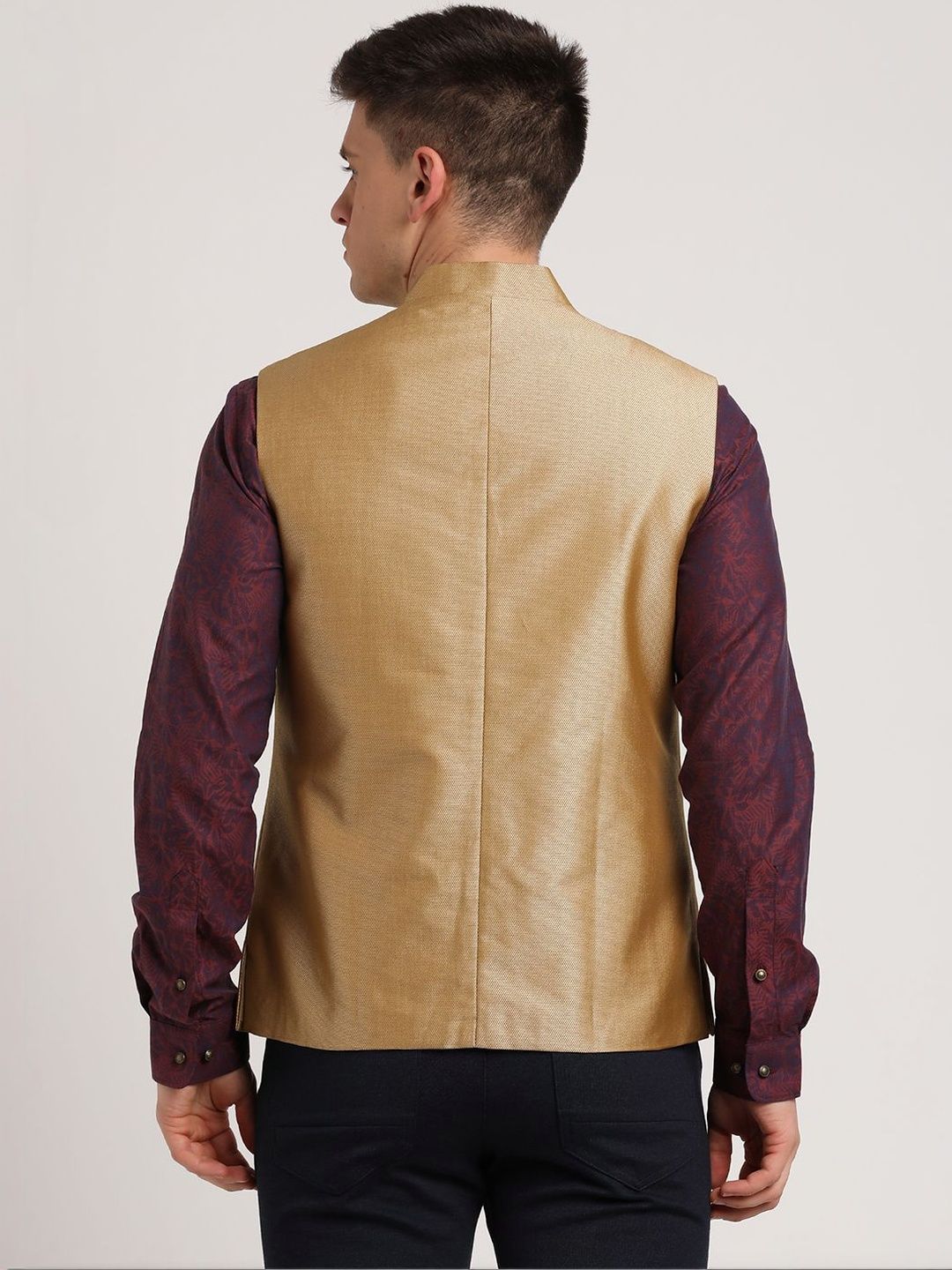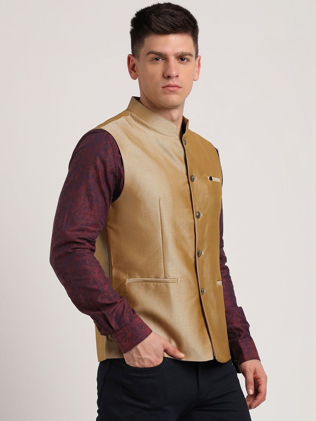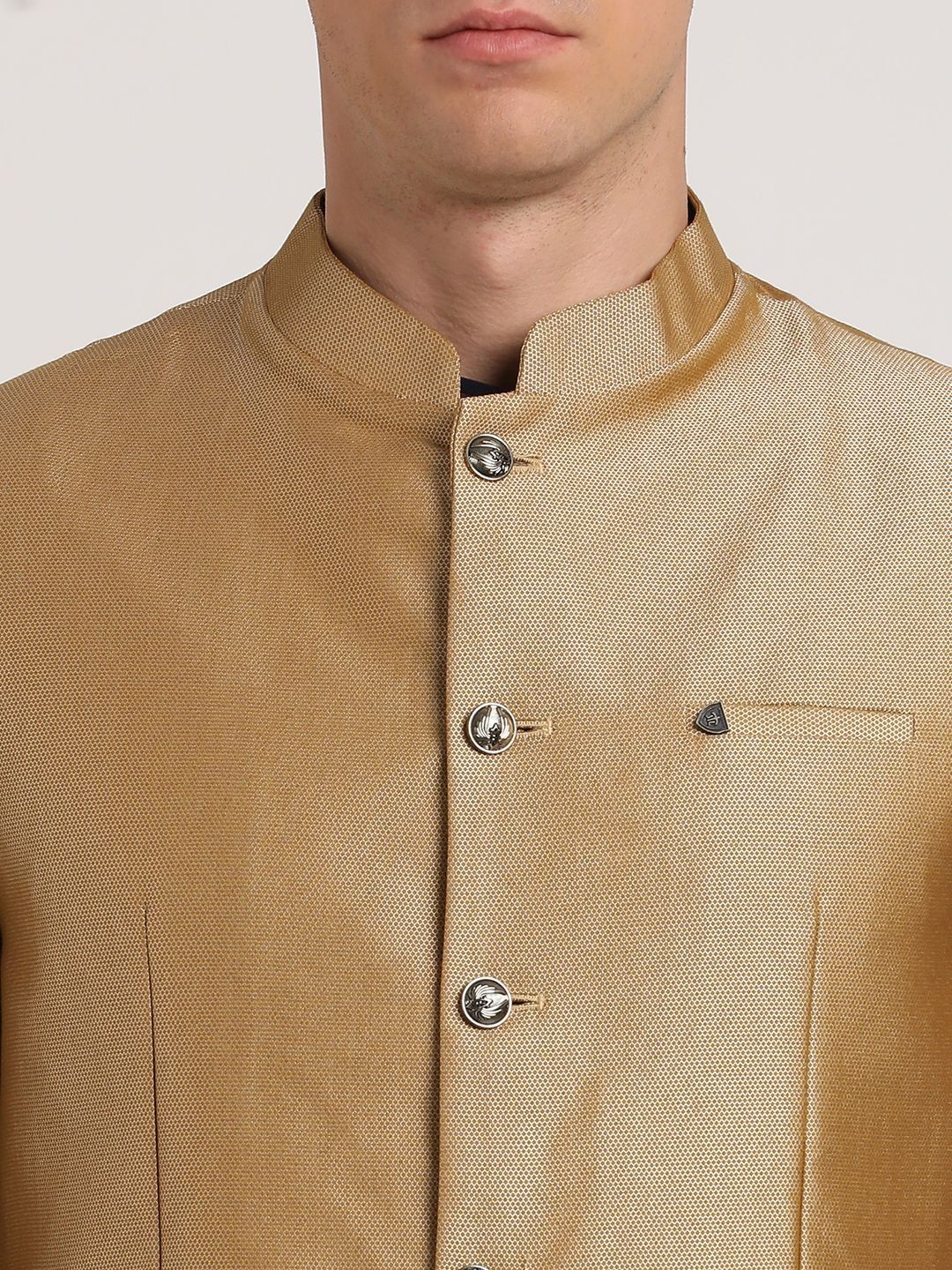 Gold woven design nehru jacket, has a mandarin collar, a full button jacket, sleeveless, two pocketsDisclaimerDoes not come with pocket squareNo accessories