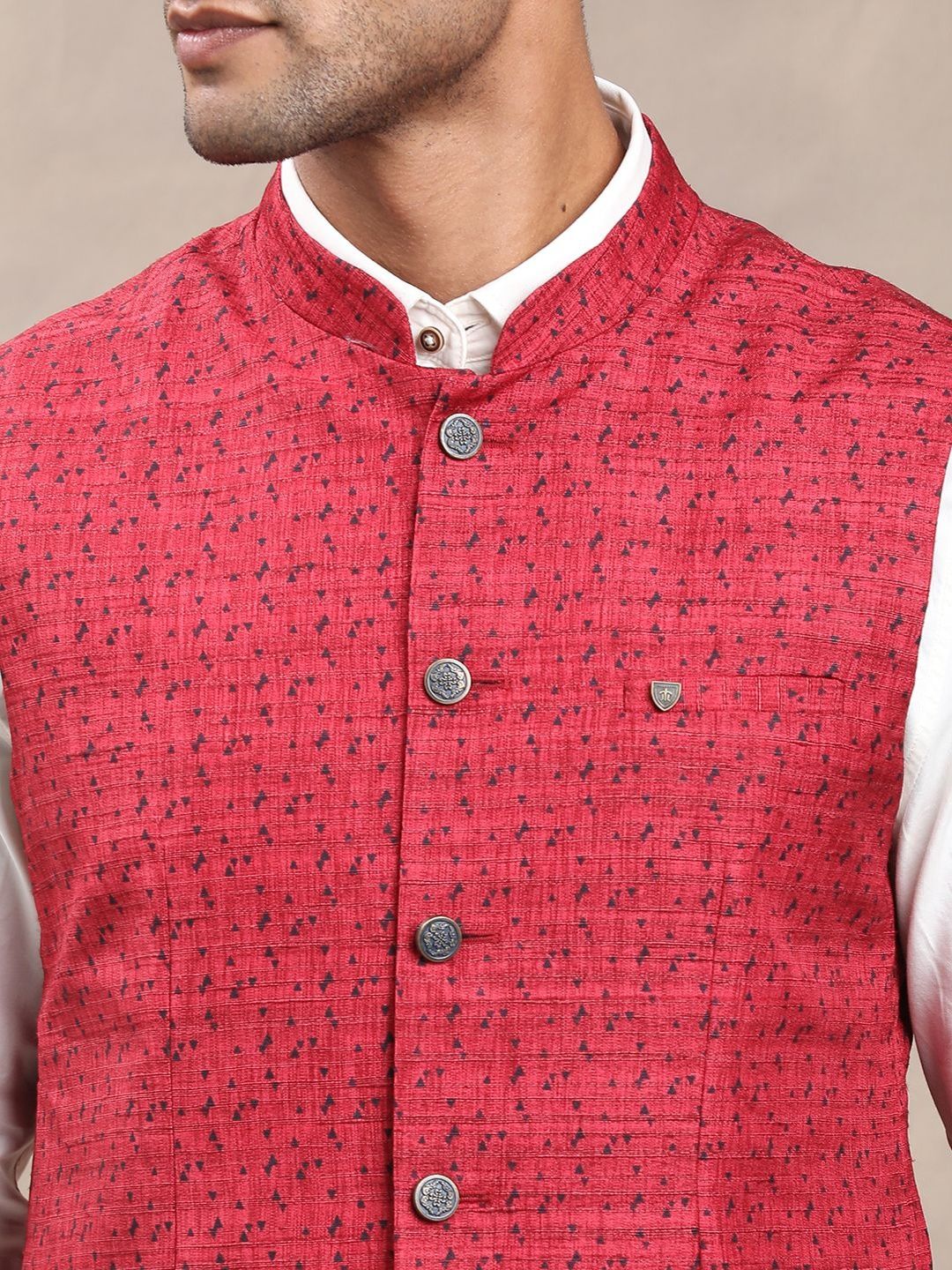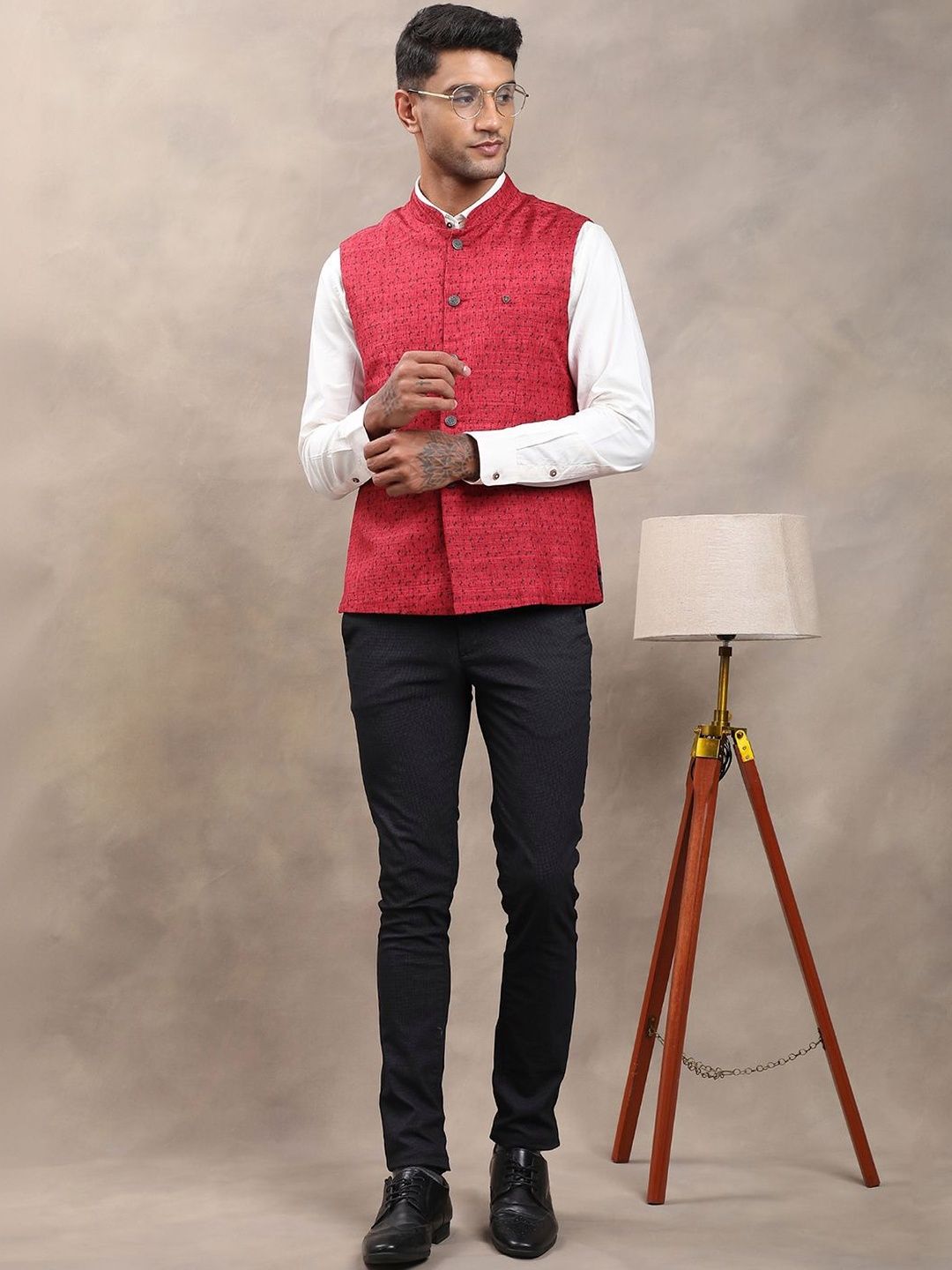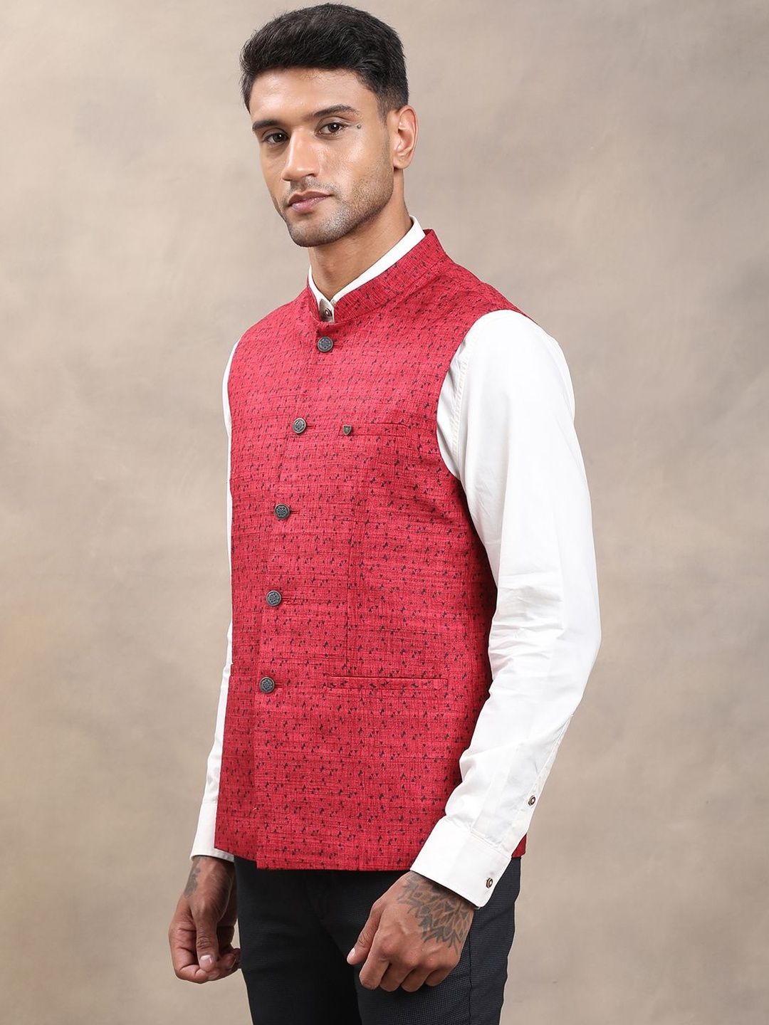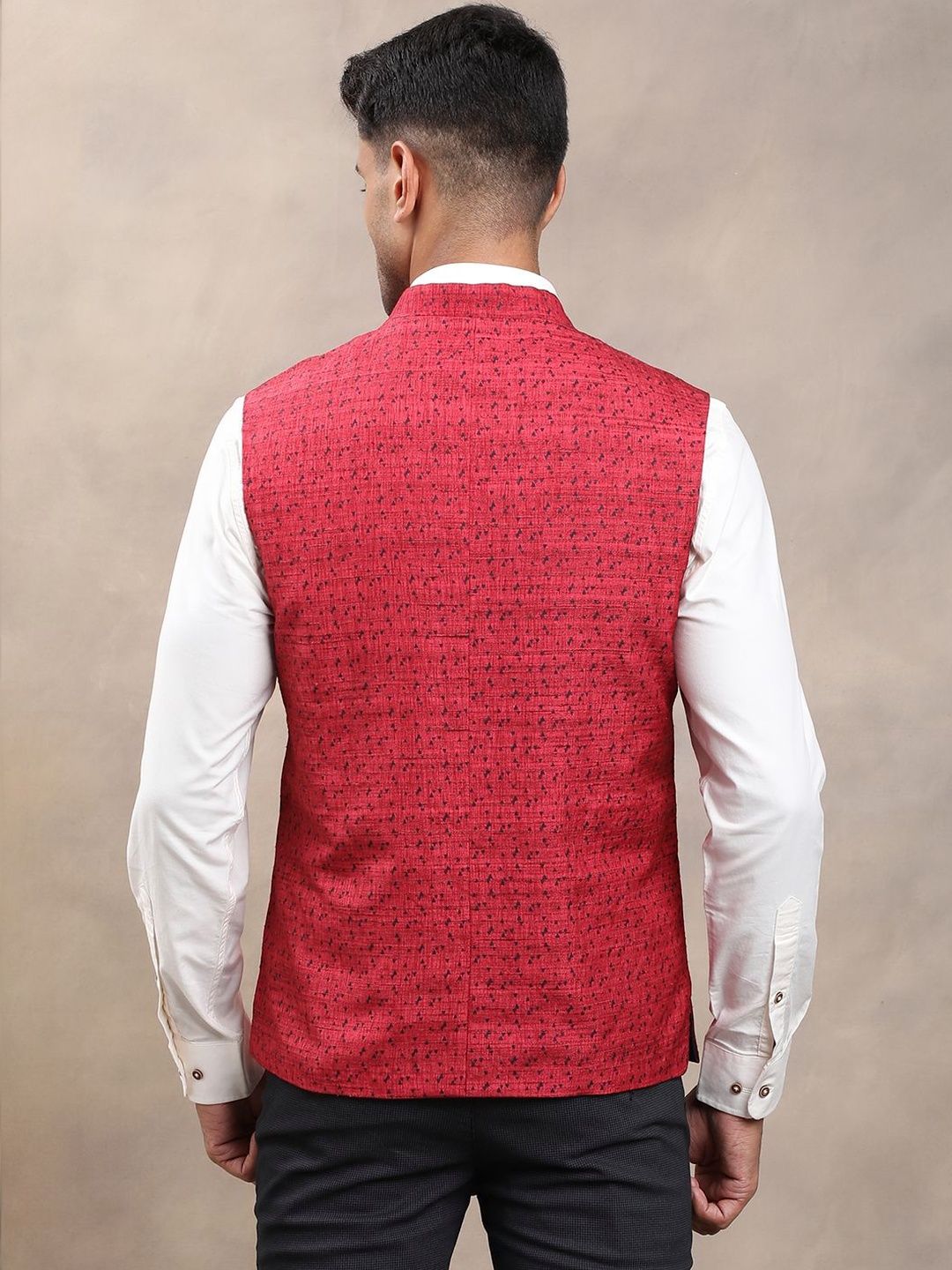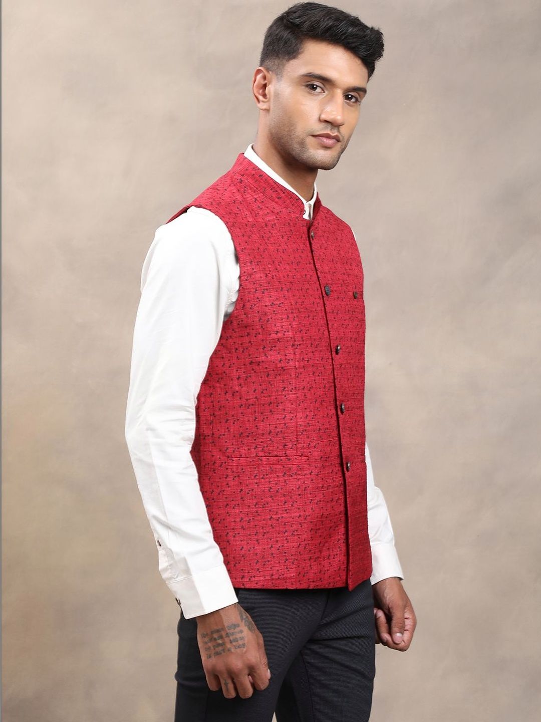 Red woven design Nehru jacket, has a mandarin collar, a full button placket, sleeveless, three pocketsDisclaimerDoes not come with pocket squareNo accessories