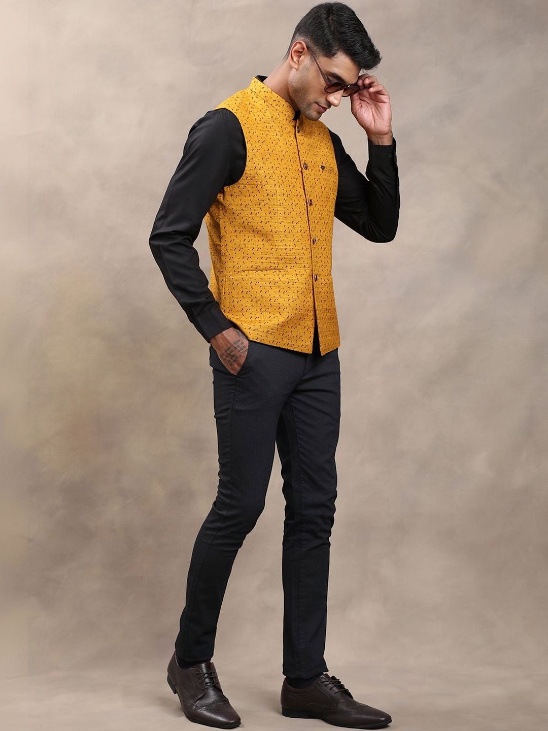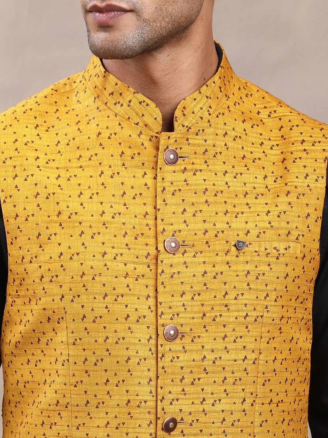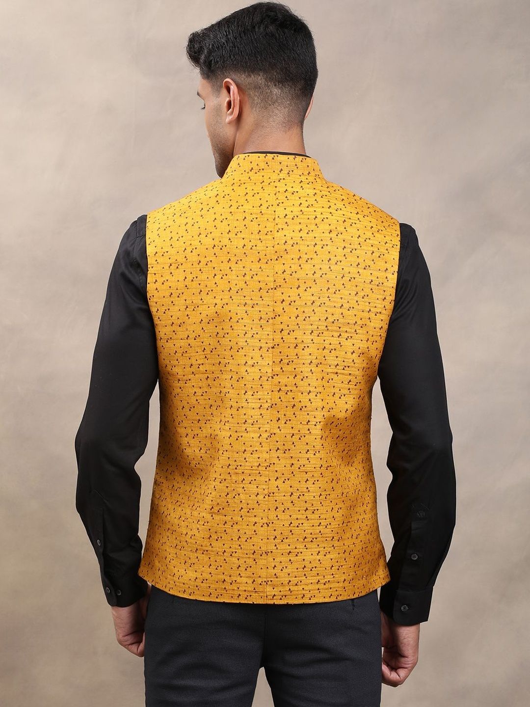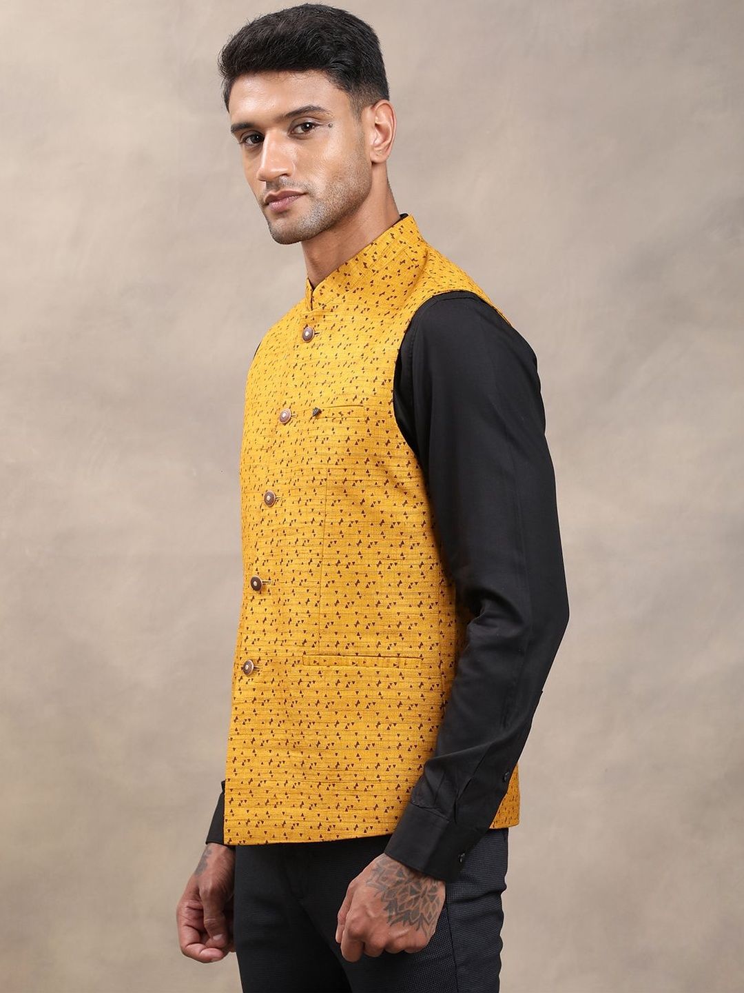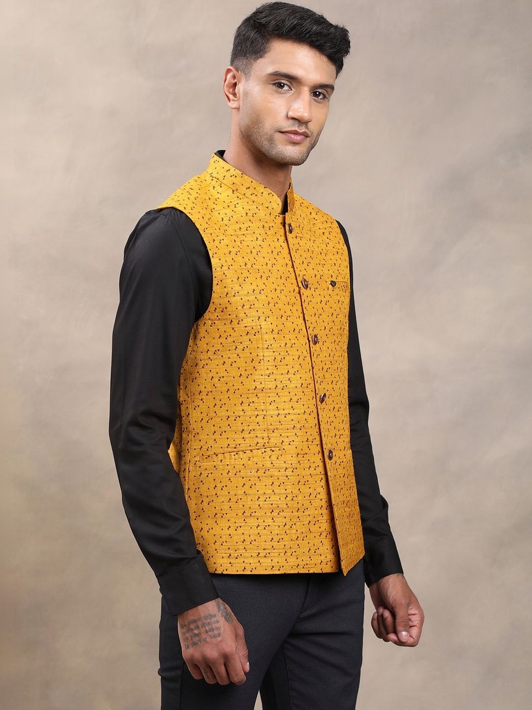 Yellow woven design nehru jackets, has a mandarin collar, a full button placket, sleeveless, 2 pocketsDisclaimerDoes not come with pocket squareNo accessories