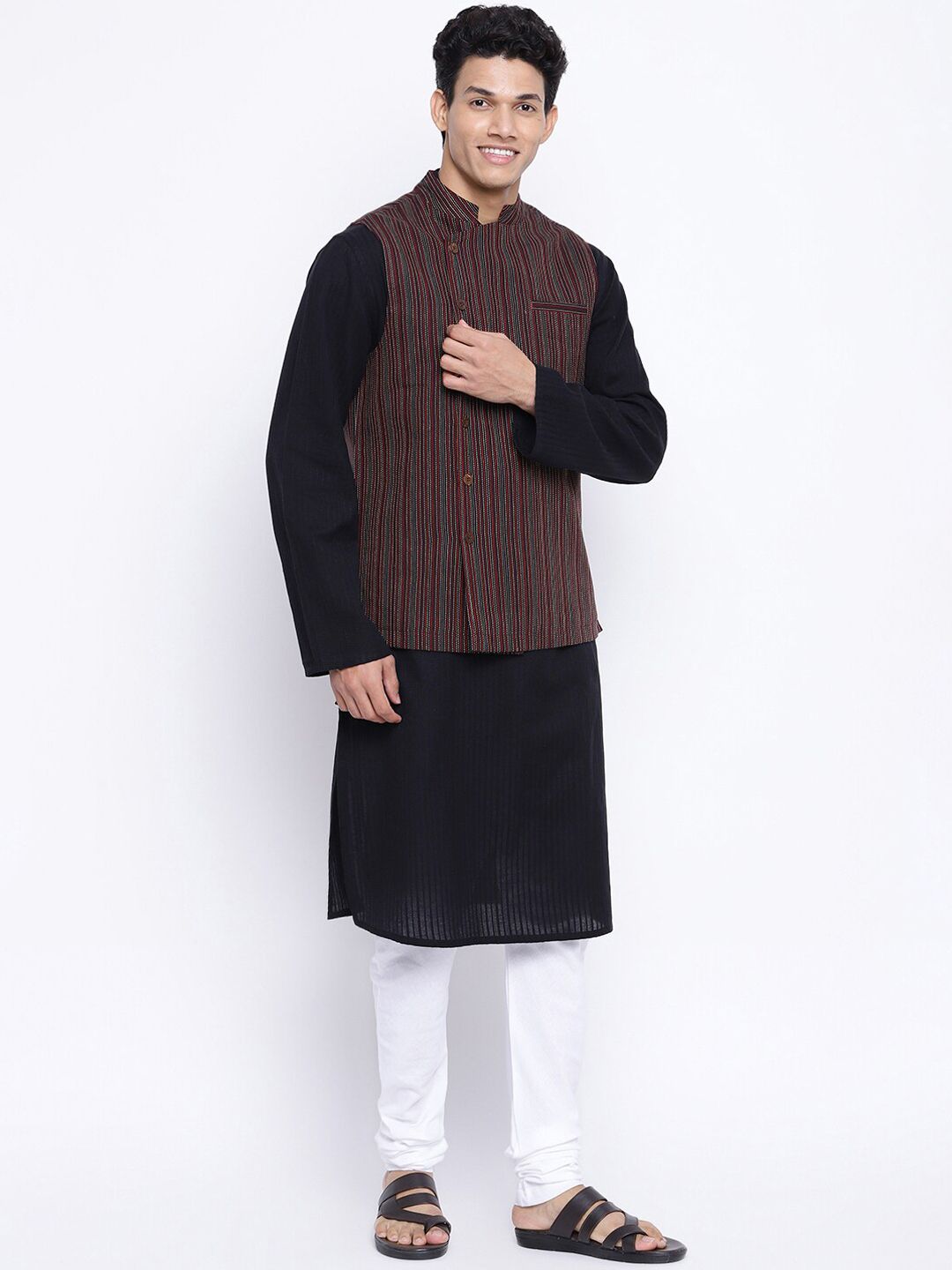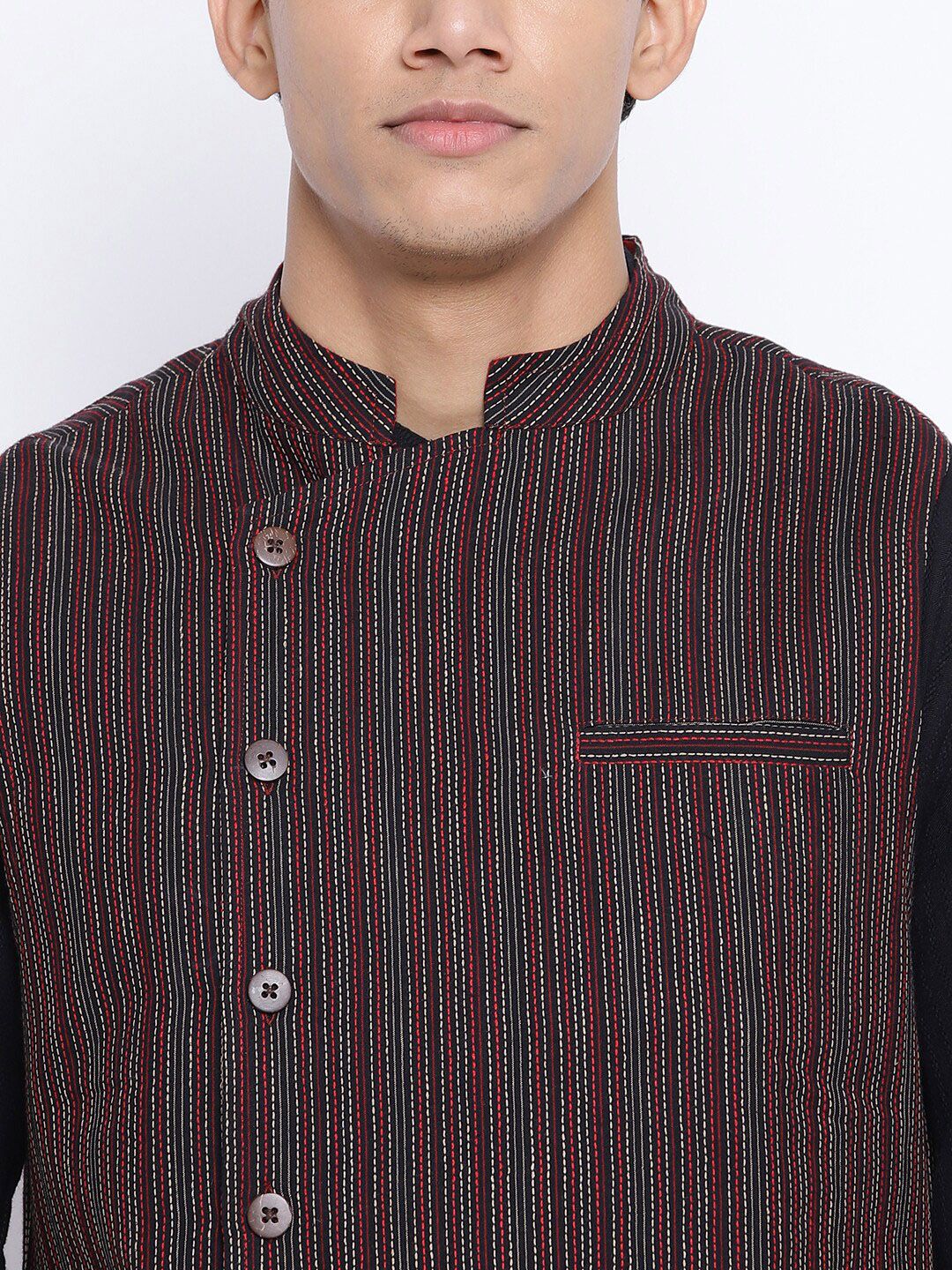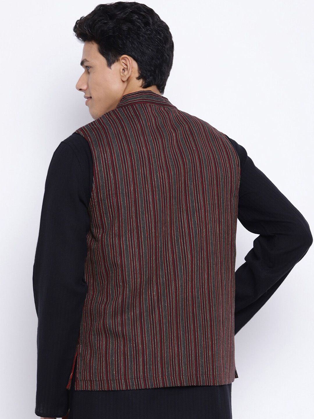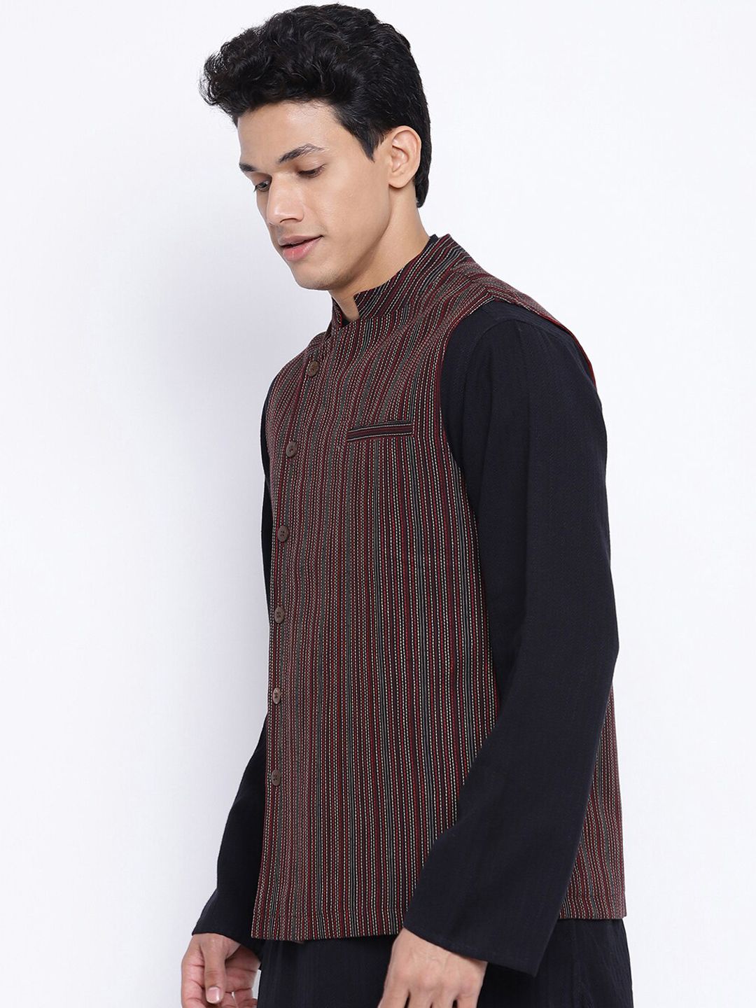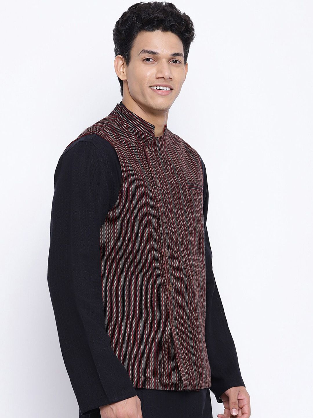 Black woven-design nehru jacket has a mandarin collar, sleeveless, has a full button placket and 3 pockets