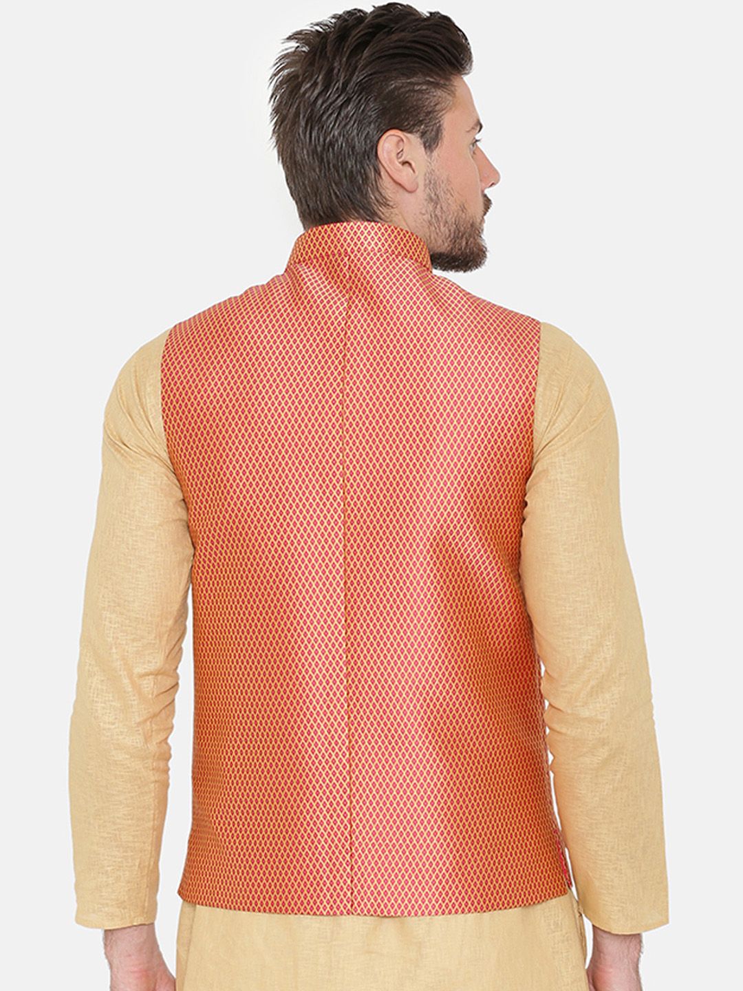 Red printed nehru jacket, has a mandarin collar, a full button placket, sleeveless, three welt pockets