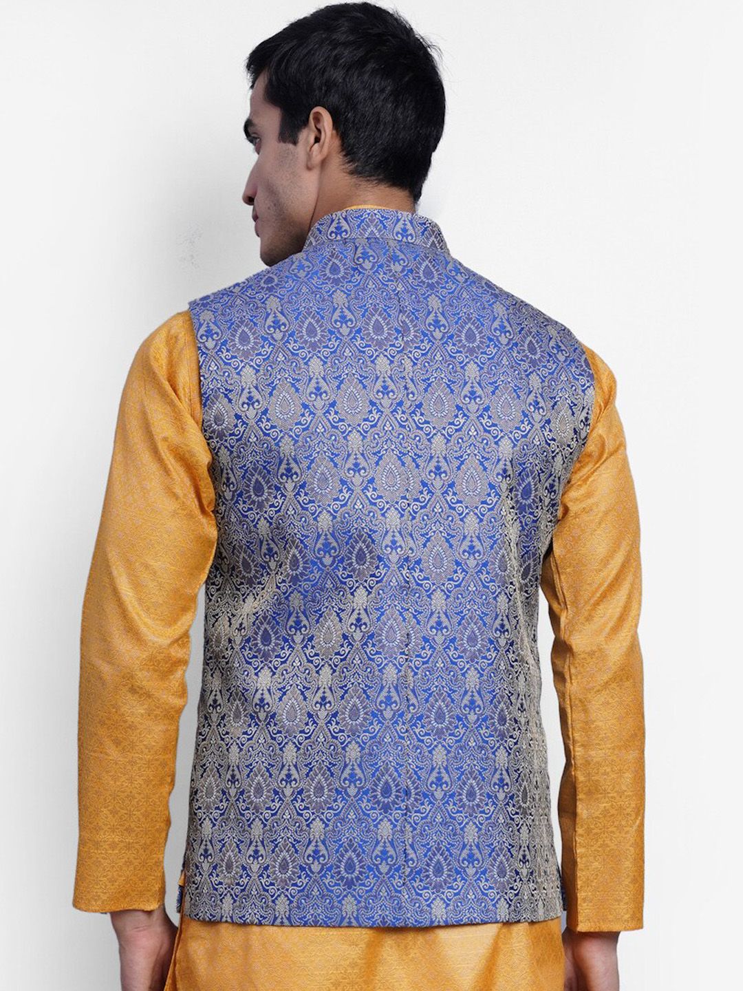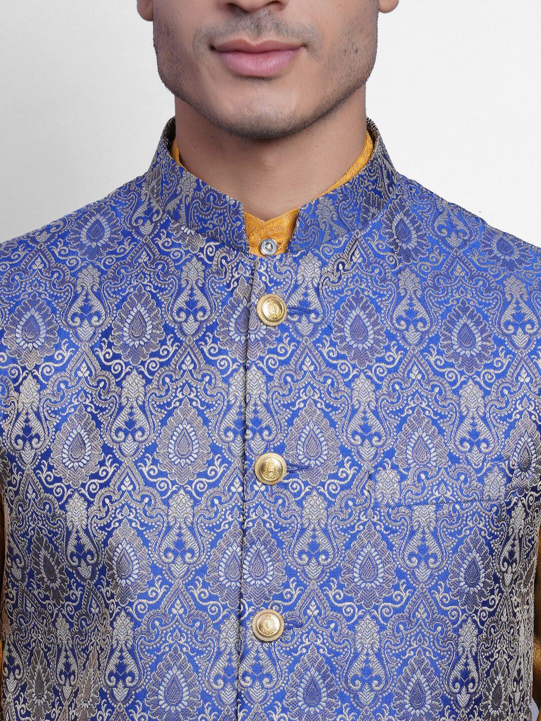 Blue and off-white woven-design nehru jacket, has a mandarin collar, sleeveless, a full button placket, three pockets, side slits