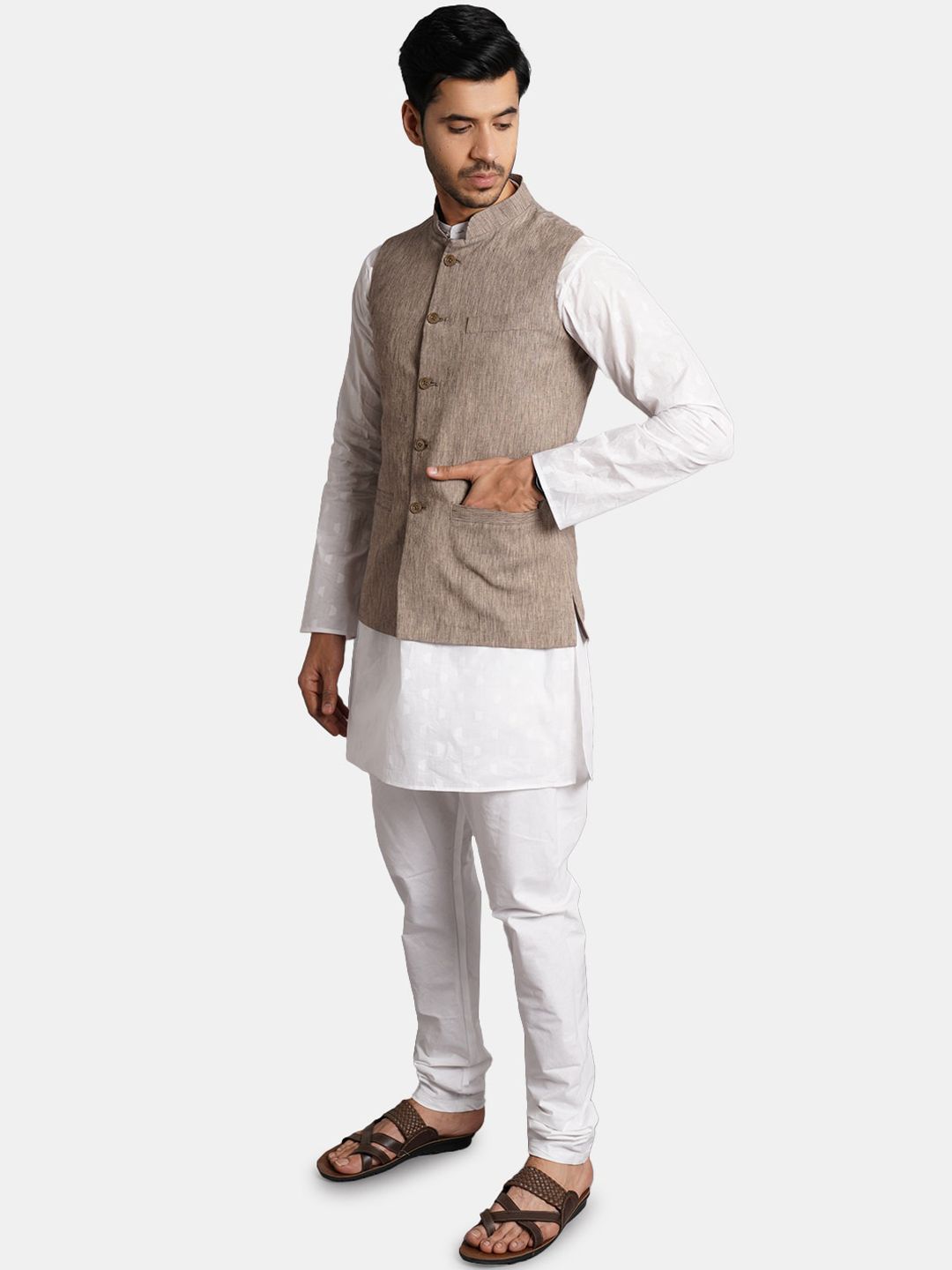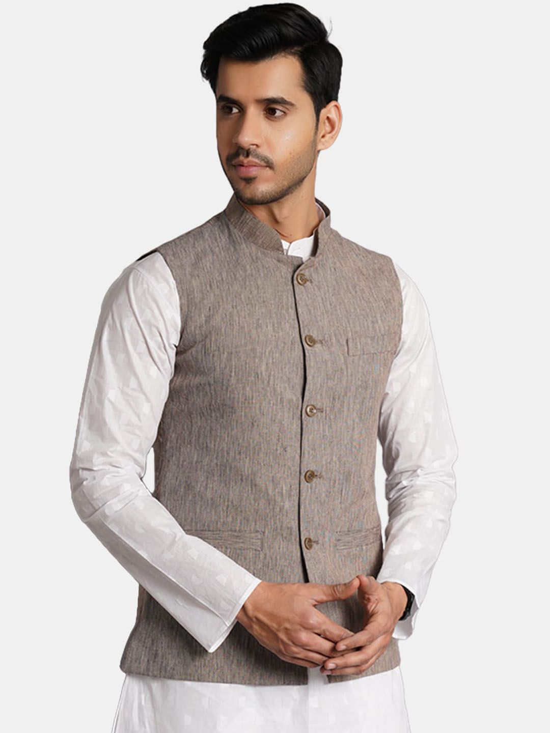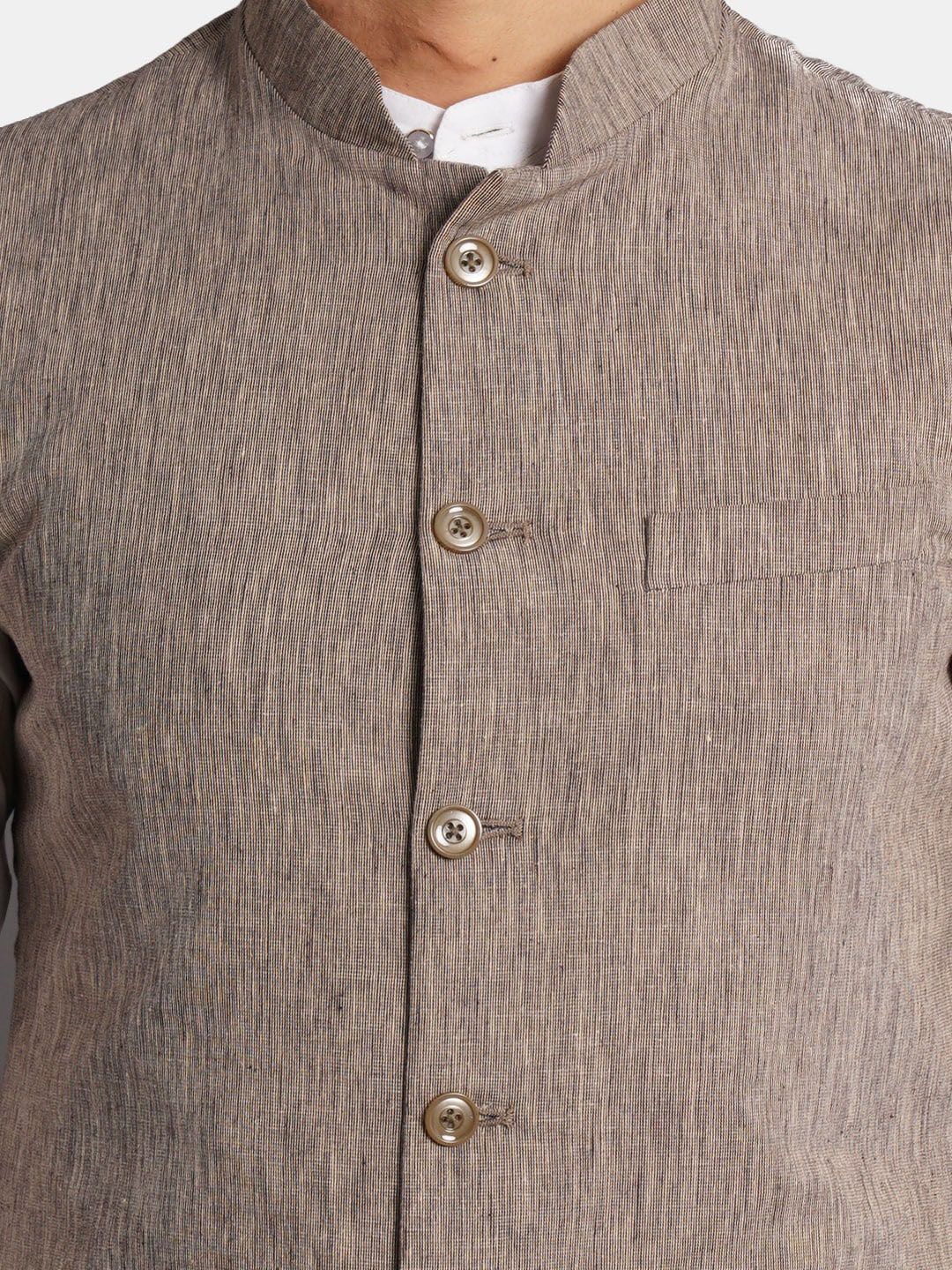 Brown solid woven Nehru jacket, has a mandarin collar, sleeveless, a full button placket, sleeveless, three pockets