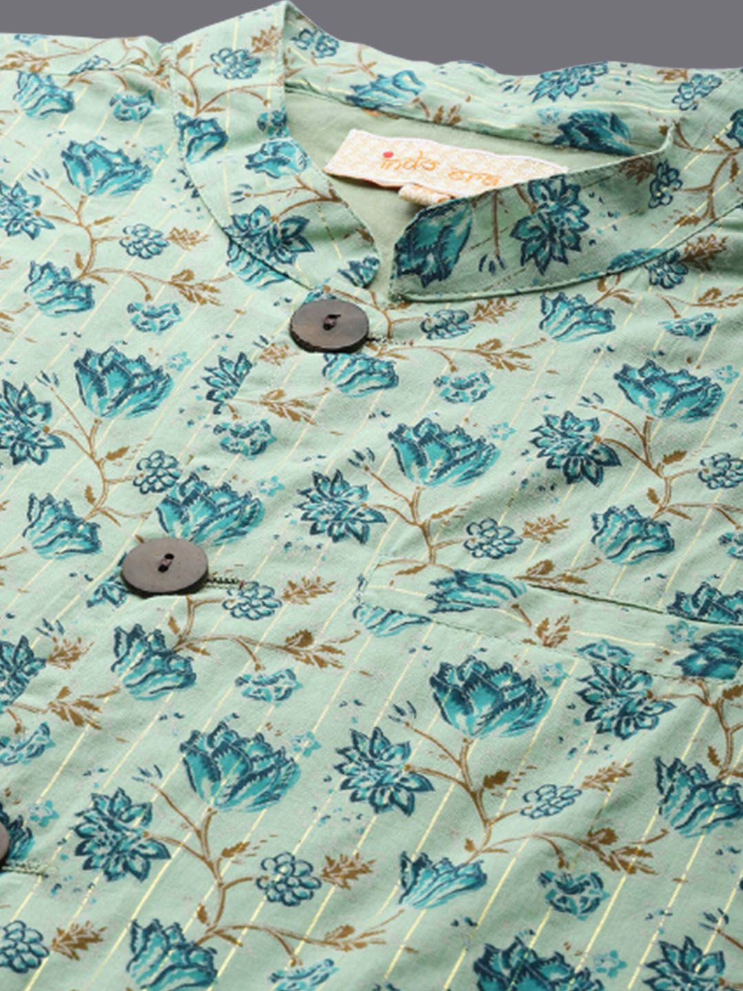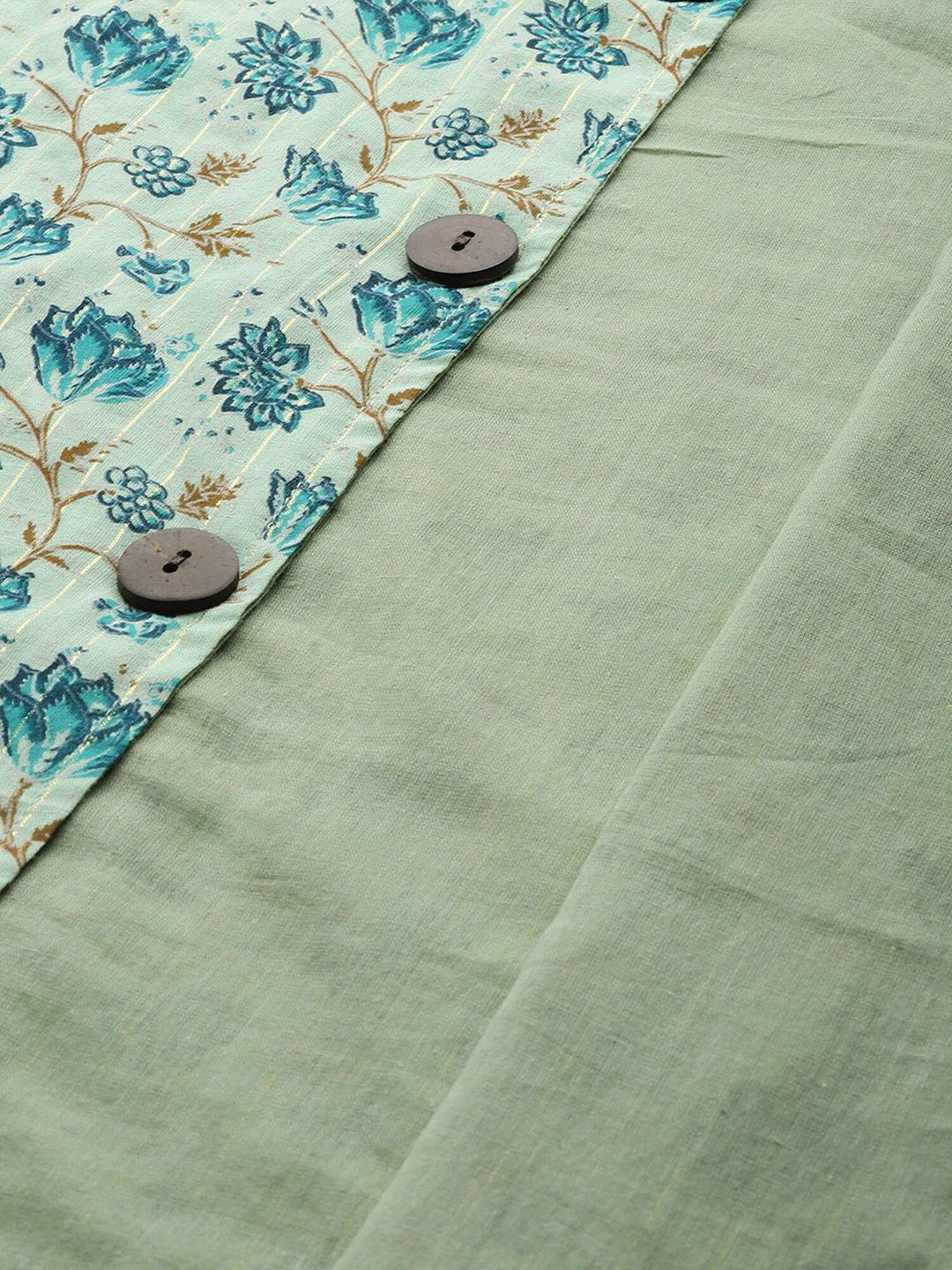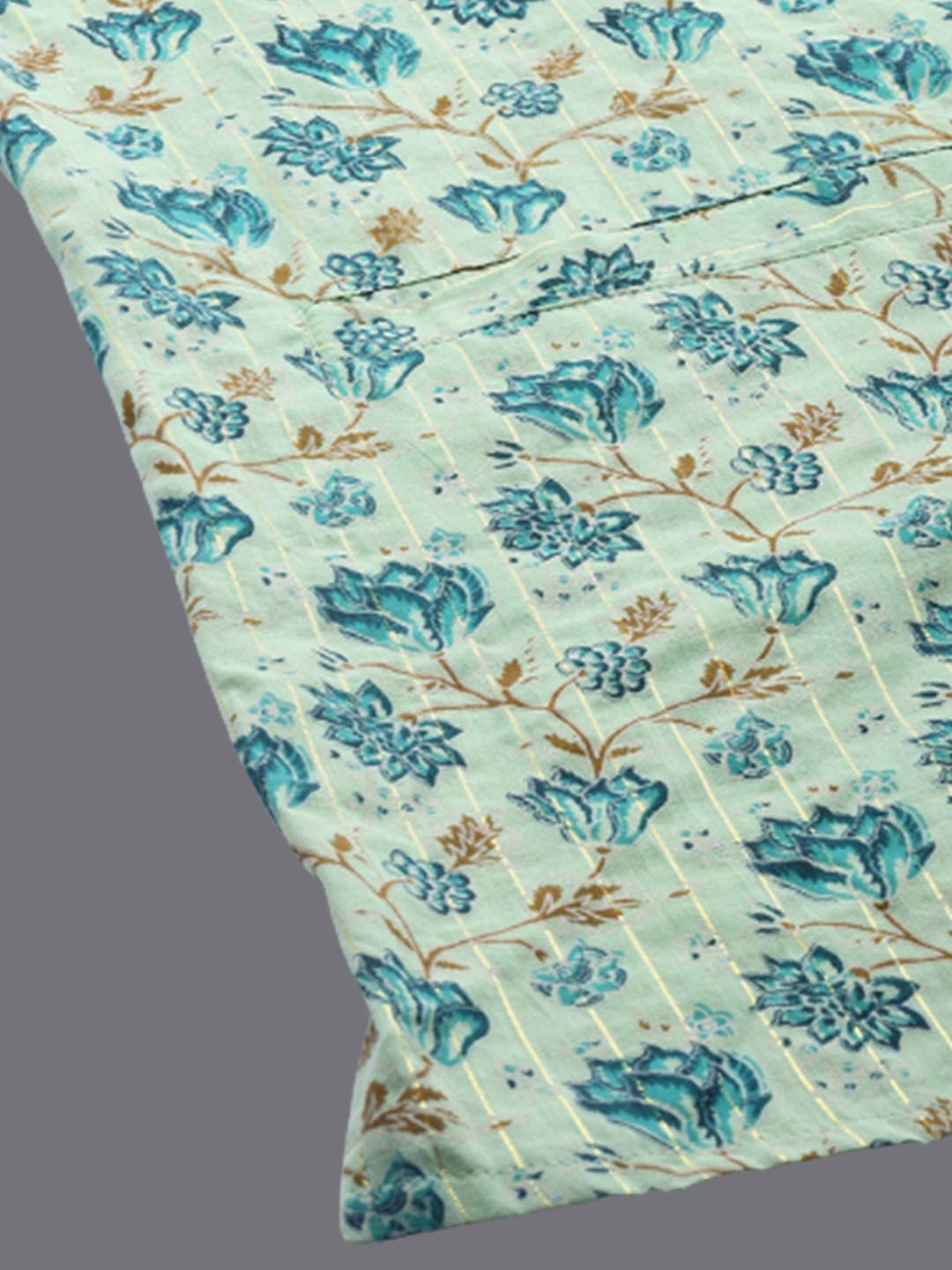Sea green printed woven nehru jacket, has a mandarin collar, sleeveless, a full button placket, three pockets