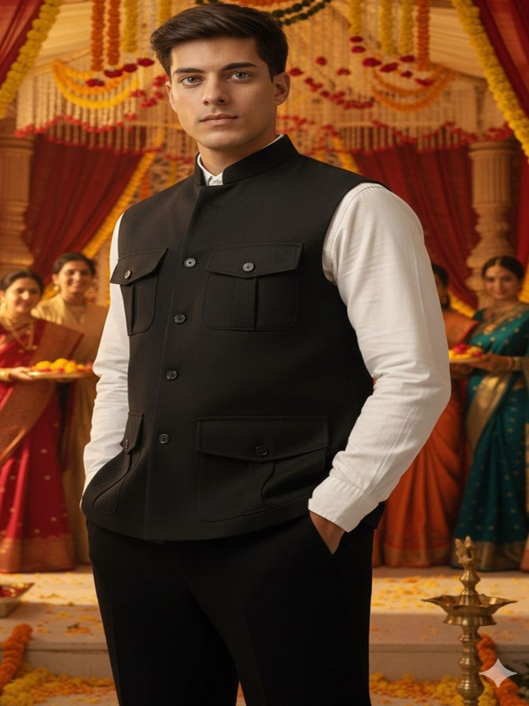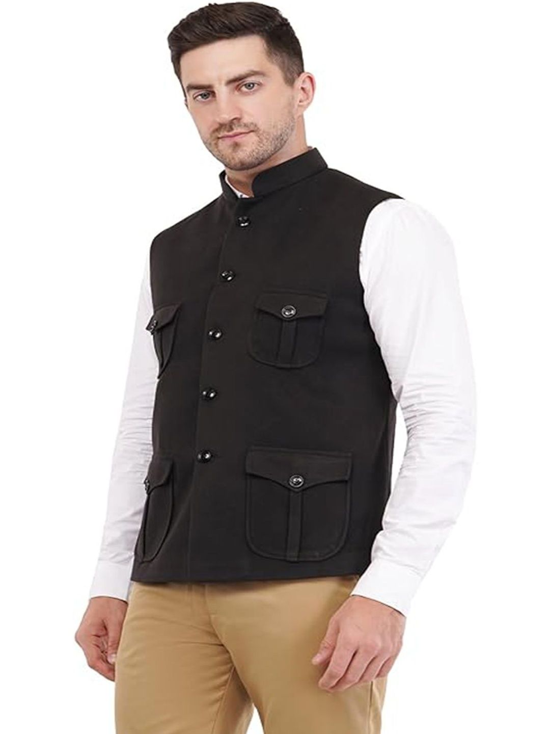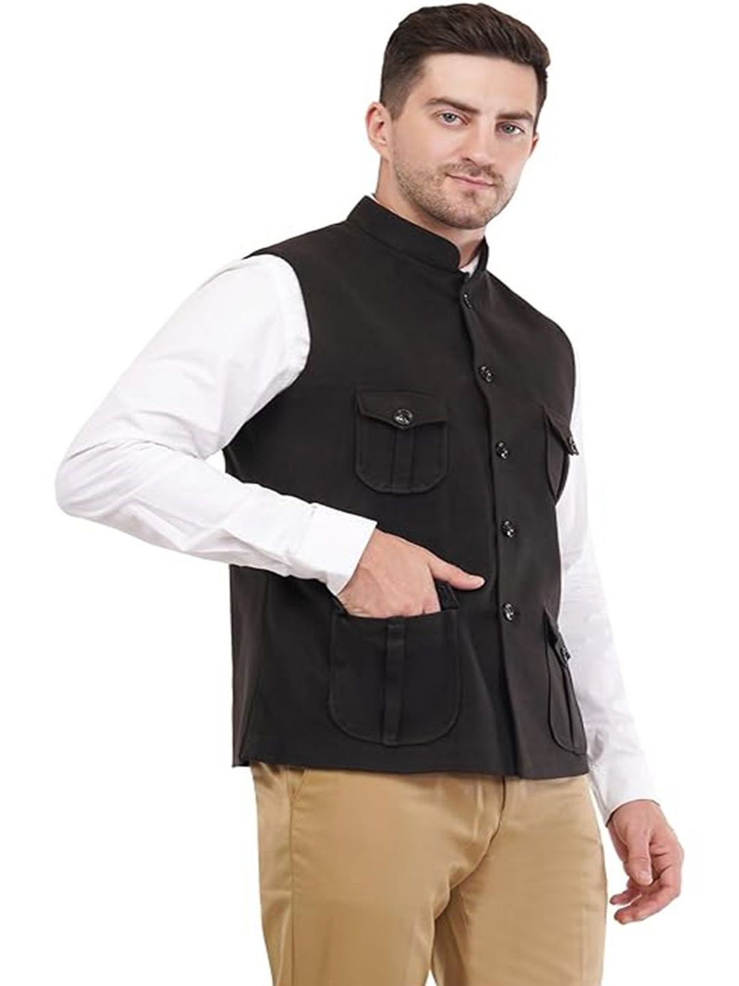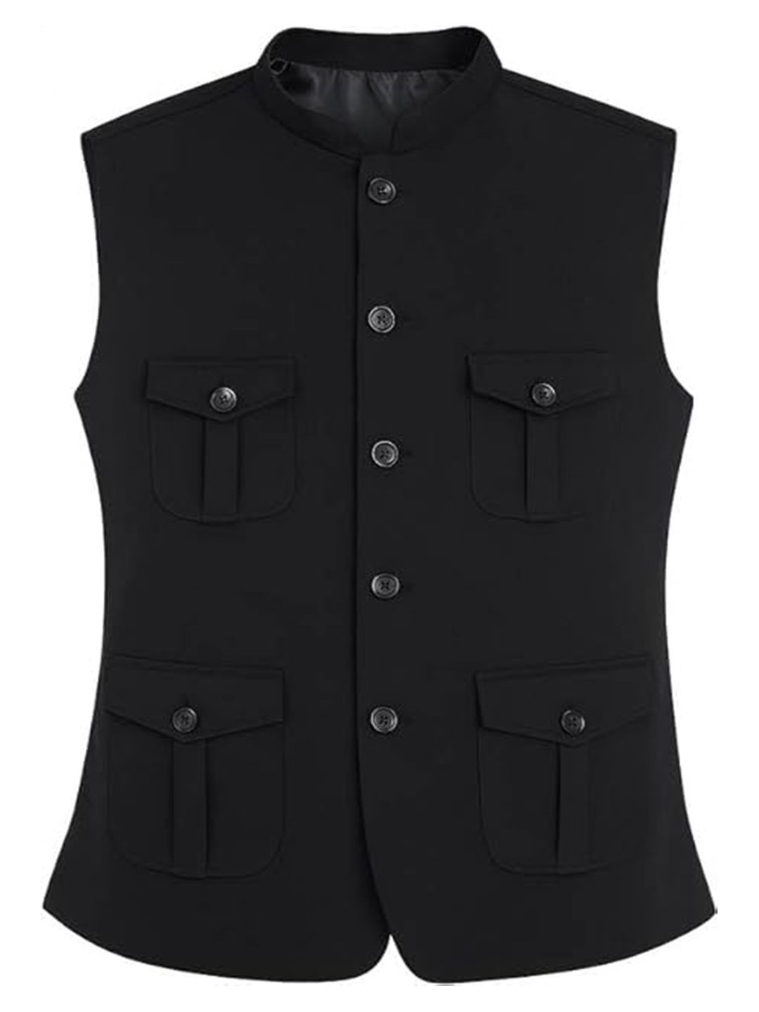 Blac solid woven Nehru jacket, has a mandarin collar, a full button placket, sleeveless, four pocketsDisclaimerDoes not come with pocket squareNo accessories