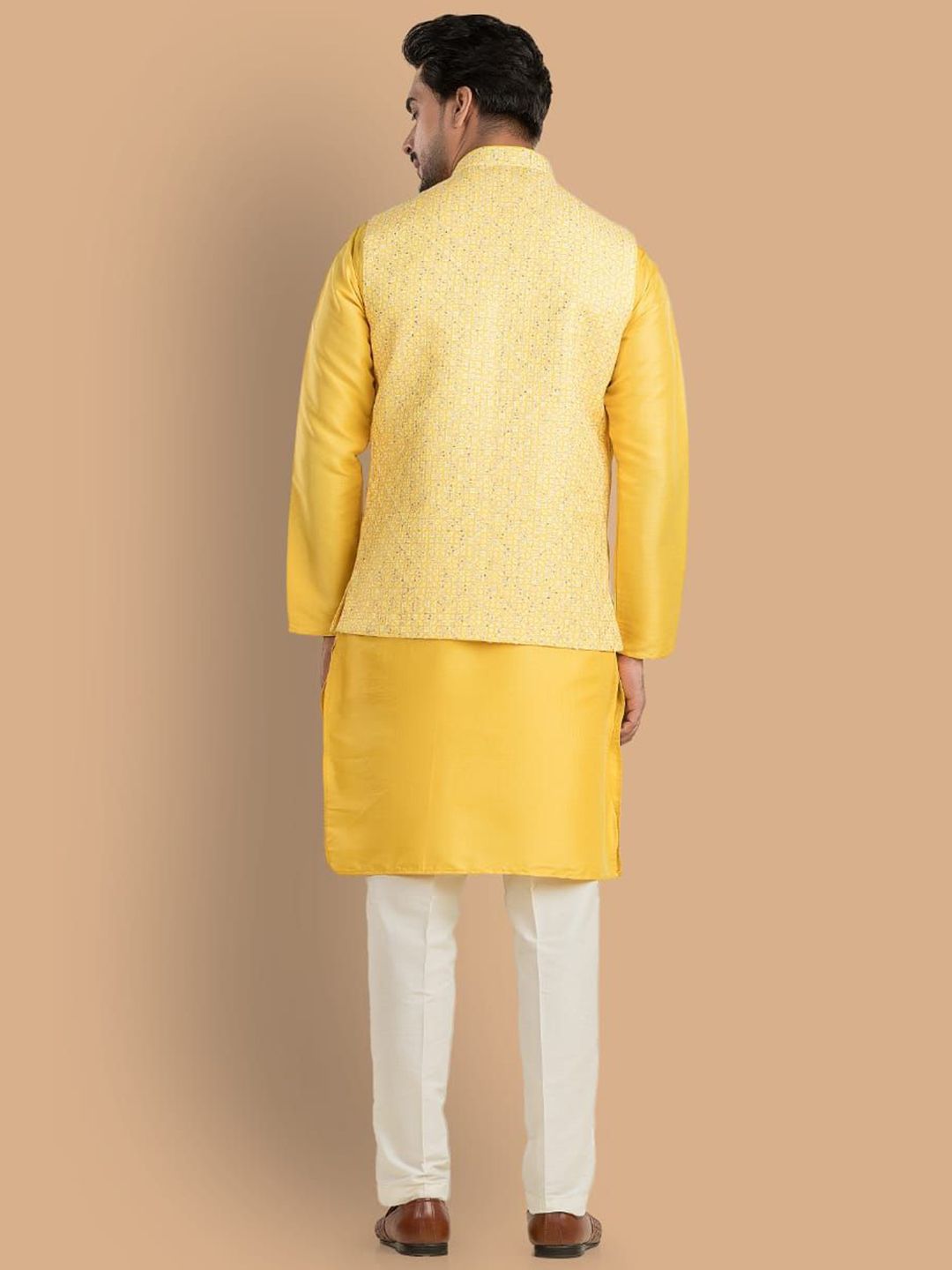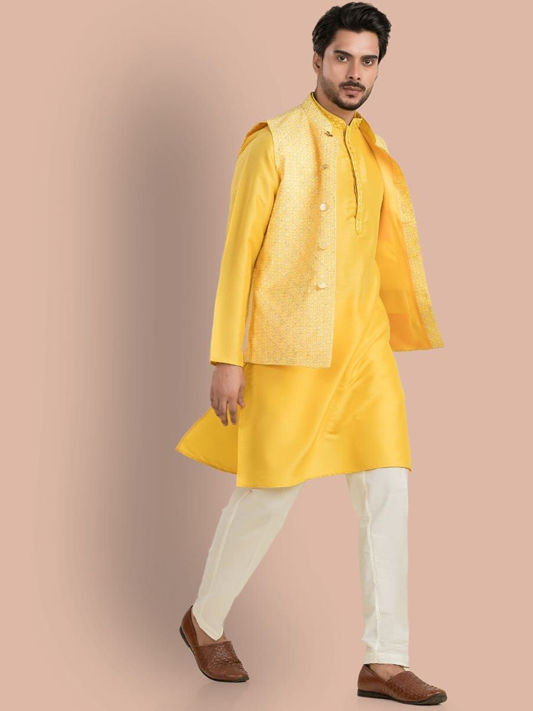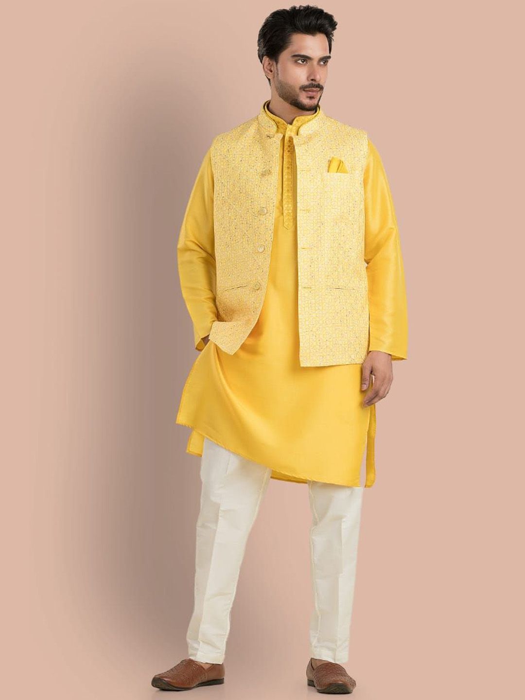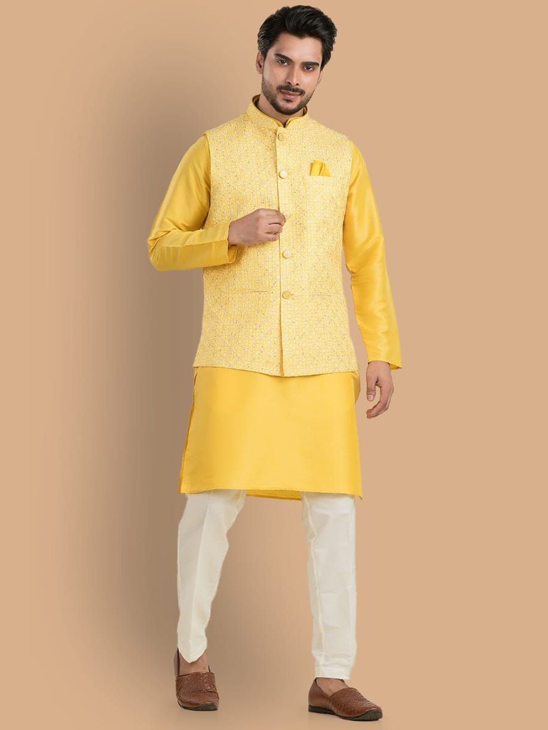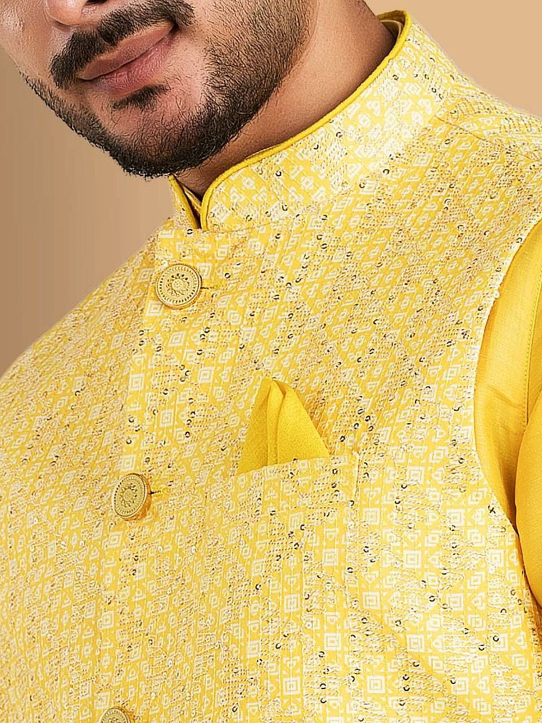 Yellow zari printed Nehru jacket, has a mandarin collar, a full button placket, sleeveless, three pocketsDisclaimer Does not come with pocket squareNo accessories