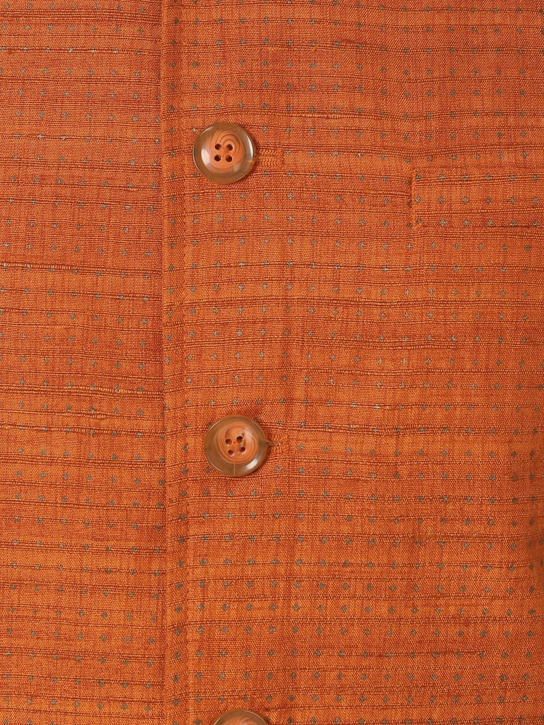 Orange and gold-coloured printed woven nehru jacket, has a mock collar, sleeveless, front button closures and 3 pockets