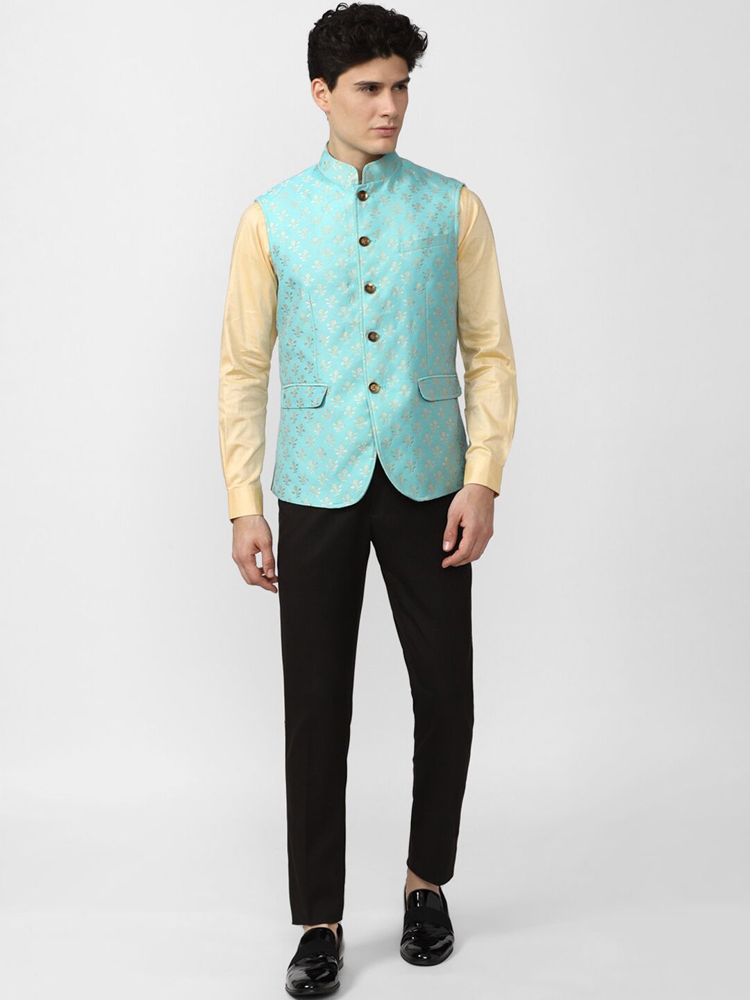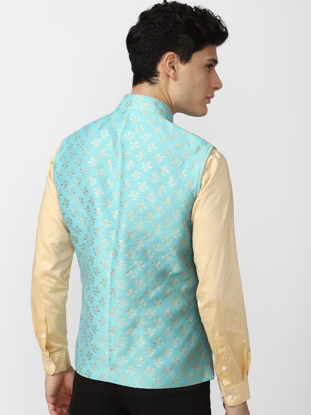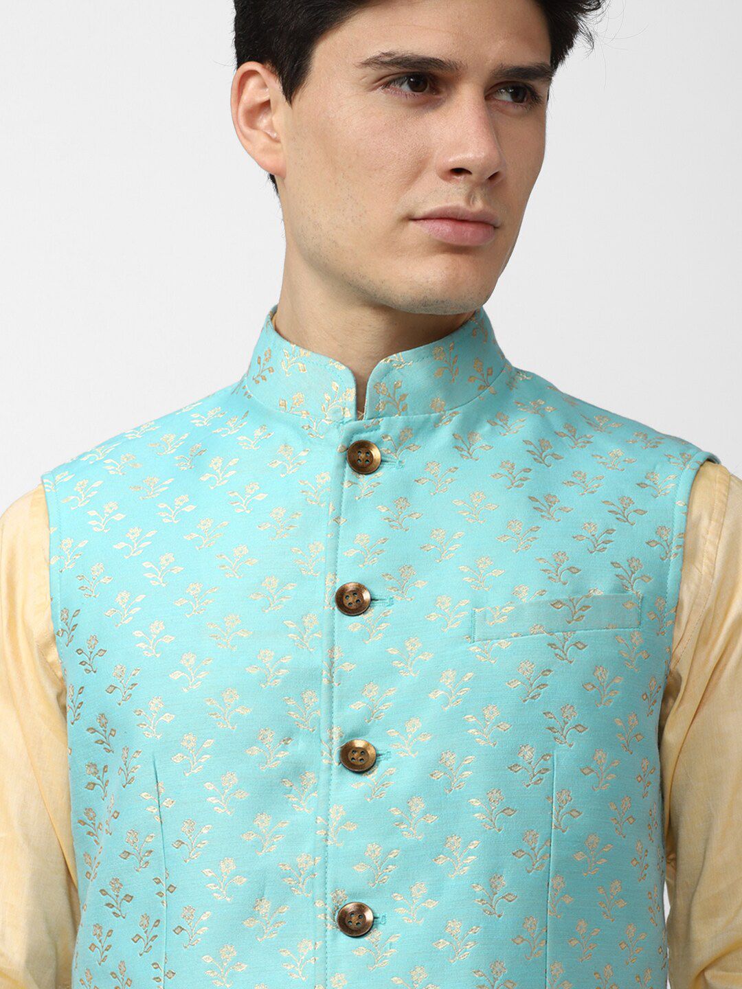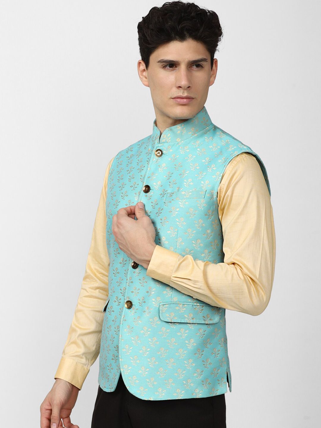 Blue and gold-coloured woven design nehru jacket, has a mandarin collar, a button closure, sleeveless, side slits and three pockets