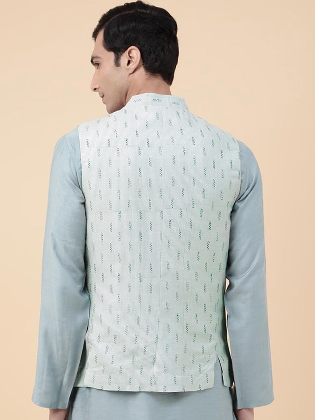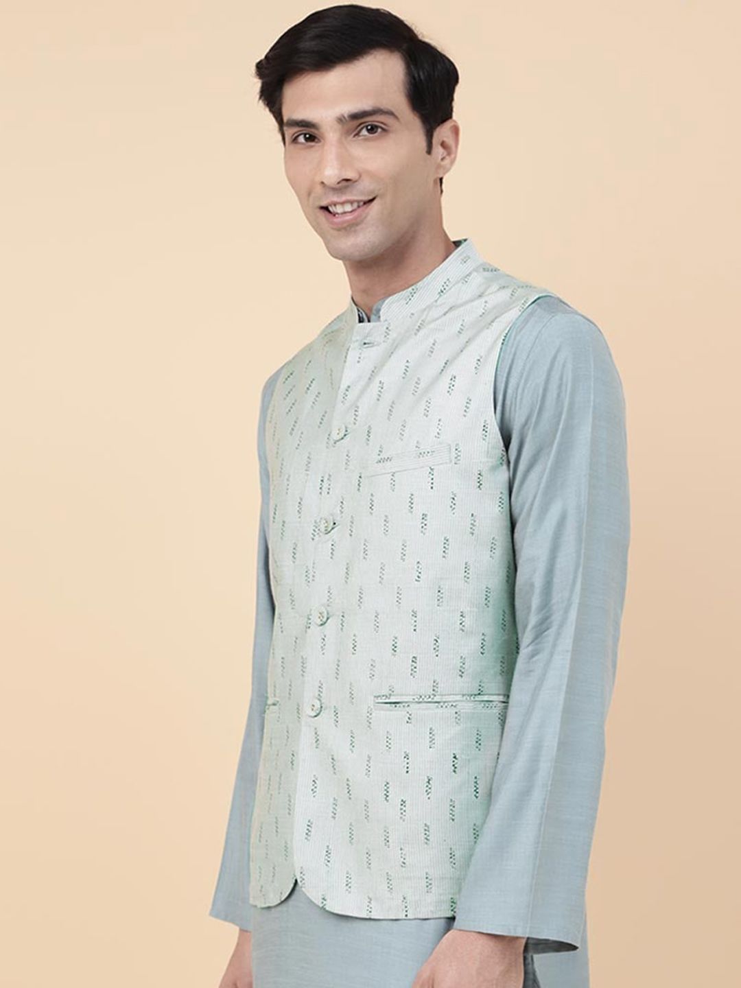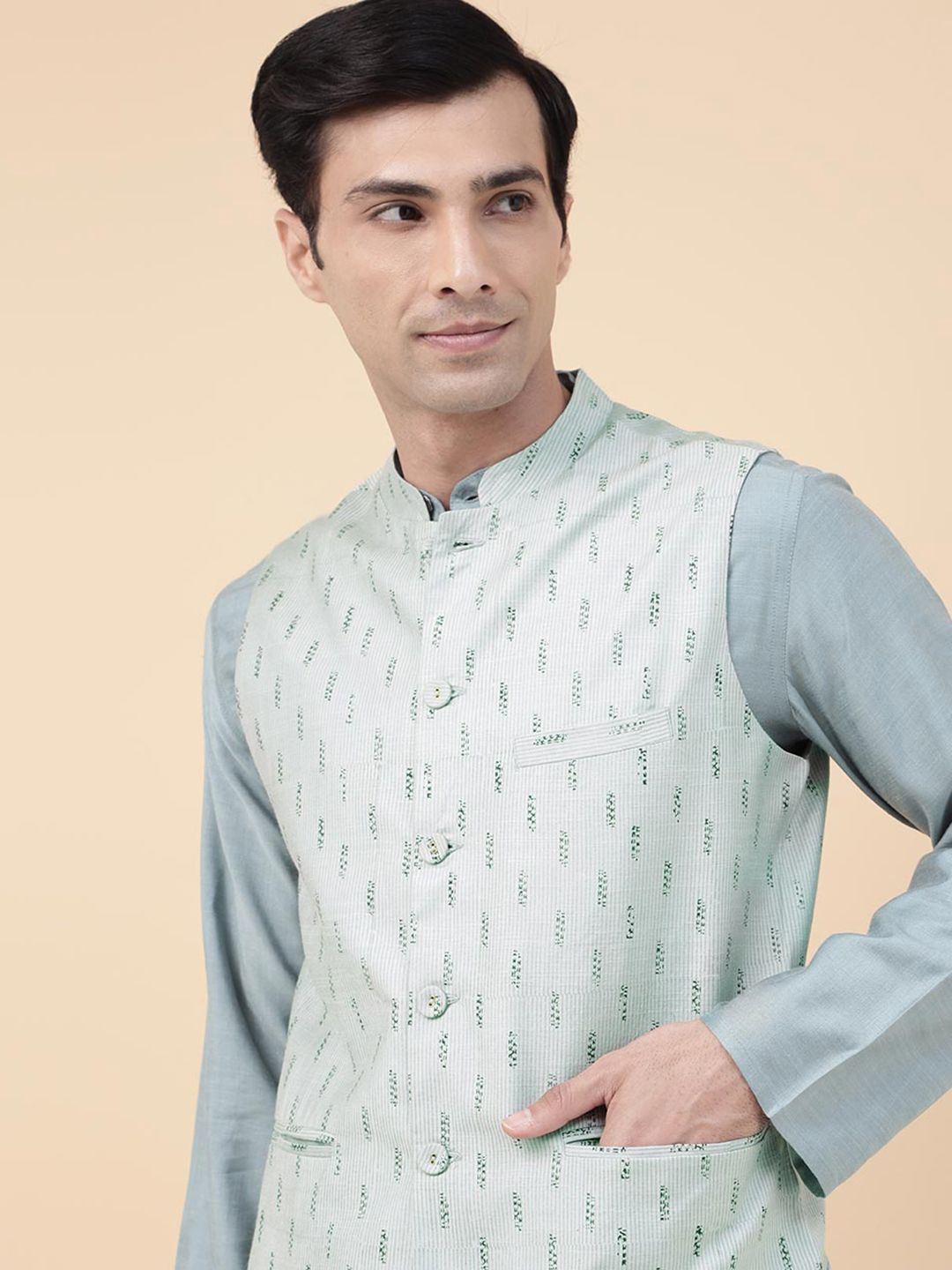 Sage printed woven Nehru jacket, has a mandarin collar, a full button placket, sleeveless, three pocketsDisclaimerDoes not come with pocket squareNo accessories