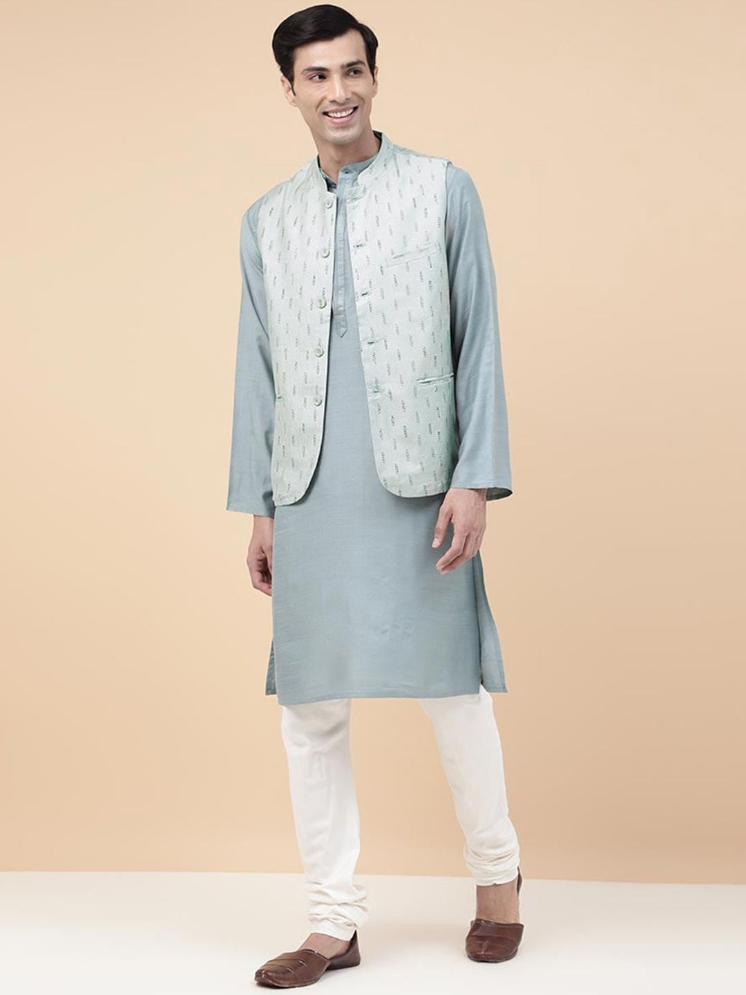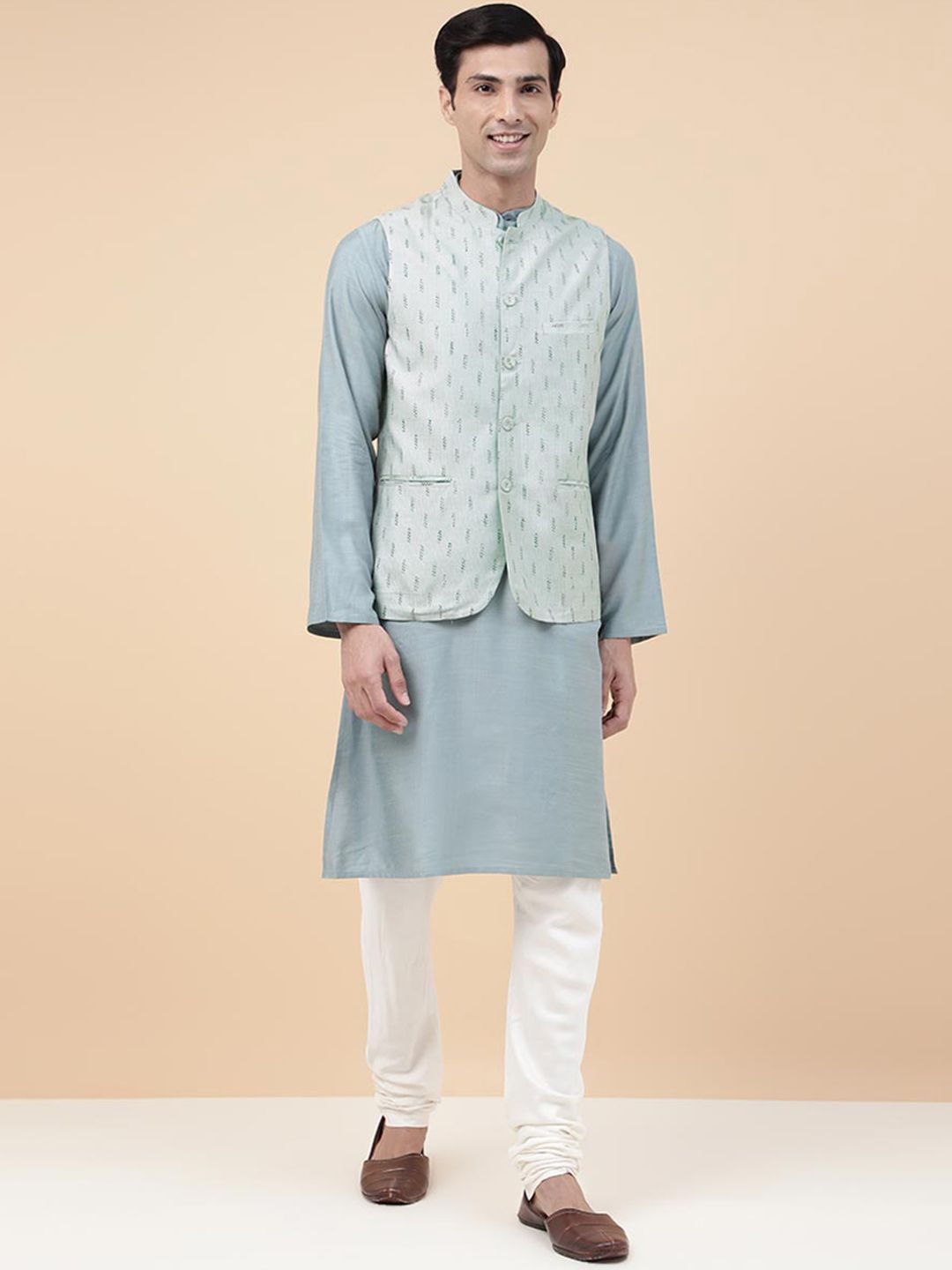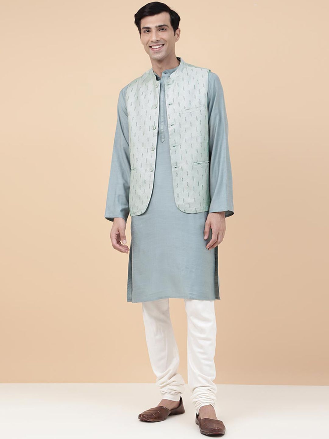 Sage printed woven Nehru jacket, has a mandarin collar, a full button placket, sleeveless, three pocketsDisclaimerDoes not come with pocket squareNo accessories