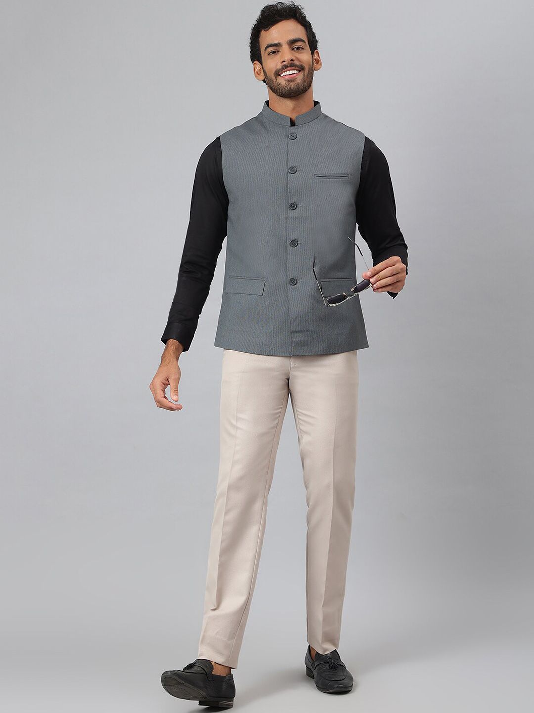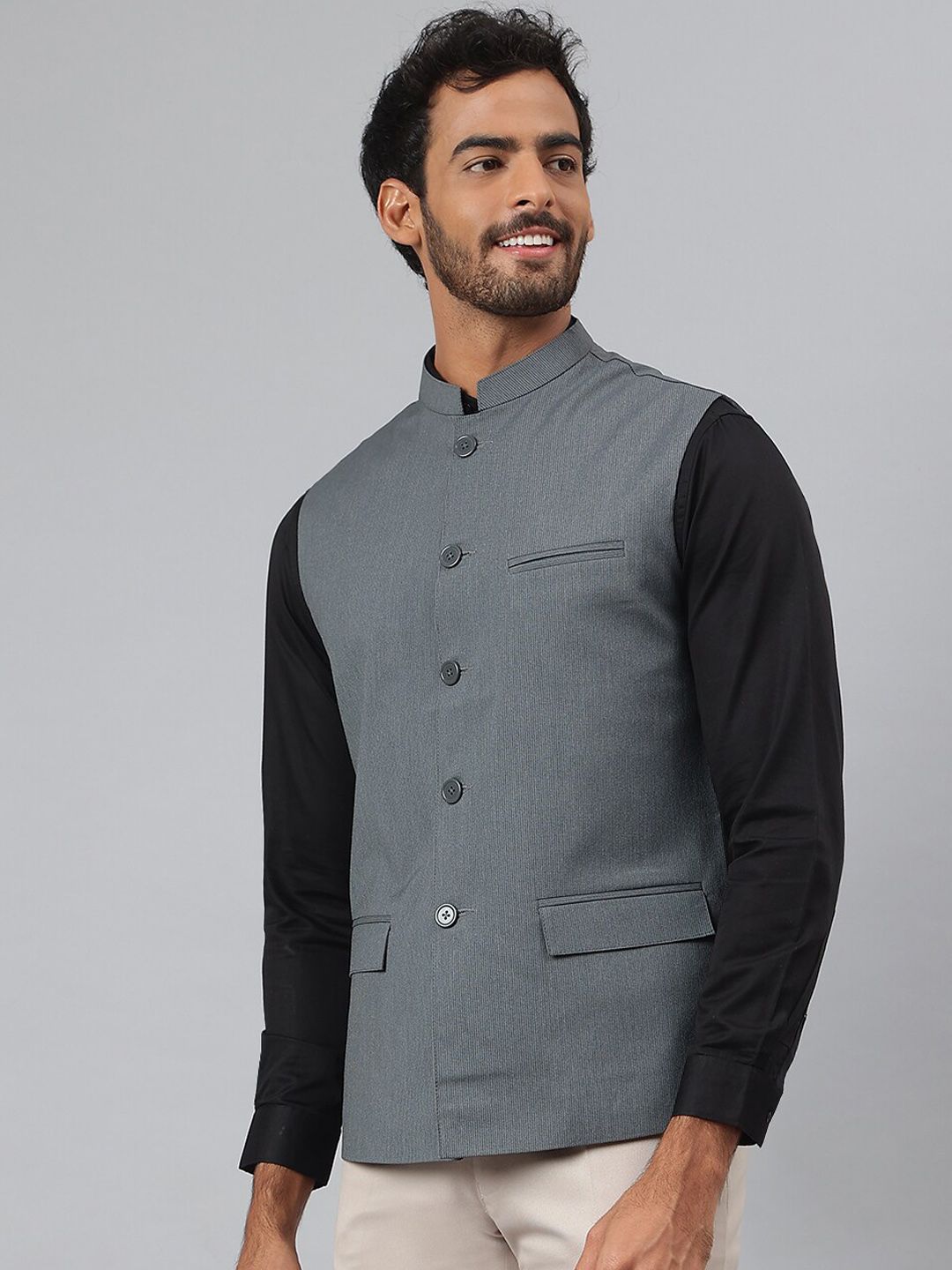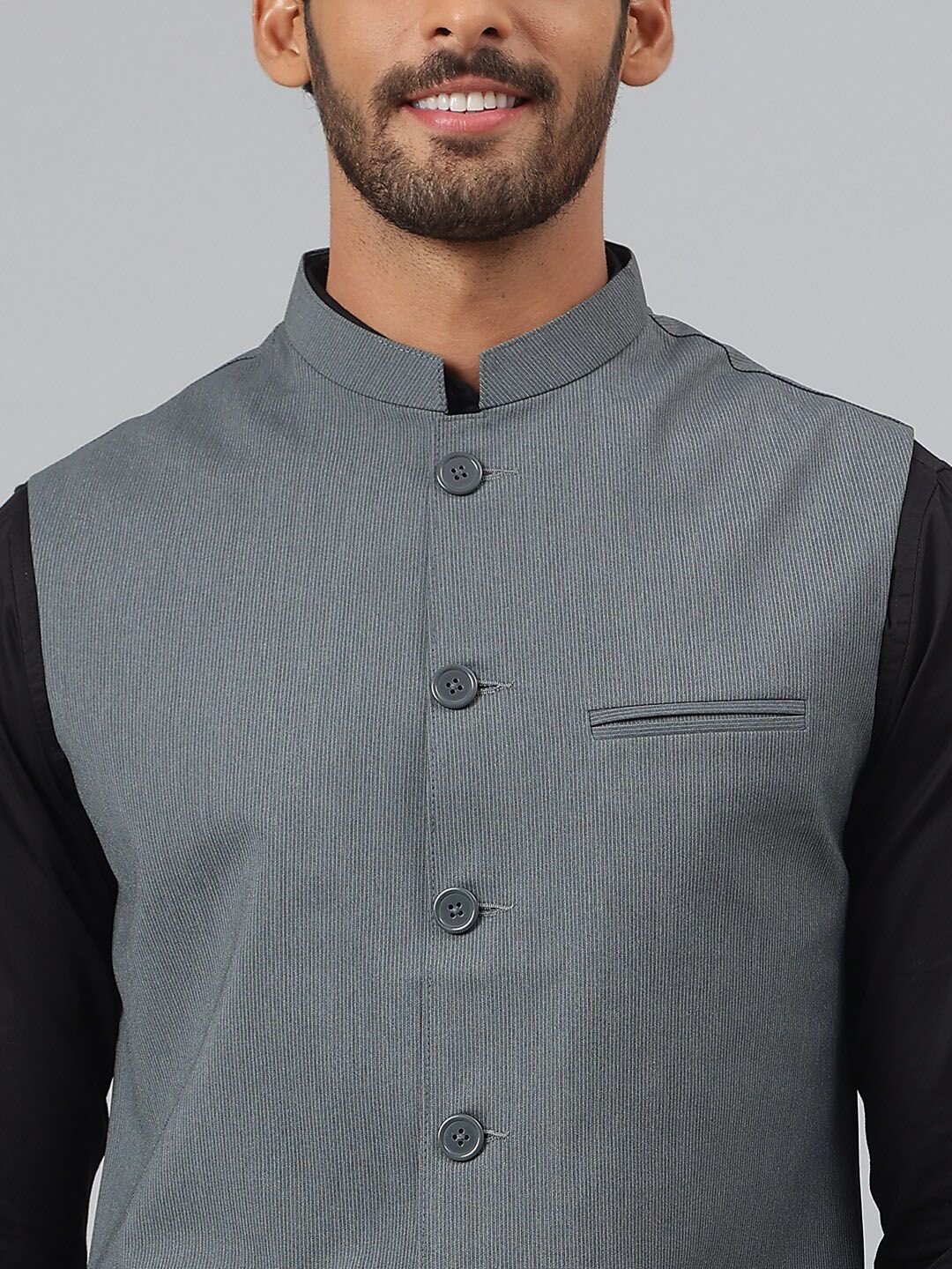 Grey striped woven nehru jacket, has a mandarin collar, a full button placket, sleeveless, and three pockets