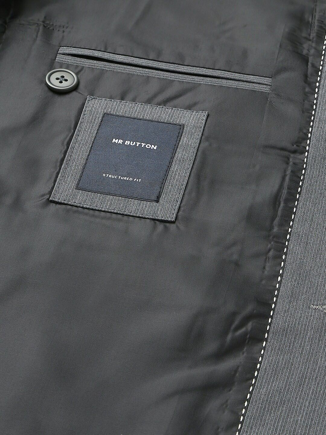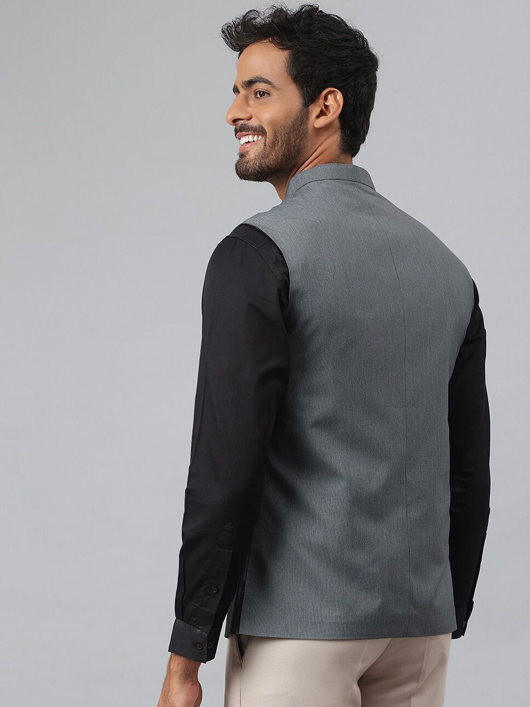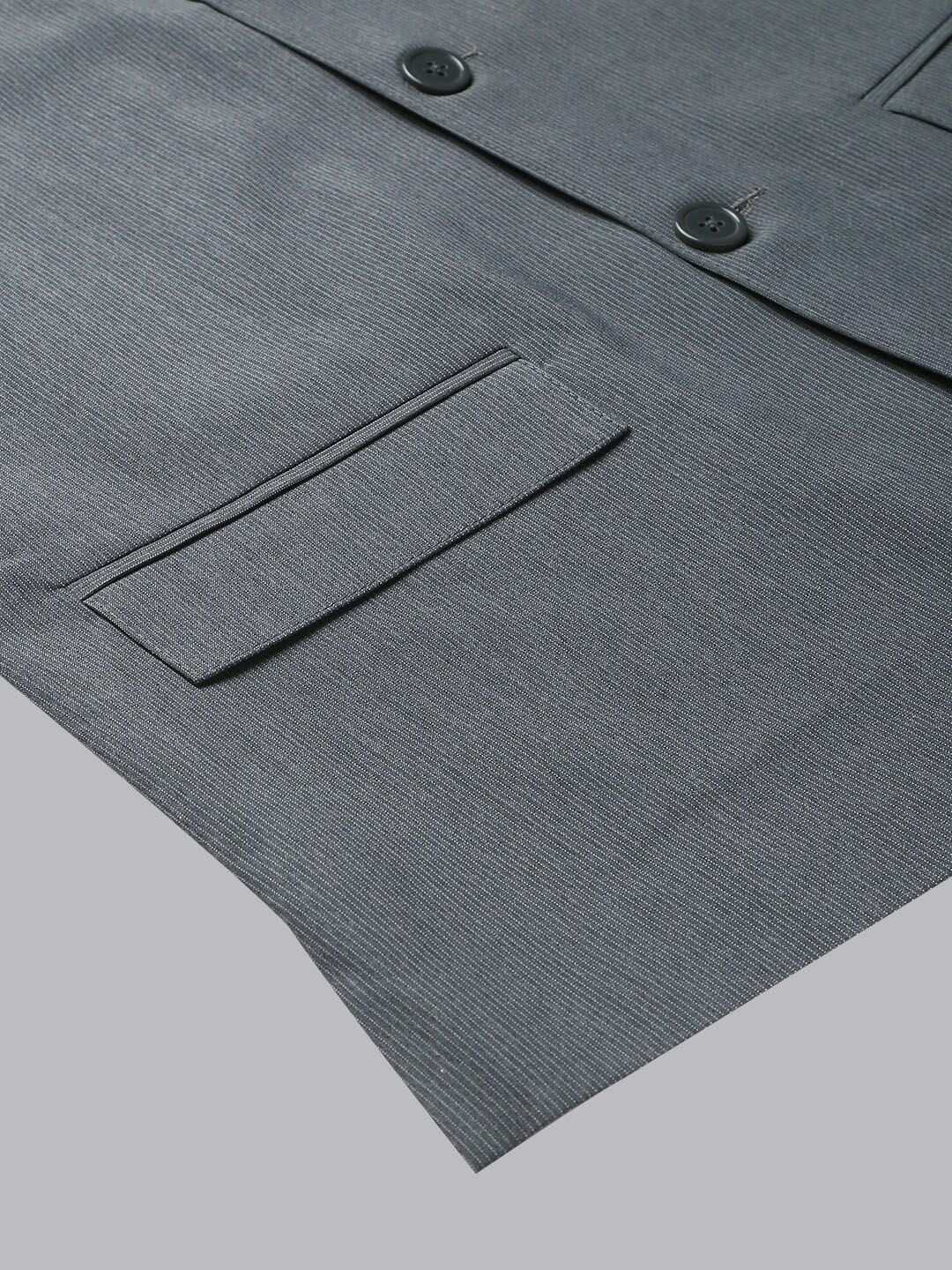 Grey striped woven nehru jacket, has a mandarin collar, a full button placket, sleeveless, and three pockets