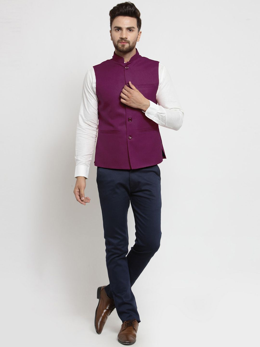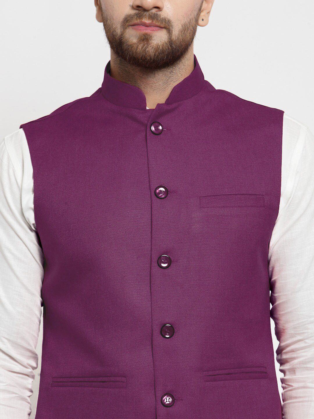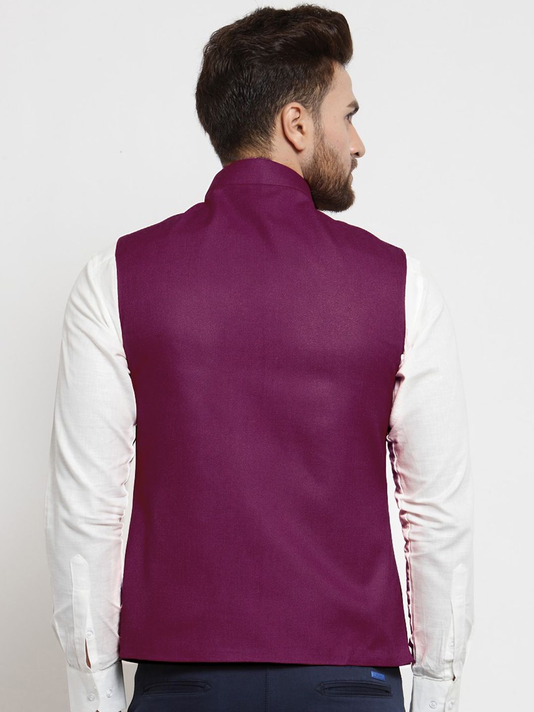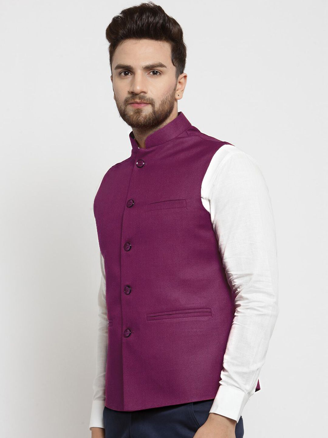 Purple solid woven nehru jacket, has a mandarin collar, a full-front button placket, sleeveless, three welt pockets.