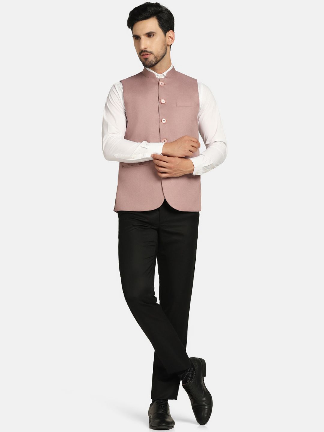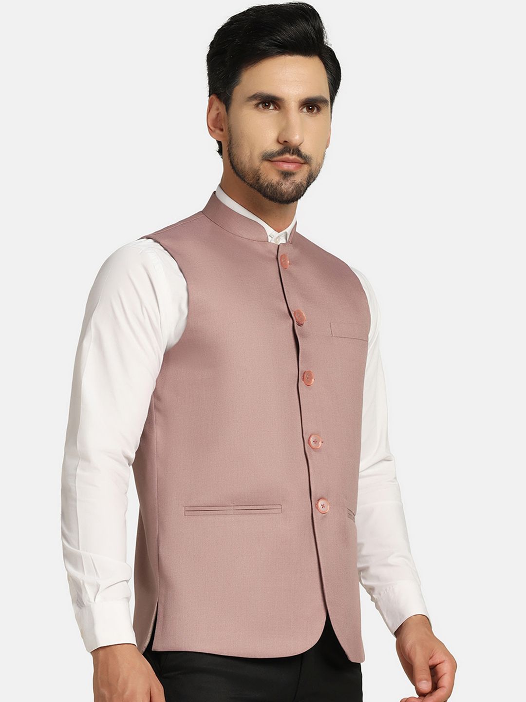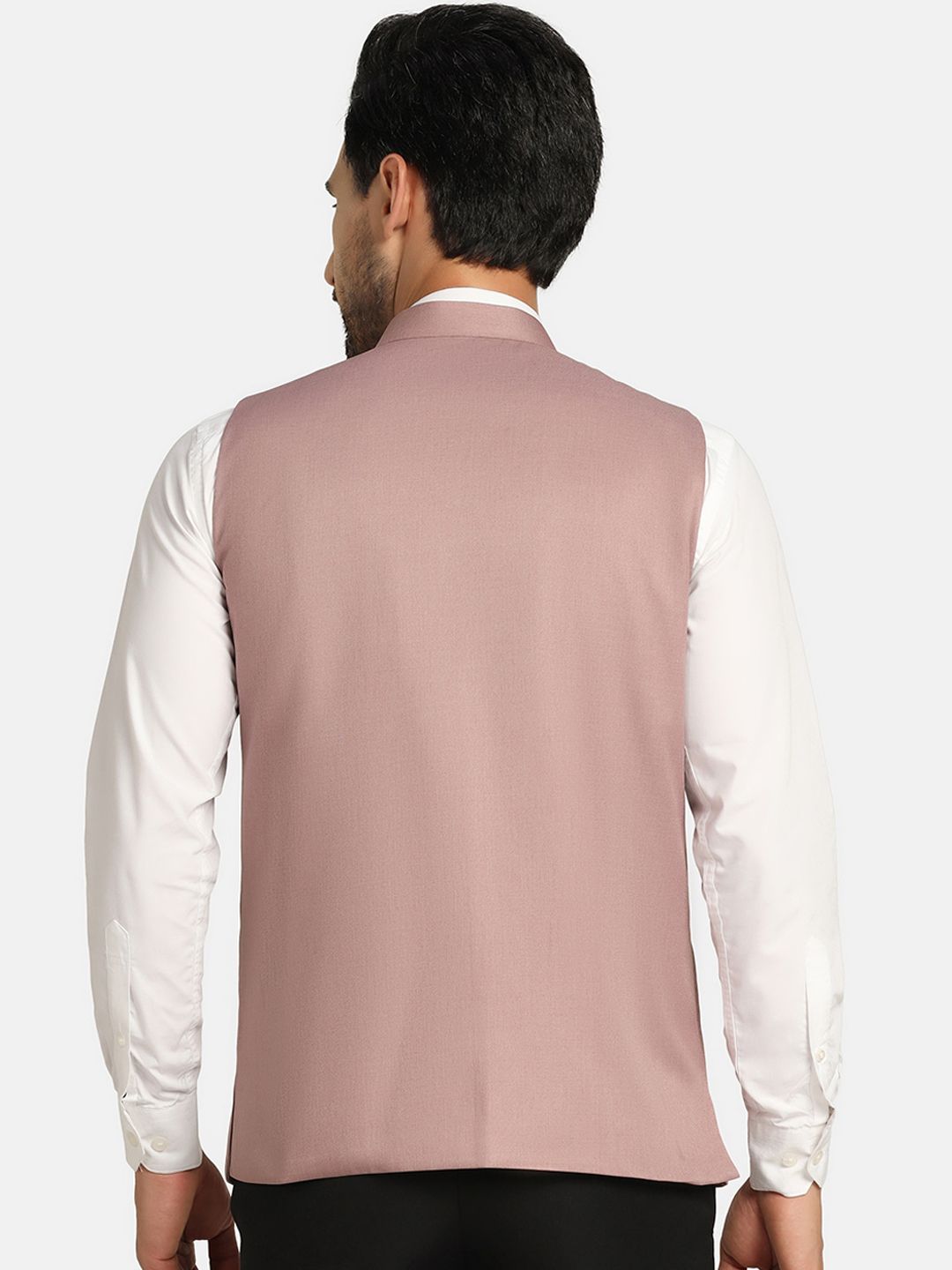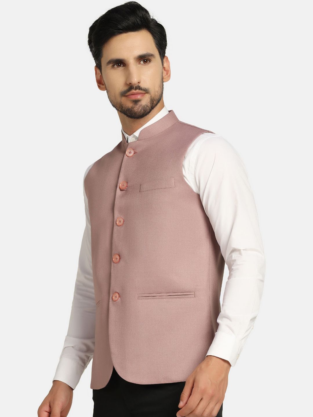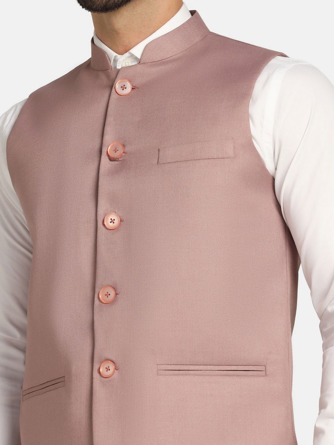 Pink solid Nehru jacket, has mandarin collar, sleeveless, straight hem, and three pockets