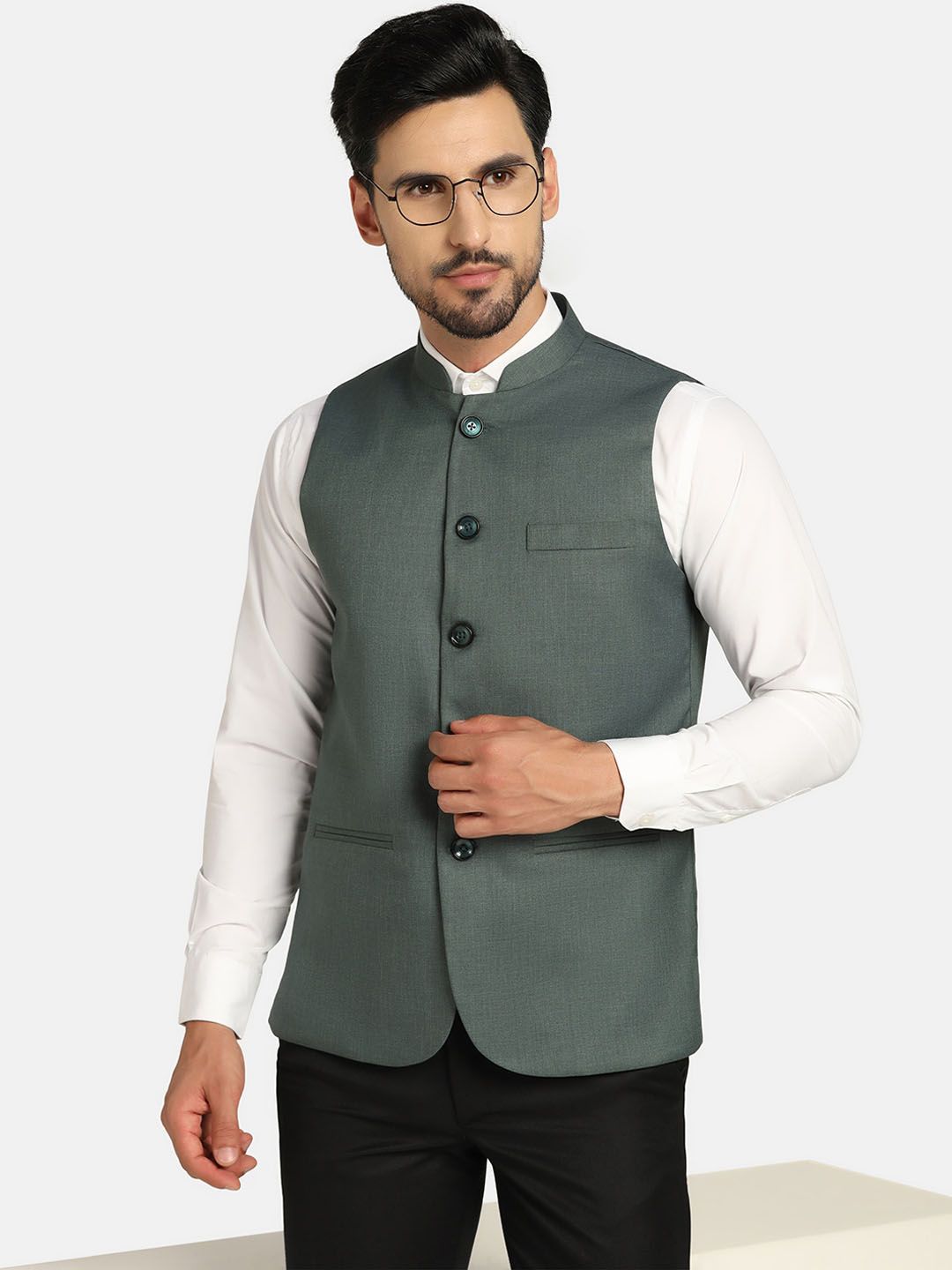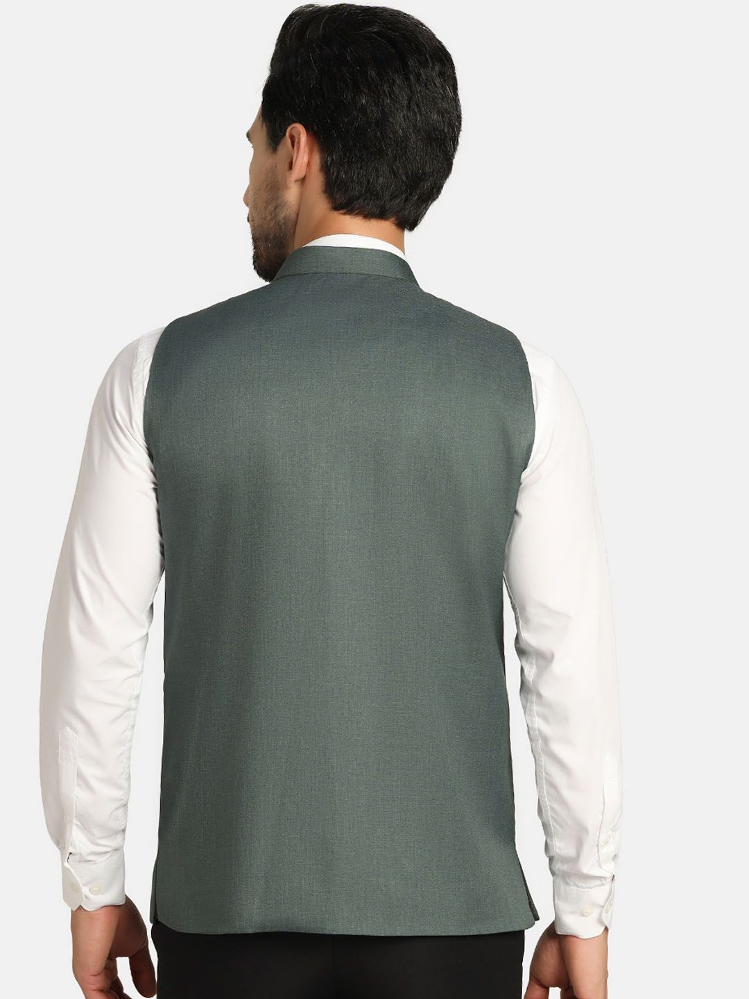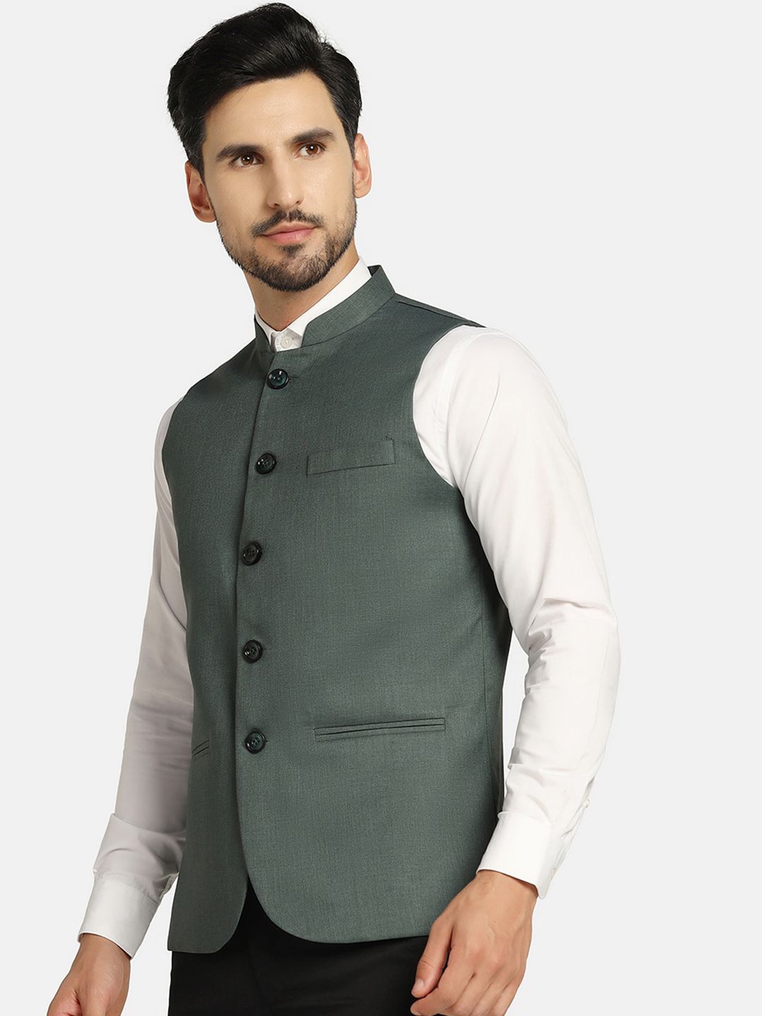 Green solid nehru jacket, has a mandarin collar, a full button placket, sleeveless, three pocketsDisclaimerDoes not come with pocket squareNo accessories