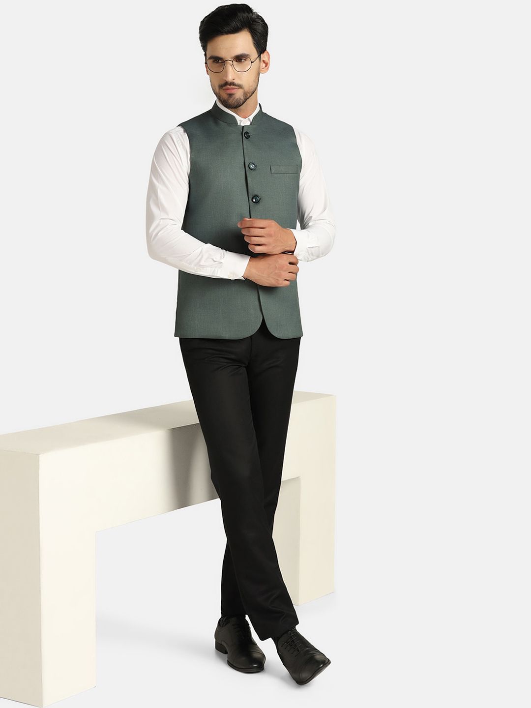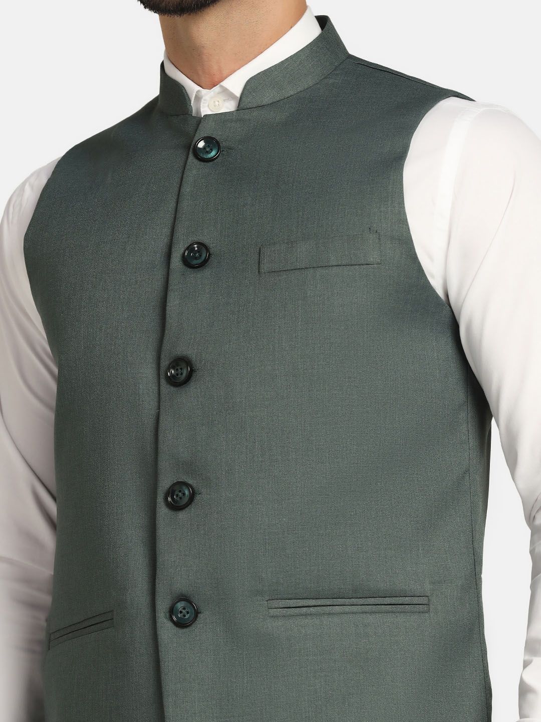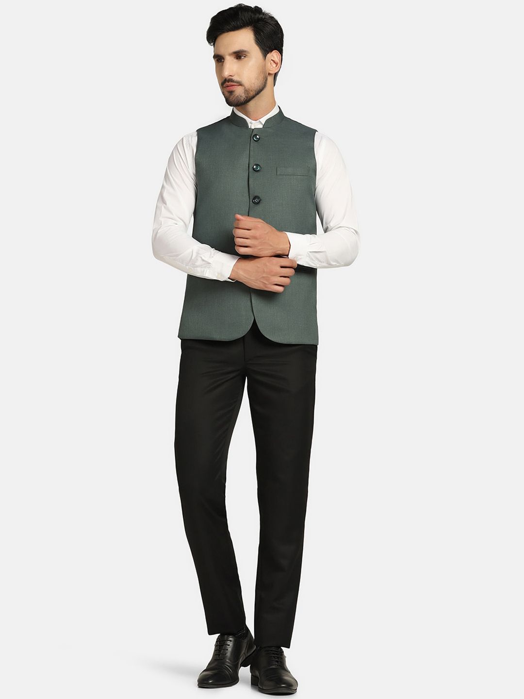 Green solid nehru jacket, has a mandarin collar, a full button placket, sleeveless, three pocketsDisclaimerDoes not come with pocket squareNo accessories