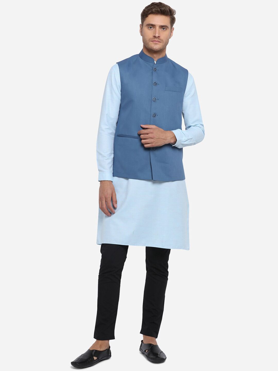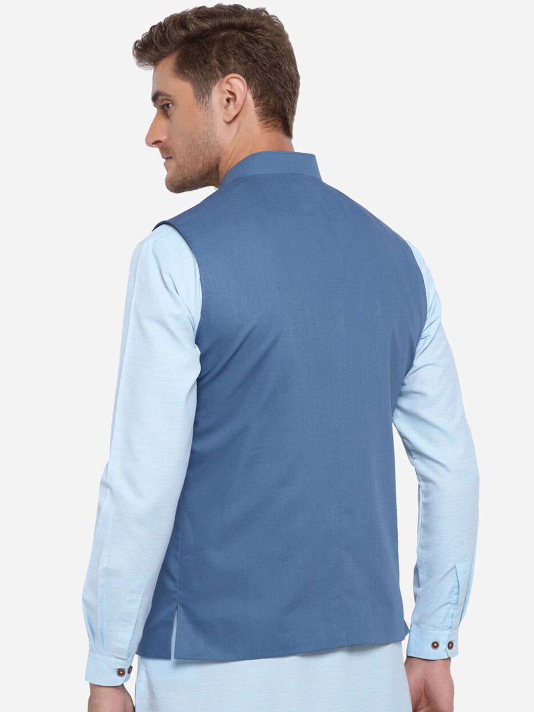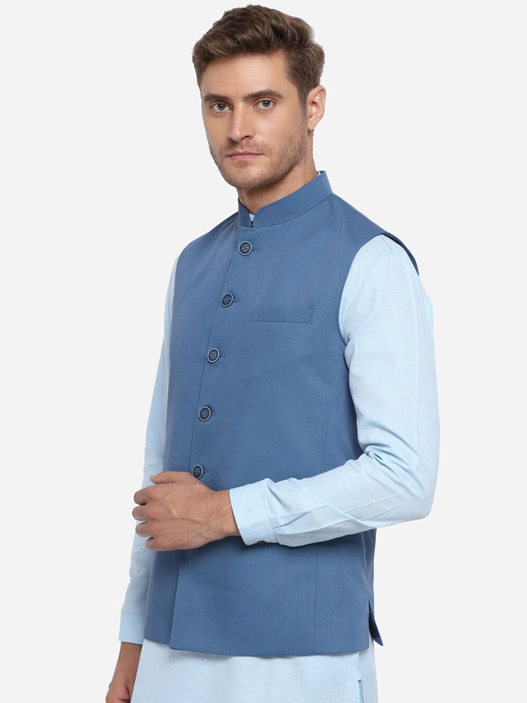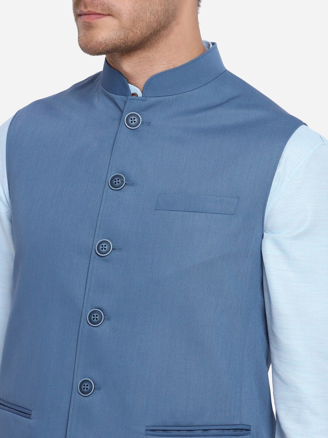 Blue solid Modi Jacket, has a mandarin collar, sleeveless, full button placket and three welt pockets