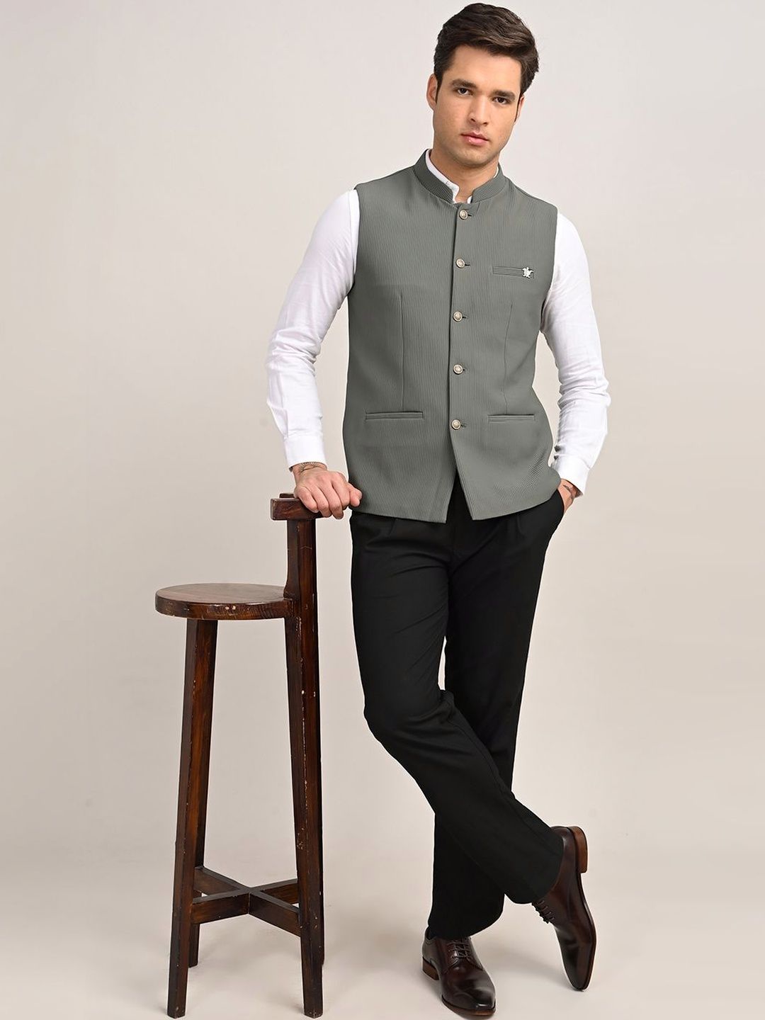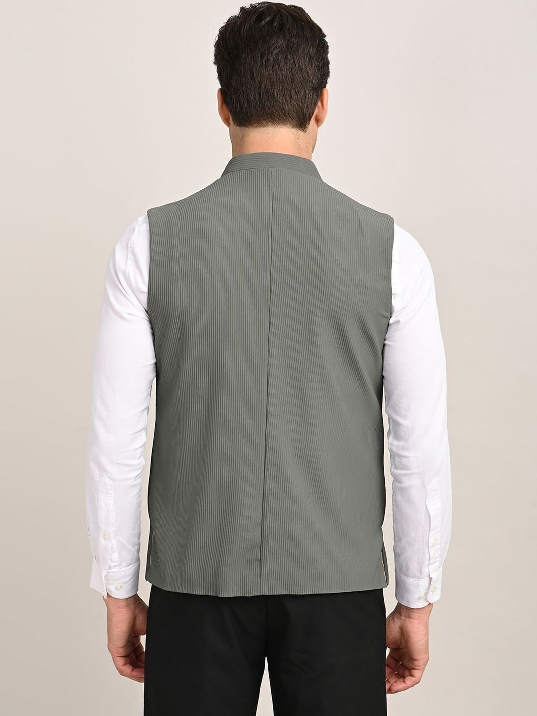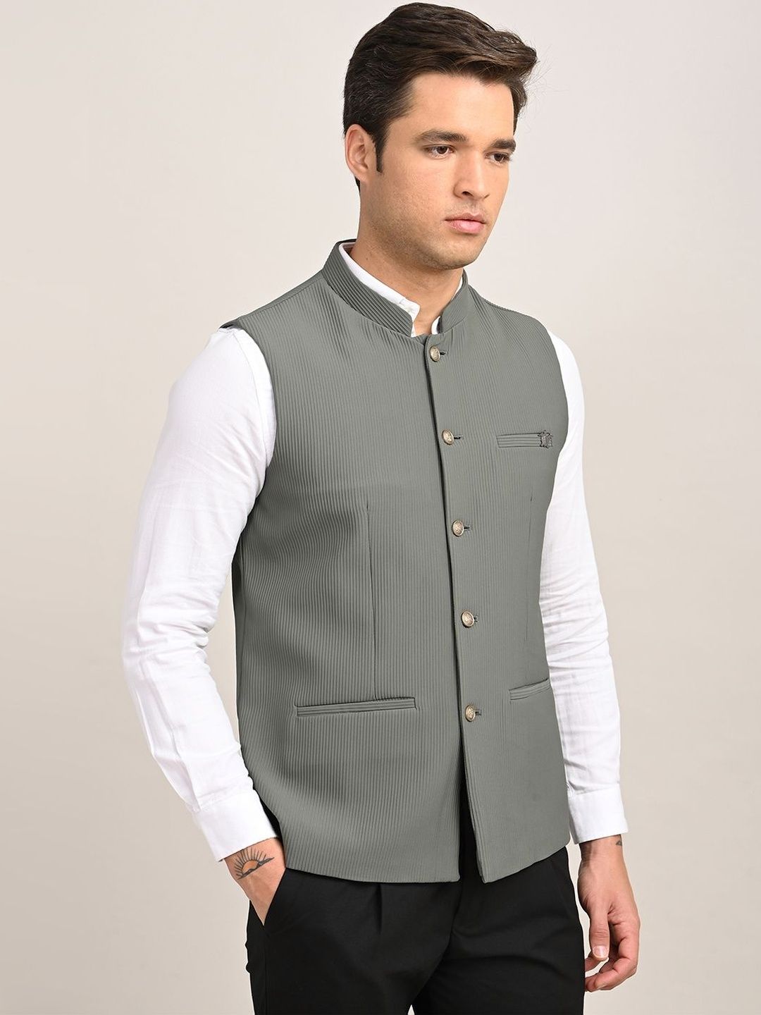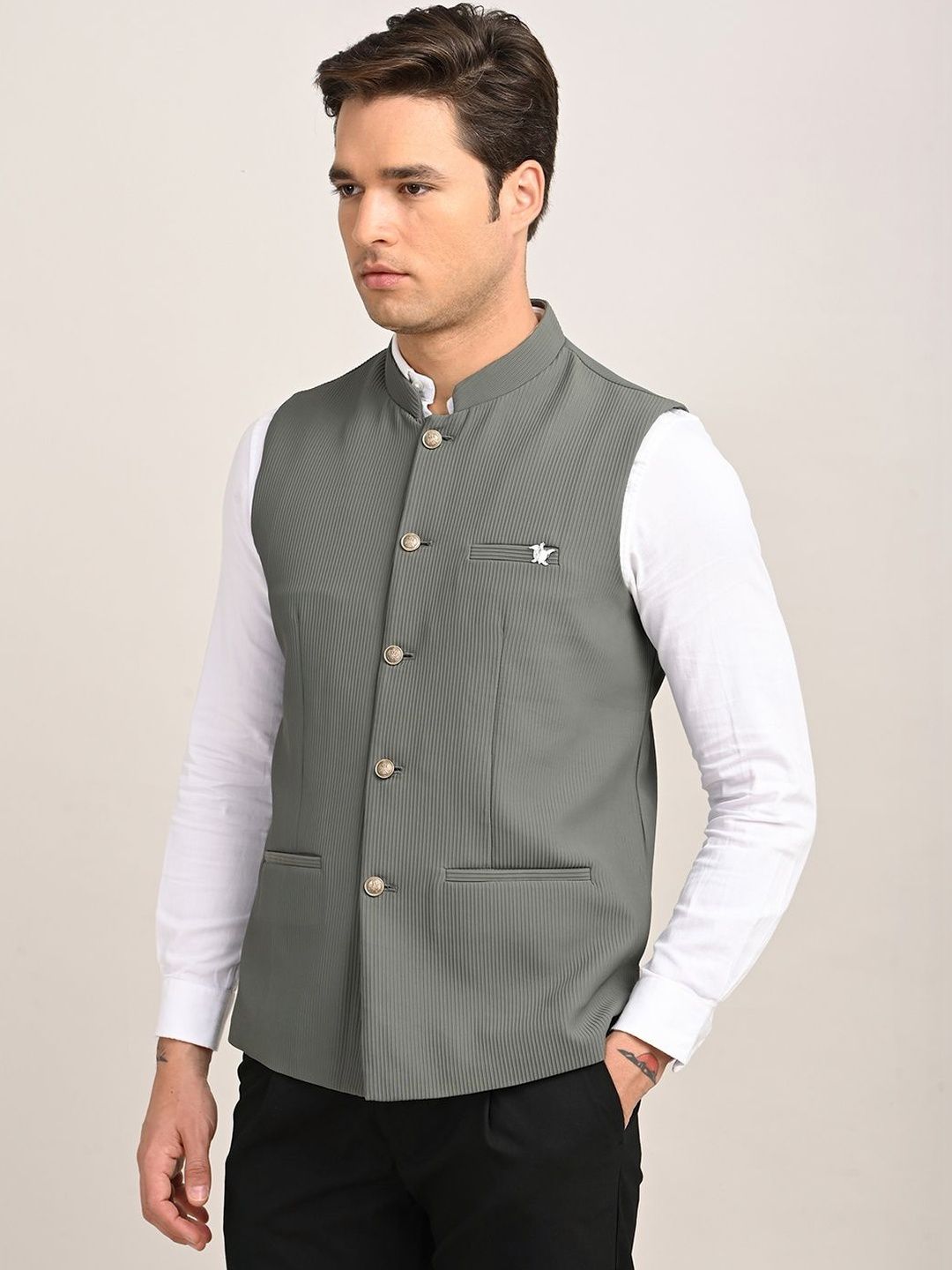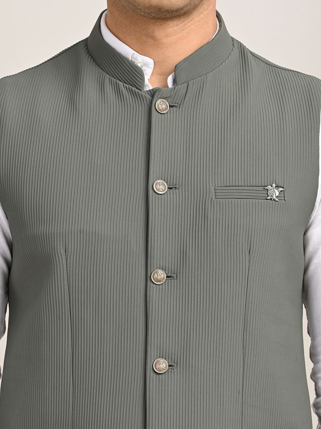 Grey solid woven nehru jackets, has a mandarin collar, a full button placket, sleeveless, 2 pocketsDisclaimerDoes not come with pocket squareNo accessories
