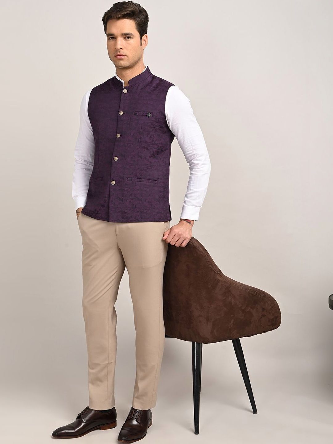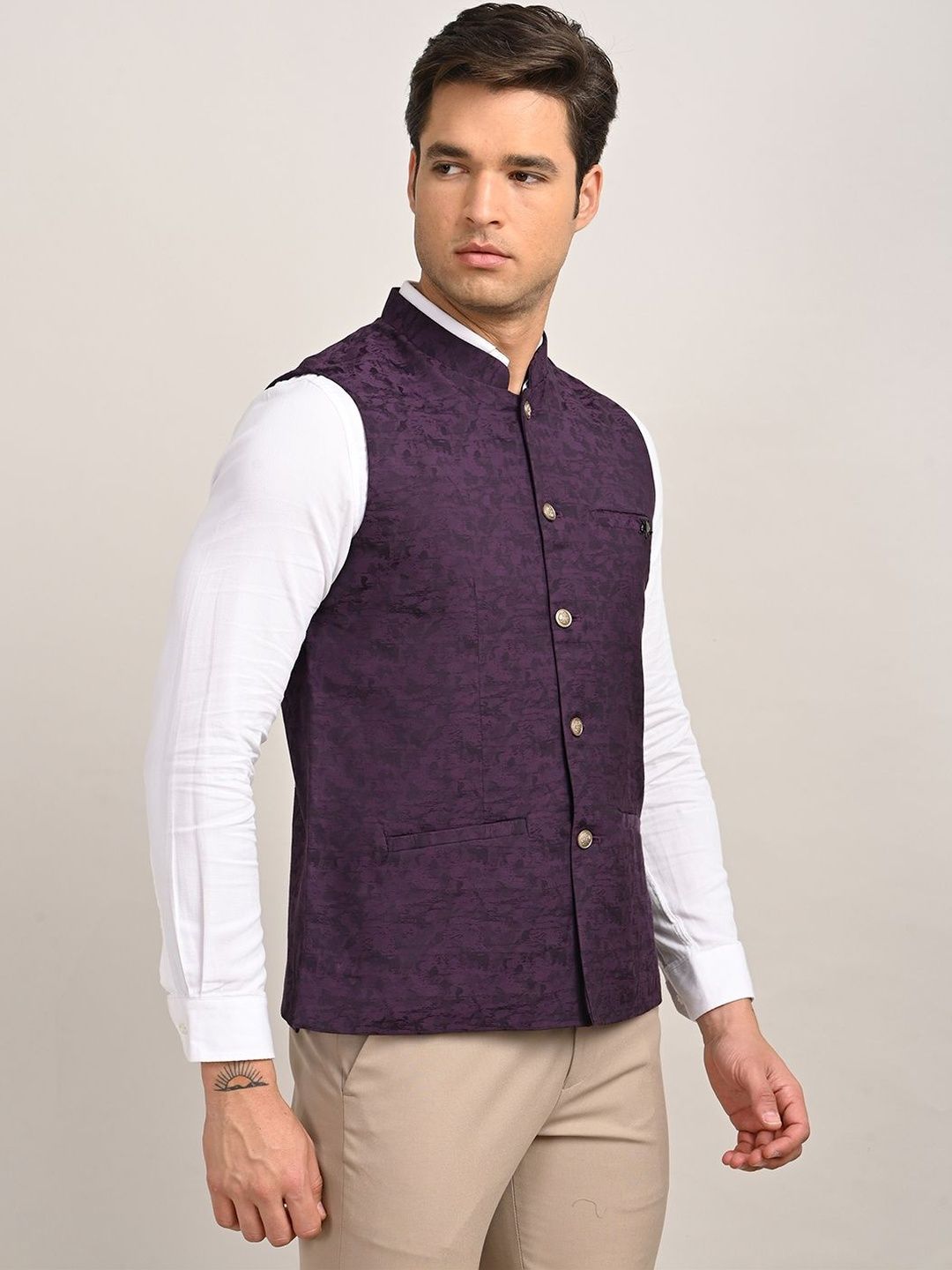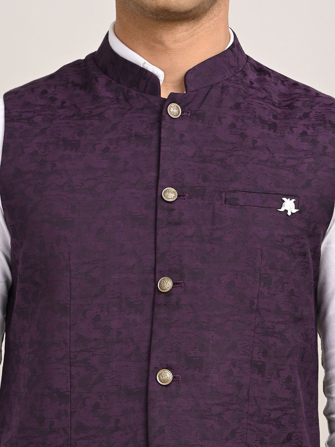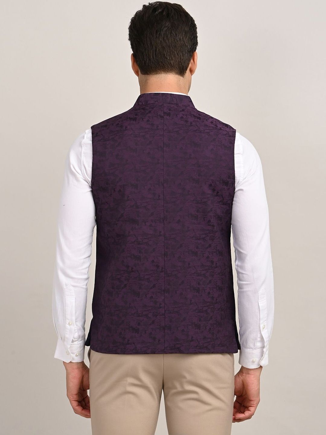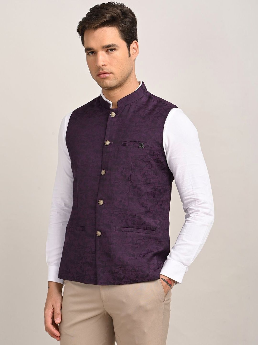 Purple solid woven nehru jackets, has a mandarin collar, a full button placket, sleeveless, 2 pocketsDisclaimerDoes not come with pocket squareNo accessories