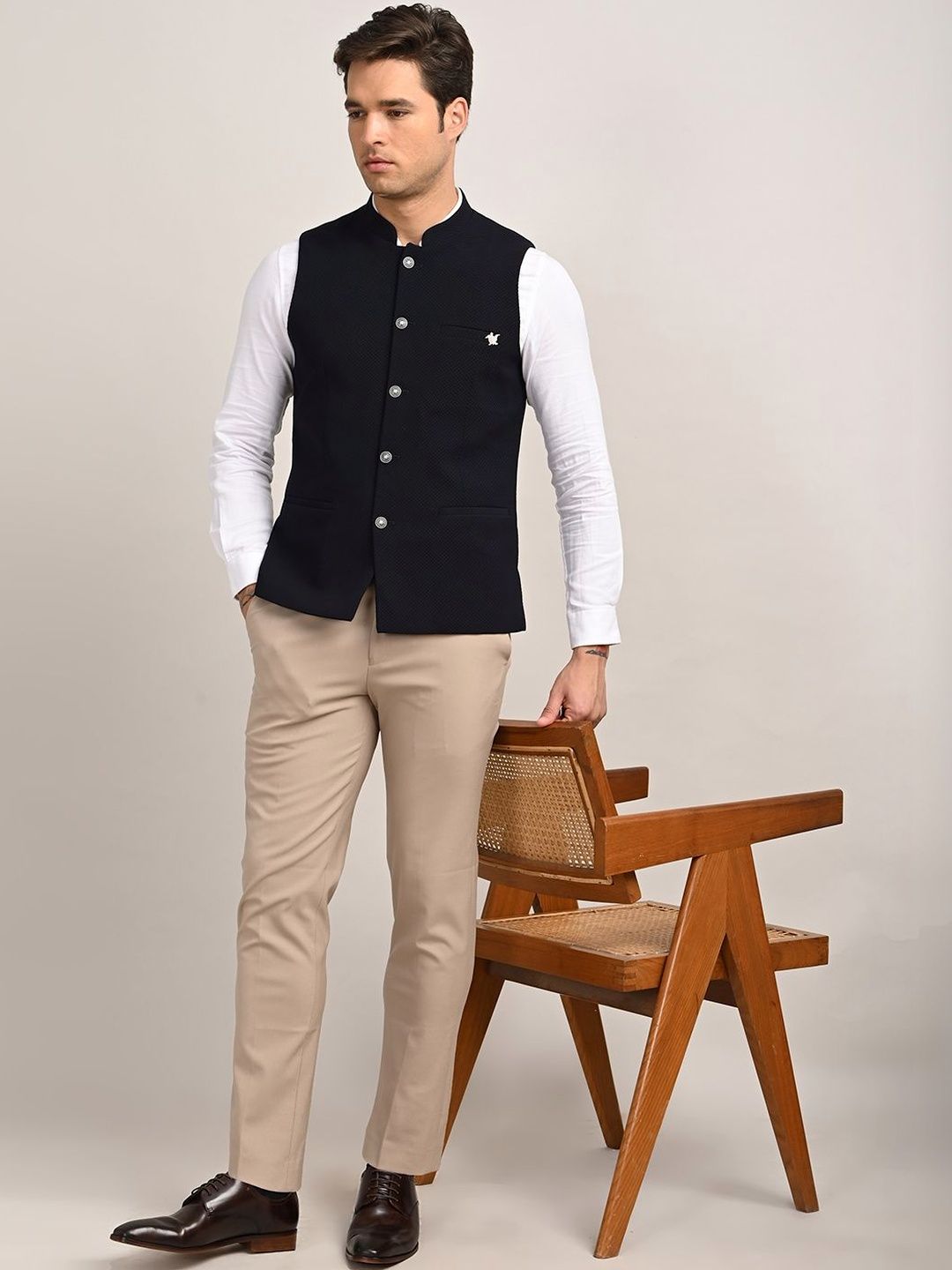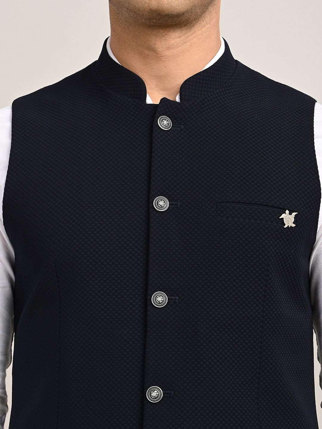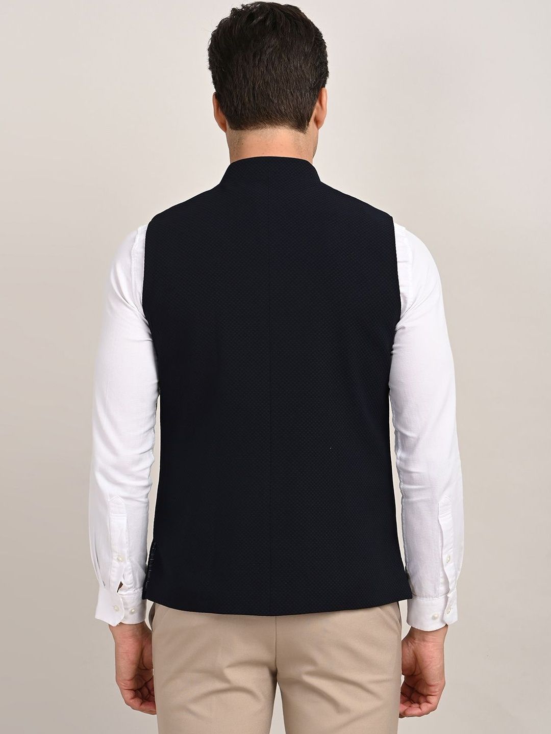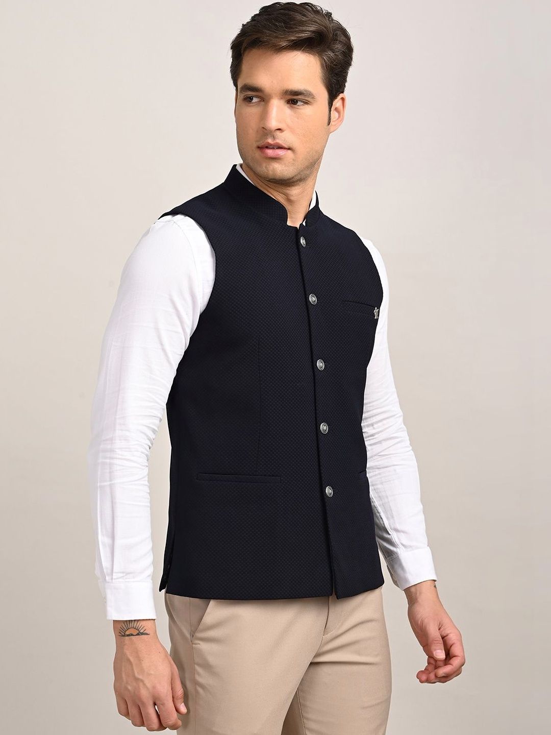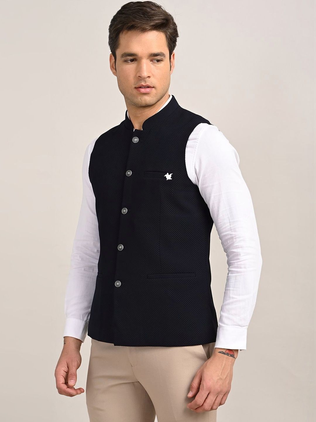 Black solid woven nehru jackets, has a mandarin collar, a full button placket, sleeveless, 2 pocketsDisclaimerDoes not come with pocket squareNo accessories