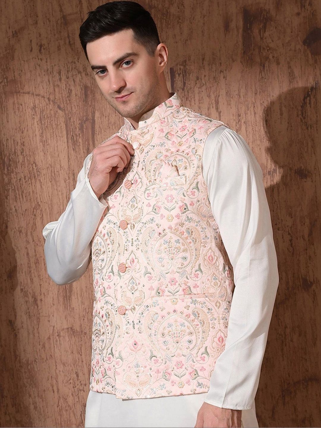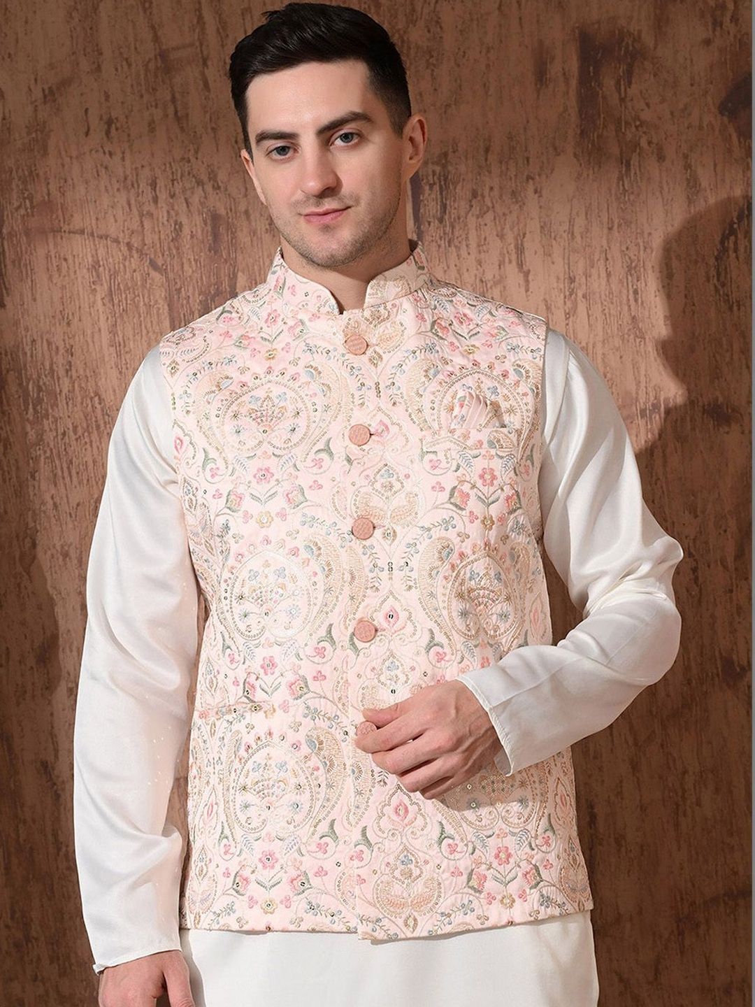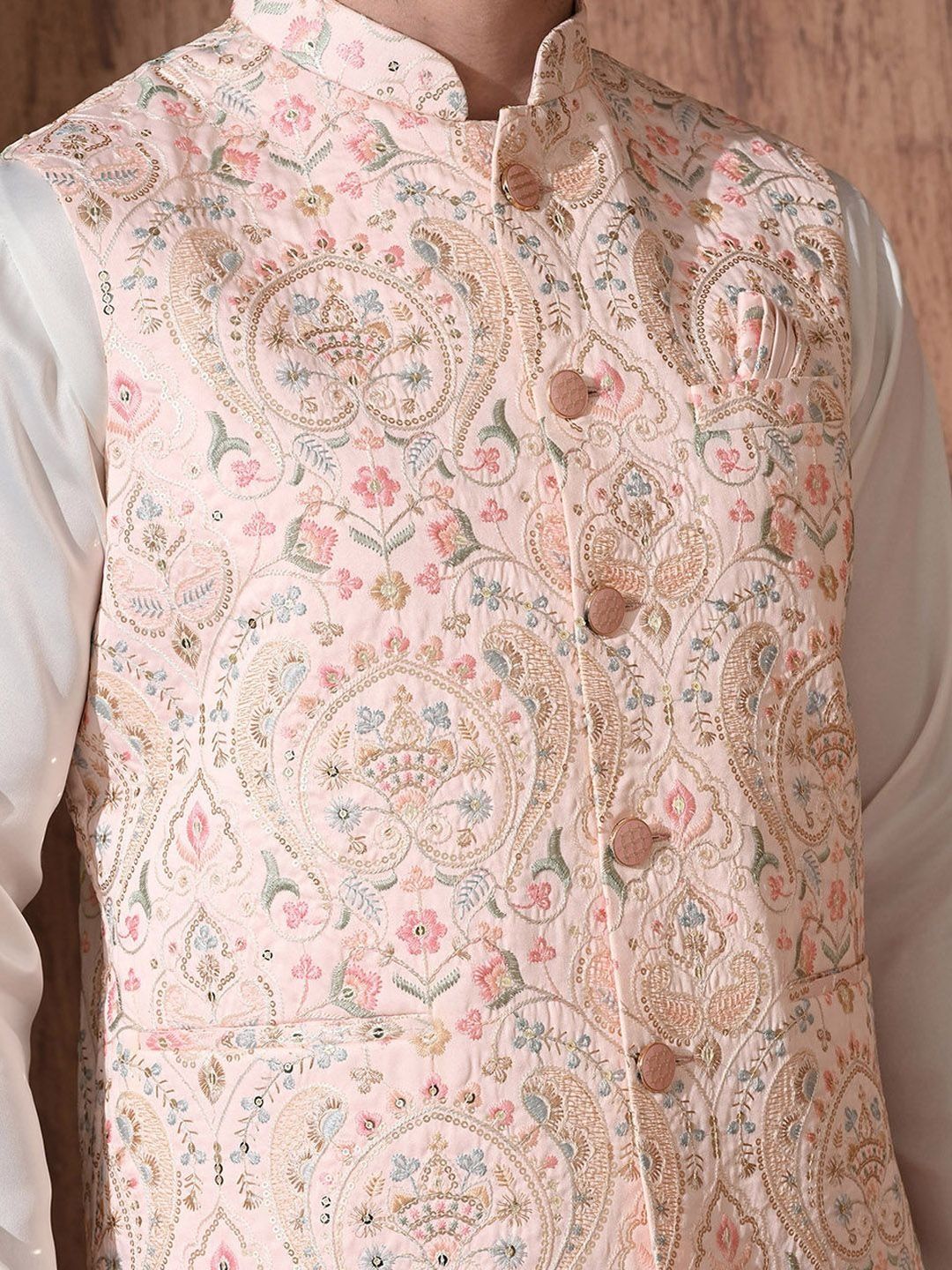 Peach-color & beige Embroidered woven Nehru jacket, has a mandarin collar, a full button placket, sleeveless, three pocketsDisclaimerDoes not come with pocket squareNo accessories