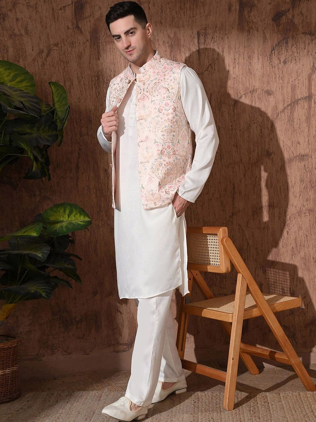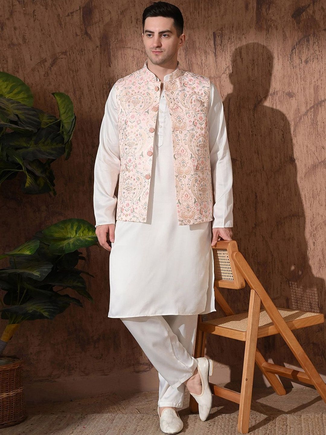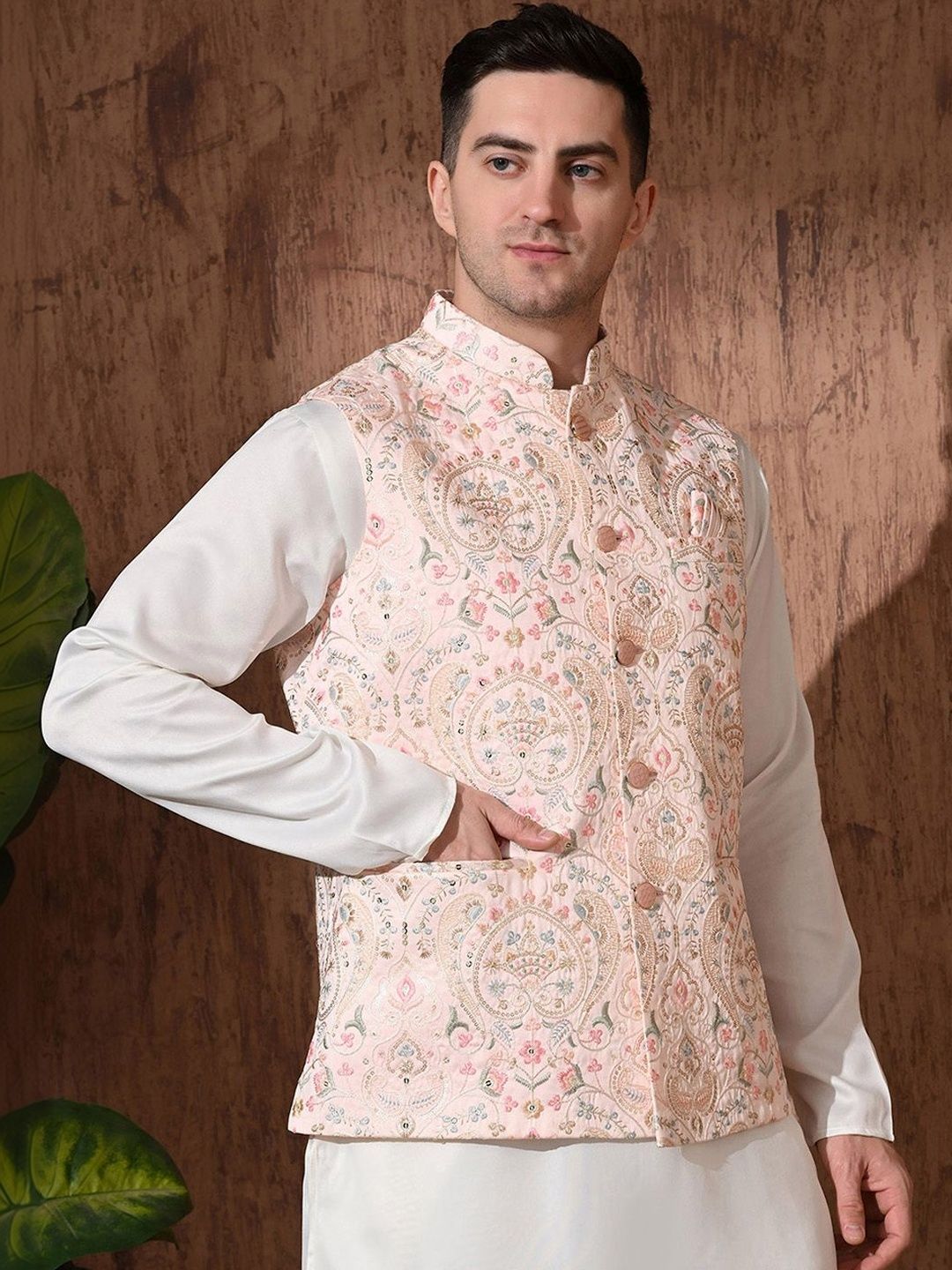 Peach-color & beige Embroidered woven Nehru jacket, has a mandarin collar, a full button placket, sleeveless, three pocketsDisclaimerDoes not come with pocket squareNo accessories