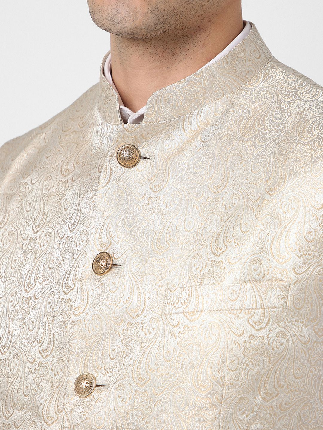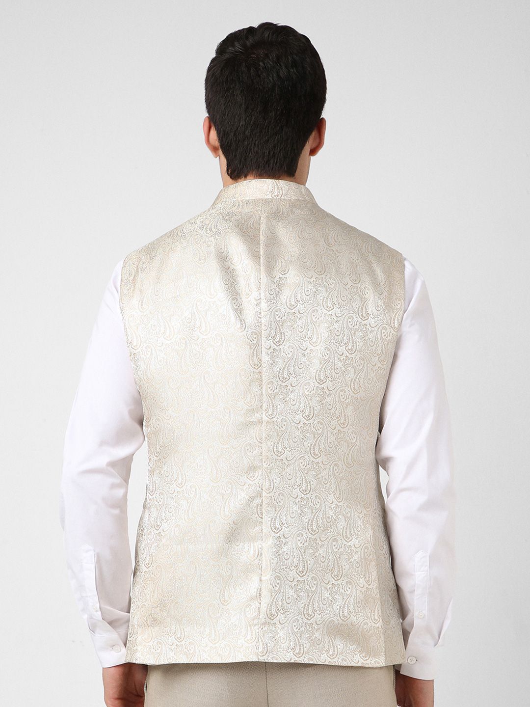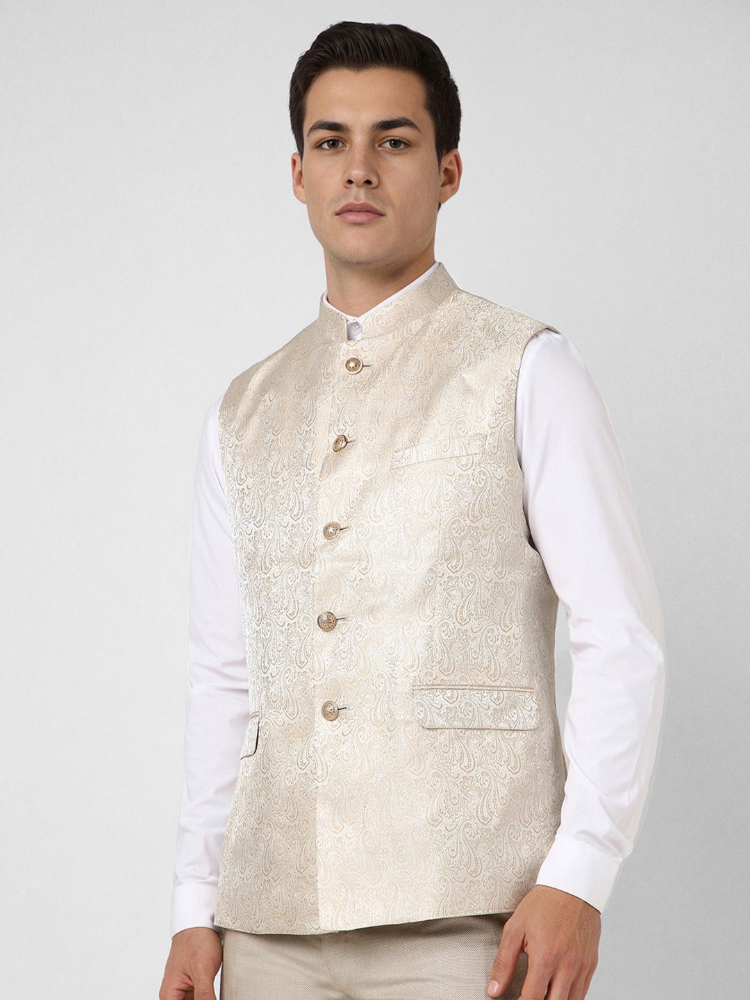 Beige Textured woven Nehru jacket, has a mandarin collar, a full button placket, sleeveless, three pockets