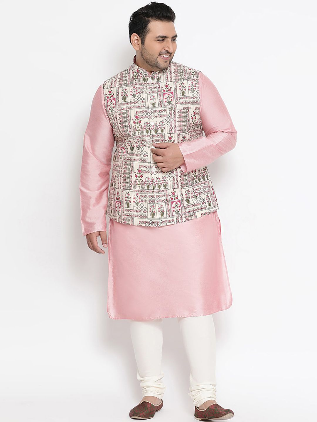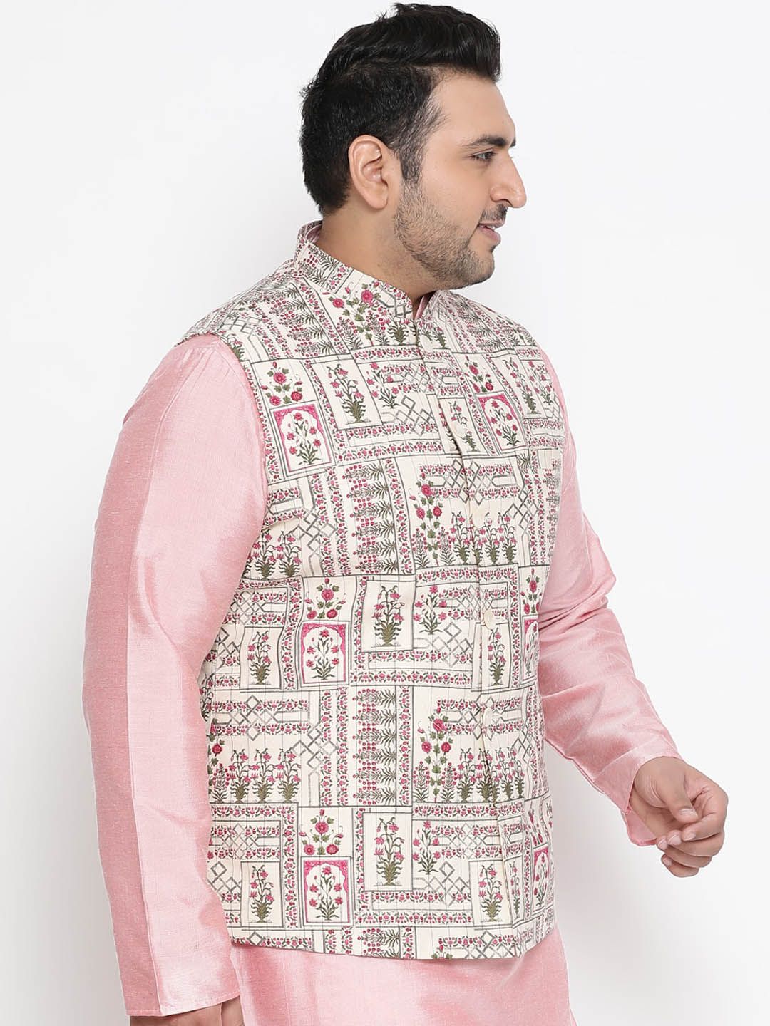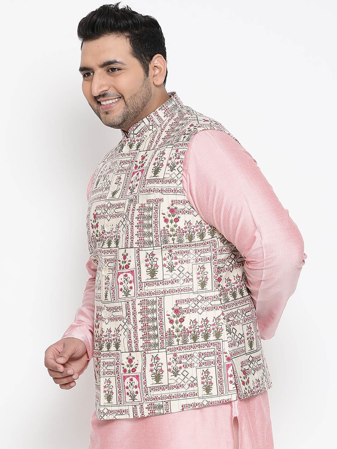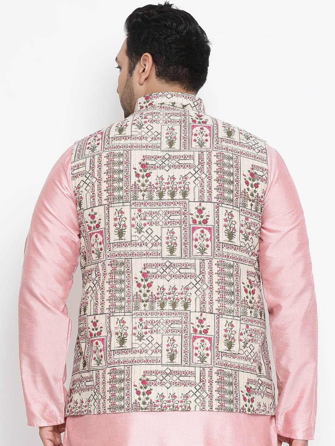 Beige, green and pink printed regular-fit Nehru jacket, has a mandarin collar, a full button placket, sleeveless, and one pocket