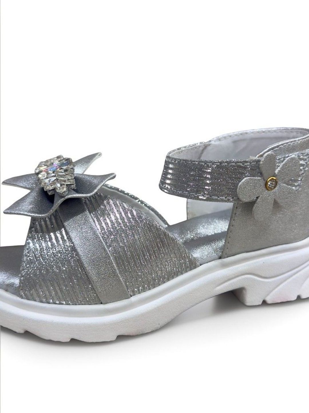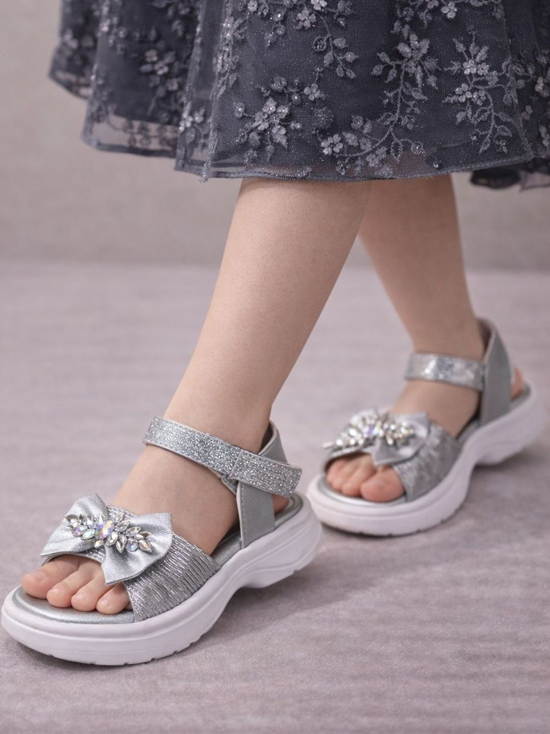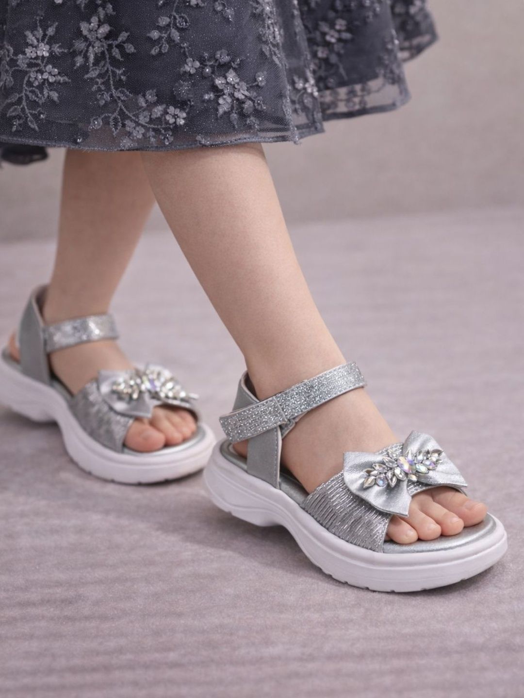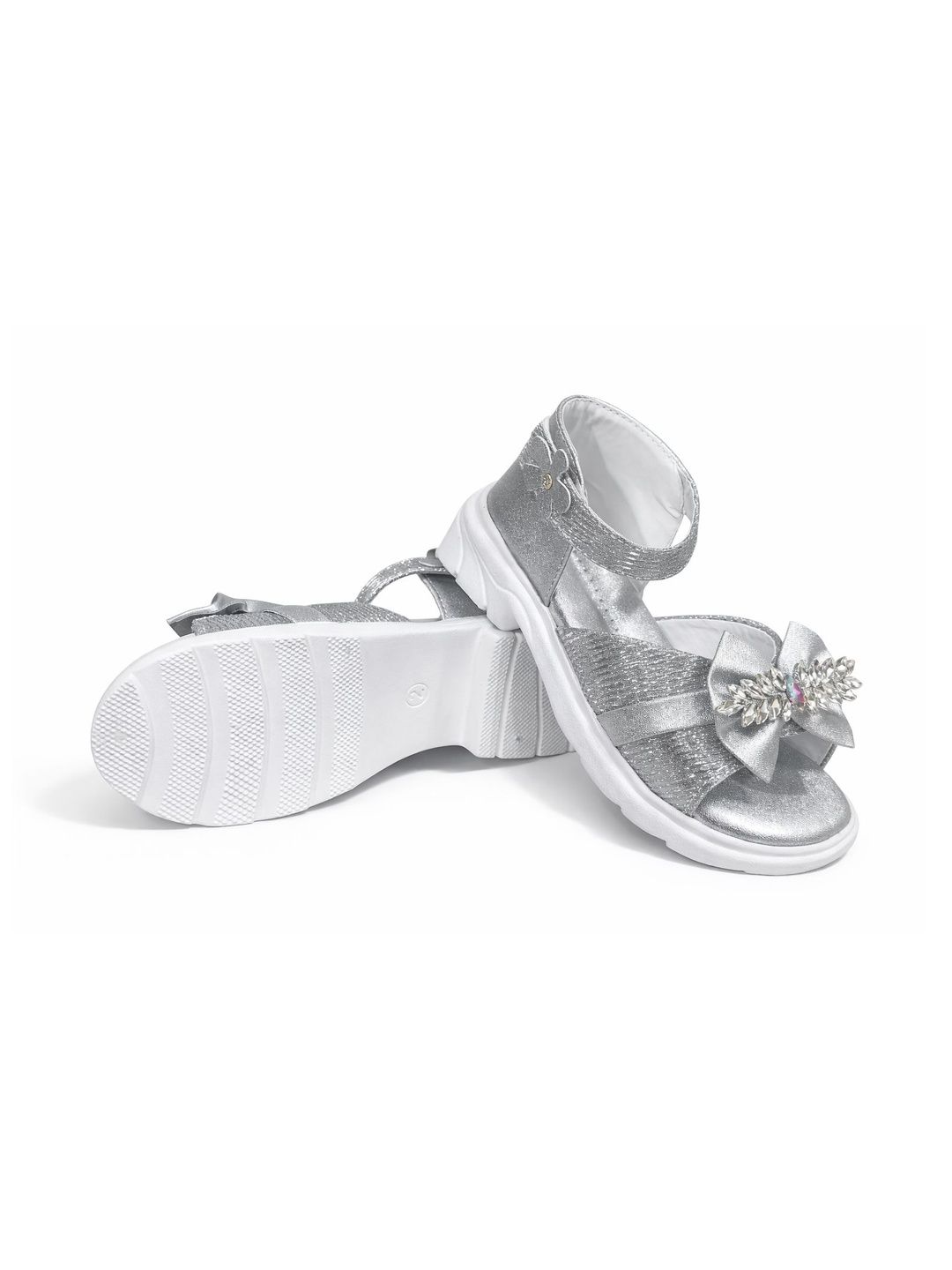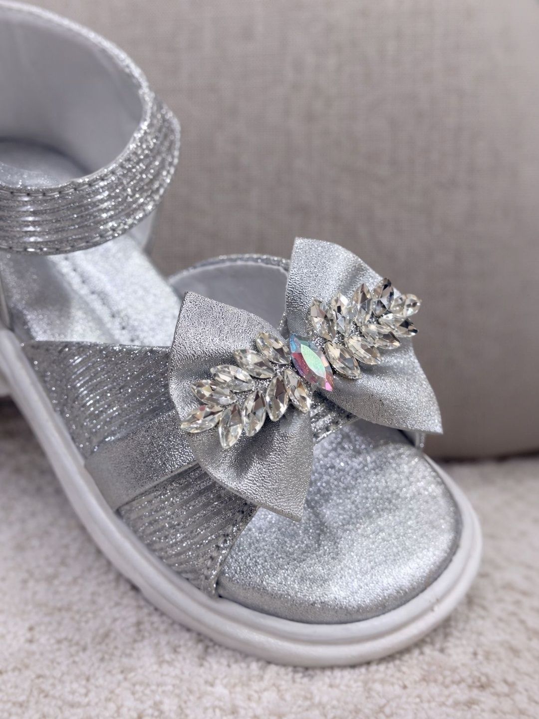 Make your little one shine with these embellished bow sandals featuring crystal detailing and a comfy Velcro strap.
