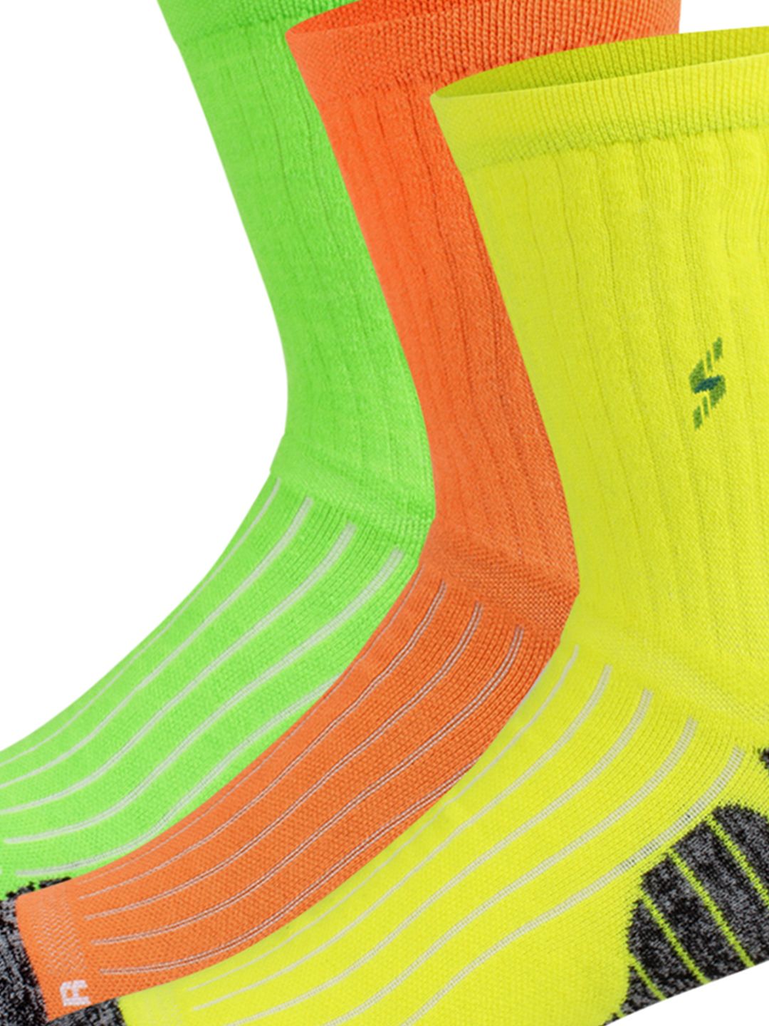 Pack of 3 pairs of calf-length socksA pair of green and grey colourblocked calf-length socks, each has a ribbed mouth and flat toe seamA pair of orange and grey colourblocked calf-length socks, each has a ribbed mouth and flat toe seamA pair of yellow and grey colourblocked calf-length socks, each has a ribbed mouth and flat toe seam