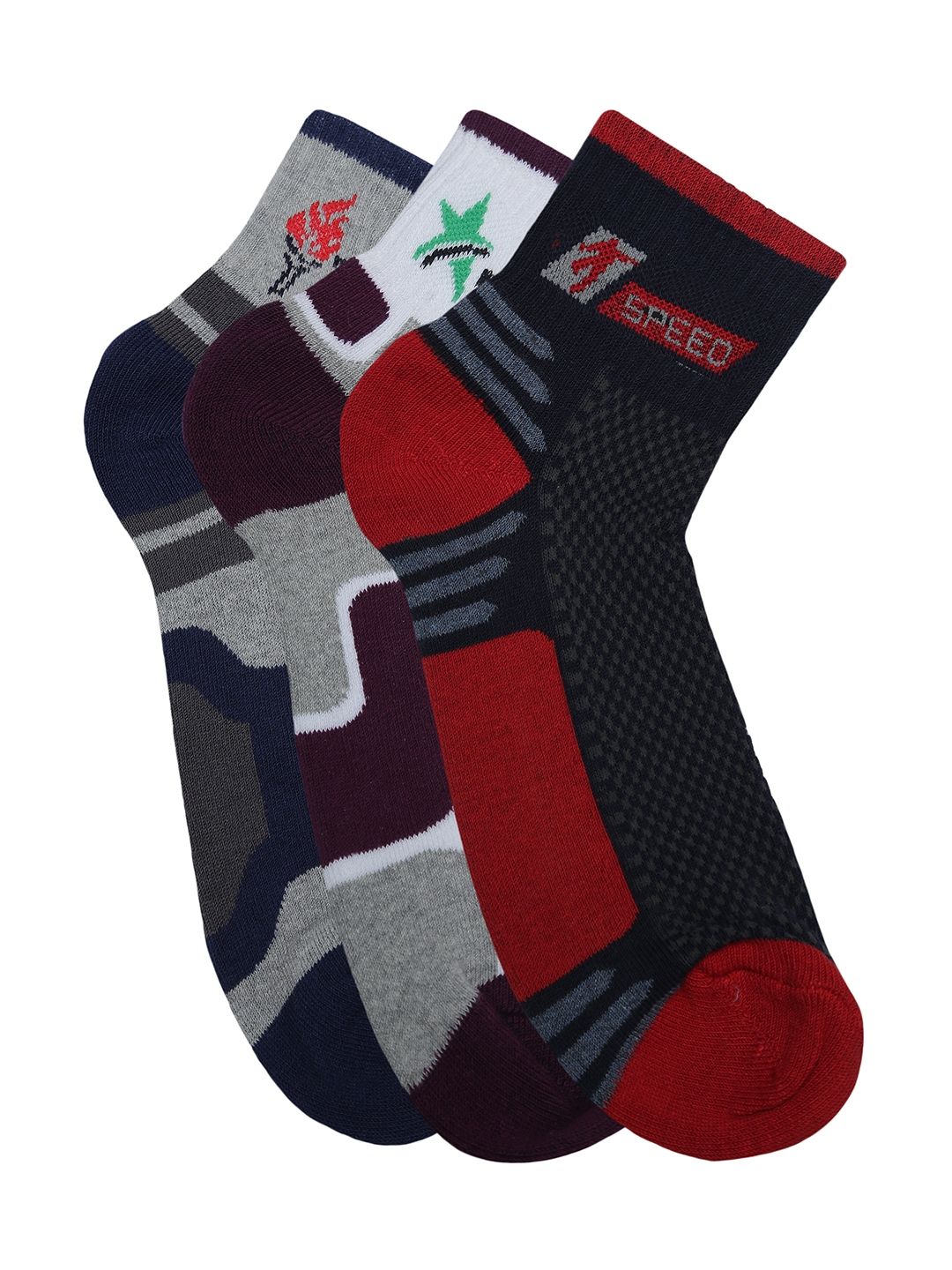 Pack of three assorted ankle-length patterned socks, each has an elasticated mouth and flat toe seam