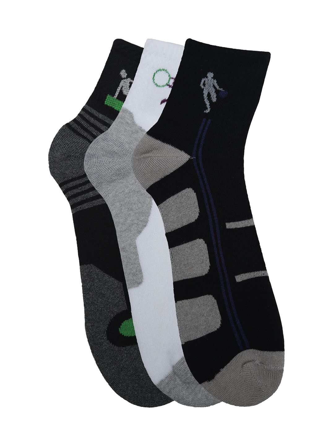 Pack of three assorted ankle-length patterned socks, each has a ribbed mouth and flat toe seam