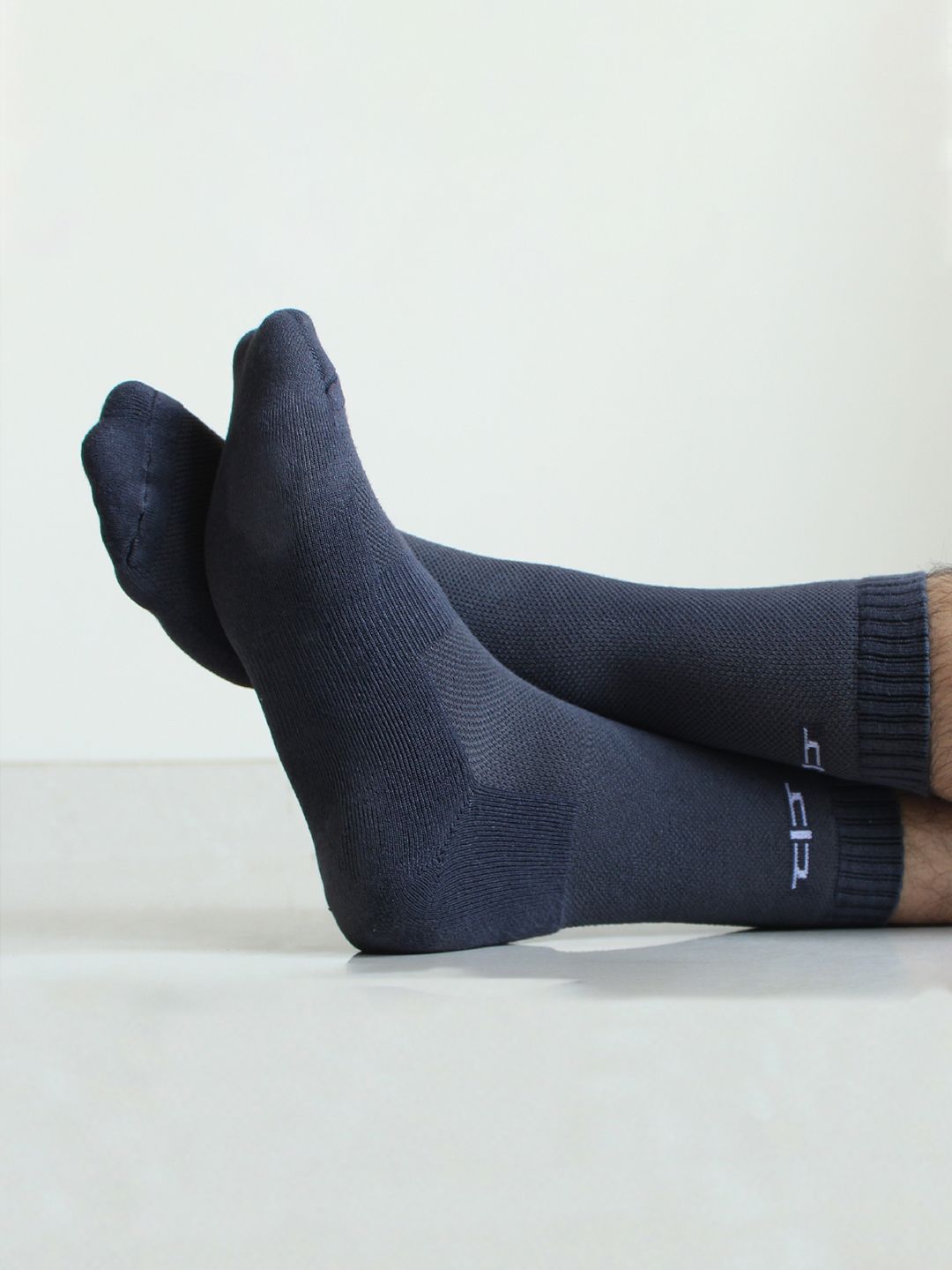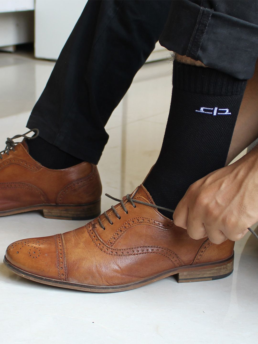 Pack of two pairs of solid calf-length socks in black and grey, each has a ribbed mouth and a flat-toe seamFeature: Bamboo fiber is known for its softness. Spandex blended with Bamboo makes these socks the best in softness, cushioning and impact protection. Odour control through the natural anti-bacterial property of bamboo material. Heelium formal socks are 2-3 times stronger and more durable than cotton, nylon or polyester socks.