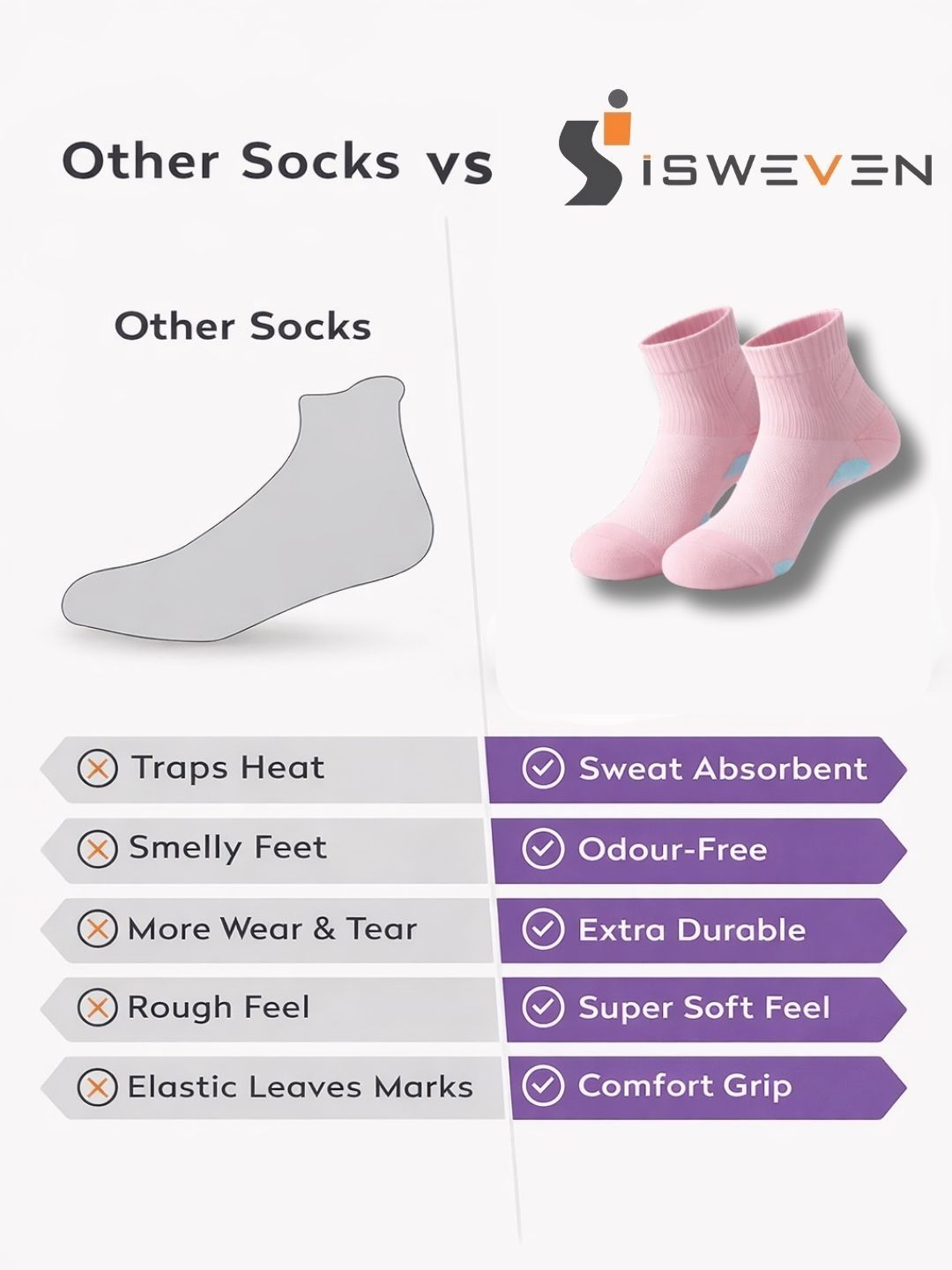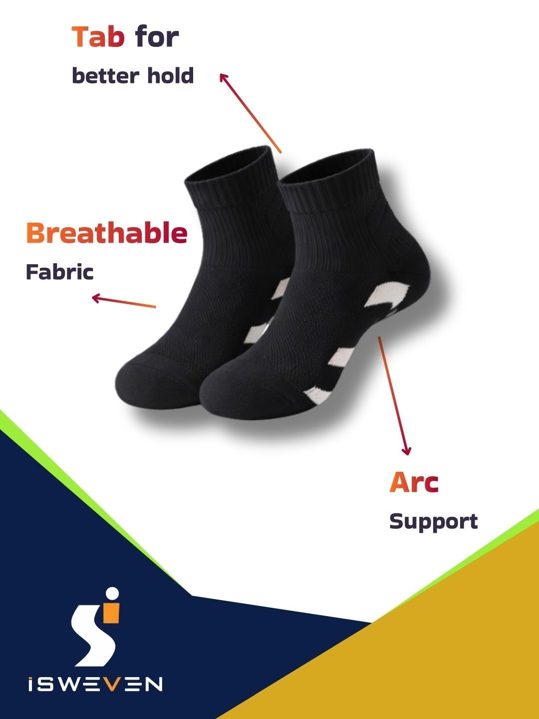 Breathable mesh for airflow. Arch support for reduced fatigue. Cushioned sole for impact absorption. Anti-slip grip for secure fit. Odour-free fabric. Durable & stretch-resistant. Unisex design