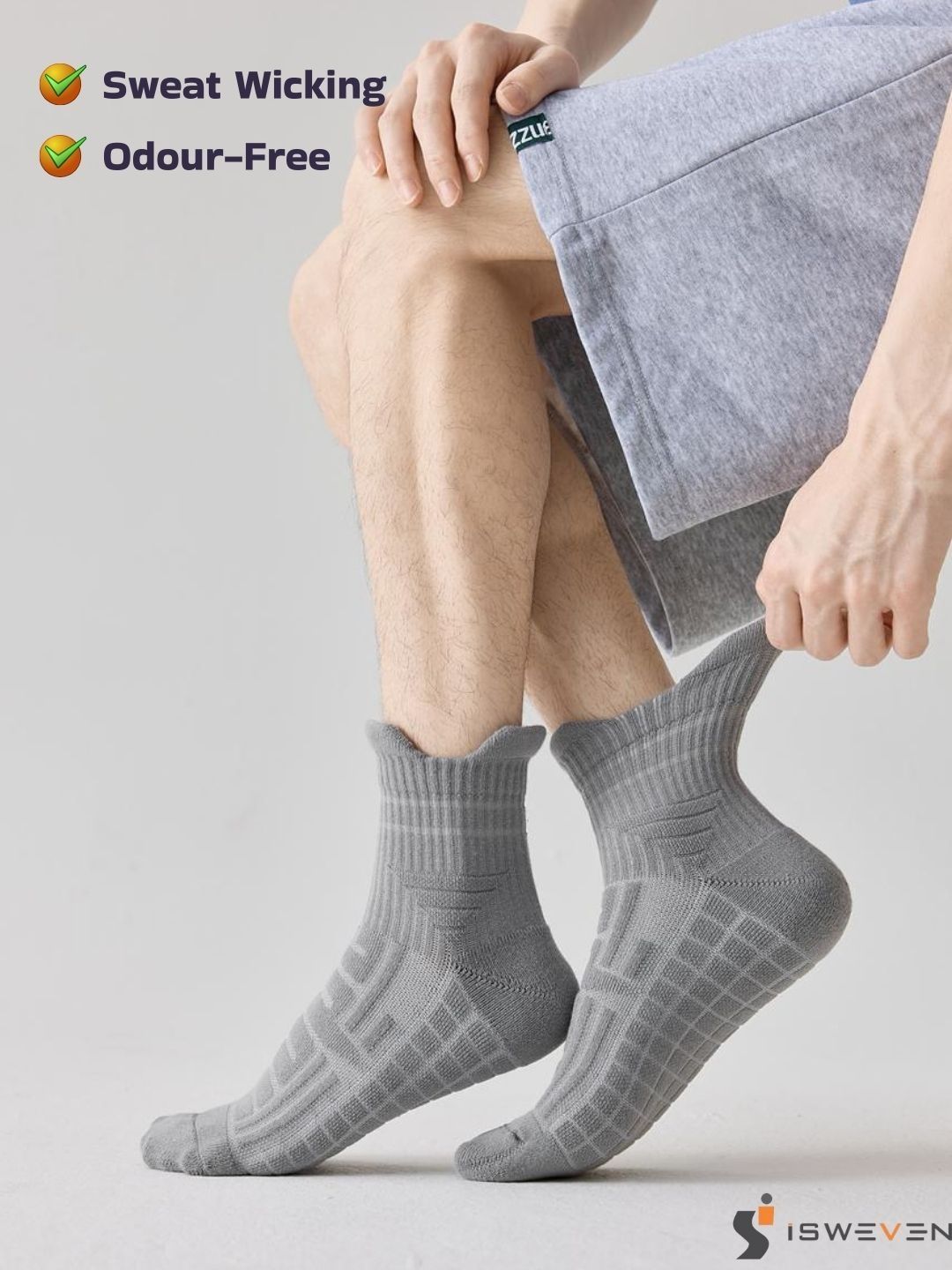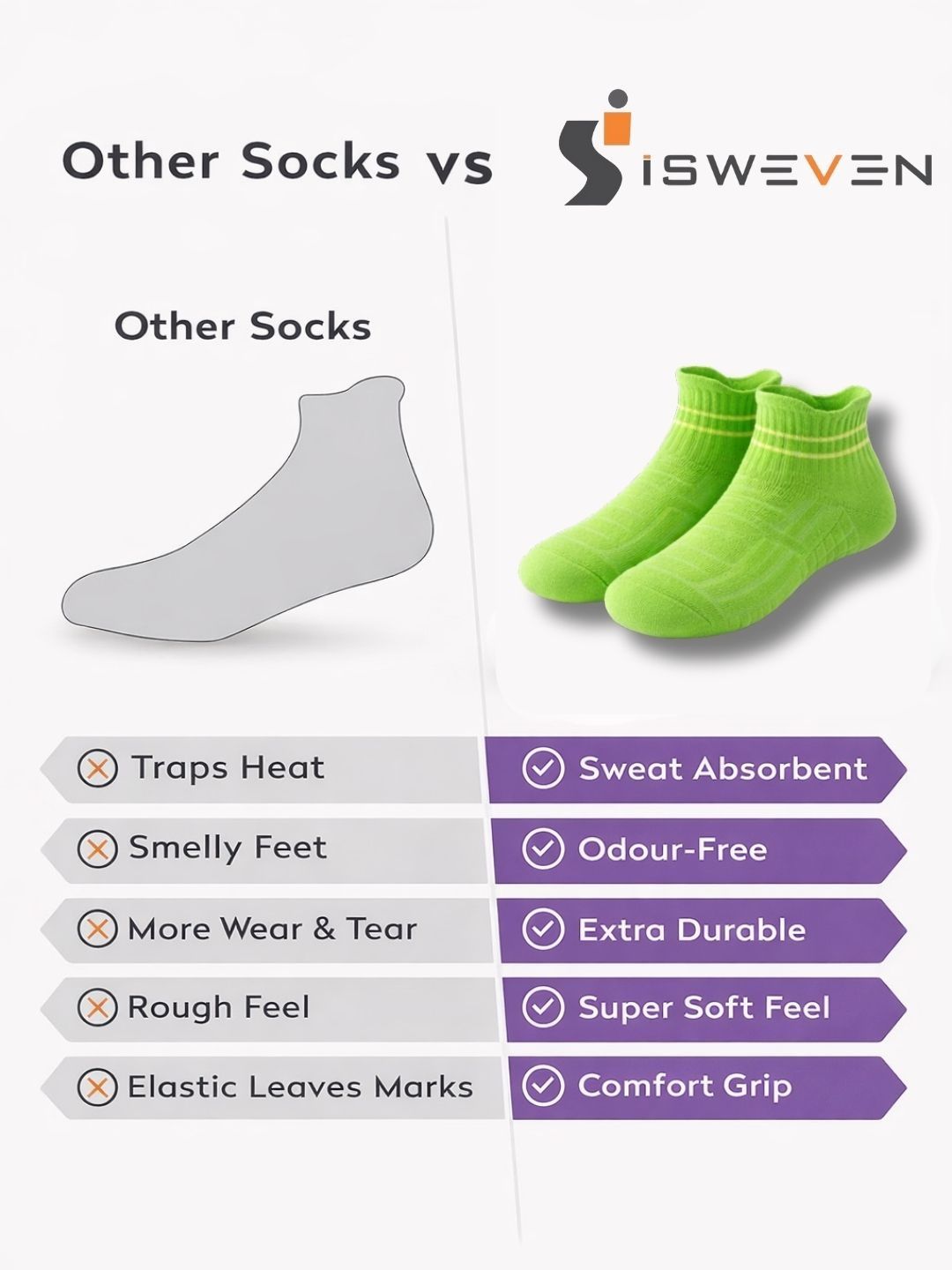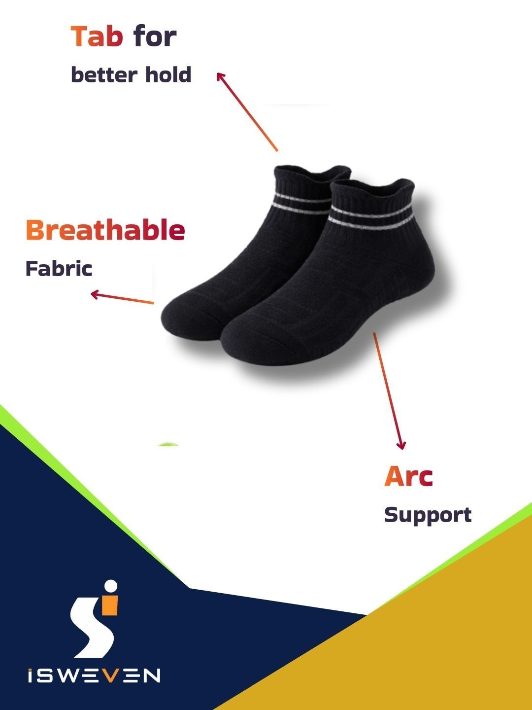 Breathable mesh for airflow. Arch support for reduced fatigue. Cushioned sole for impact absorption. Anti-slip grip for secure fit. Odour-free fabric. Durable & stretch-resistant. Unisex design