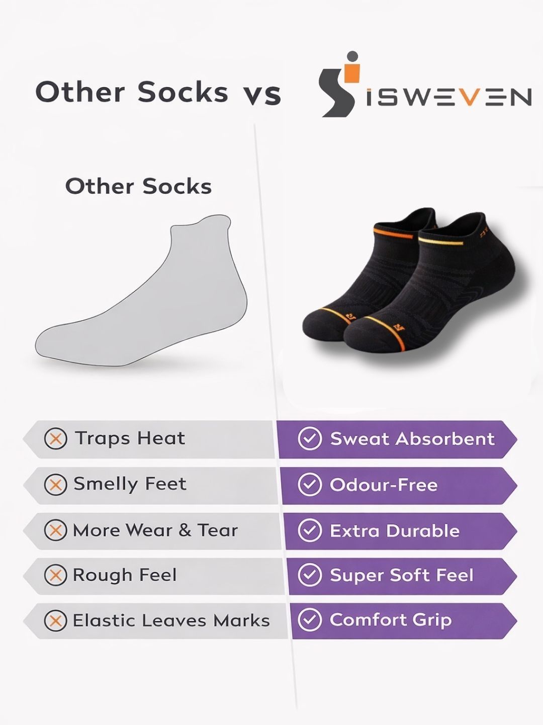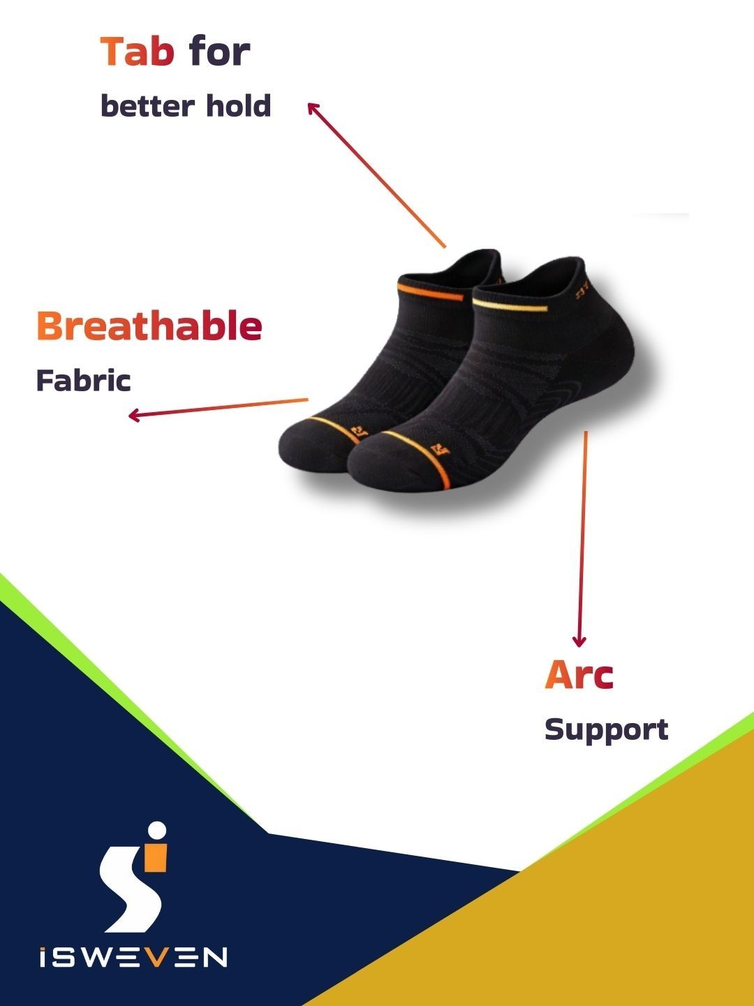 Breathable mesh for airflow. Arch support for reduced fatigue. Cushioned sole for impact absorption. Anti-slip grip for secure fit. Odour-free fabric. Durable & stretch-resistant. Unisex design