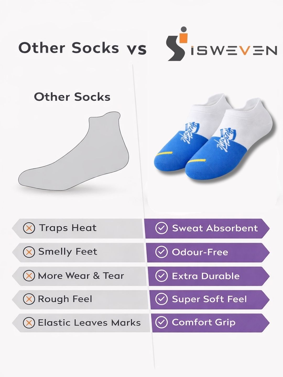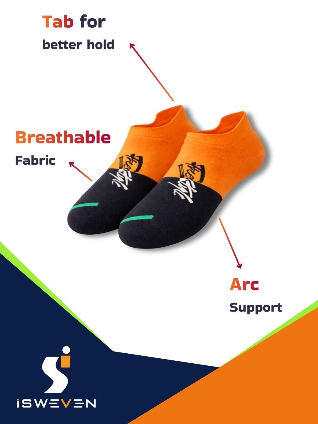 Breathable mesh for airflow. Arch support for reduced fatigue. Cushioned sole for impact absorption. Anti-slip grip for secure fit. Odour-free fabric. Durable & stretch-resistant. Unisex design