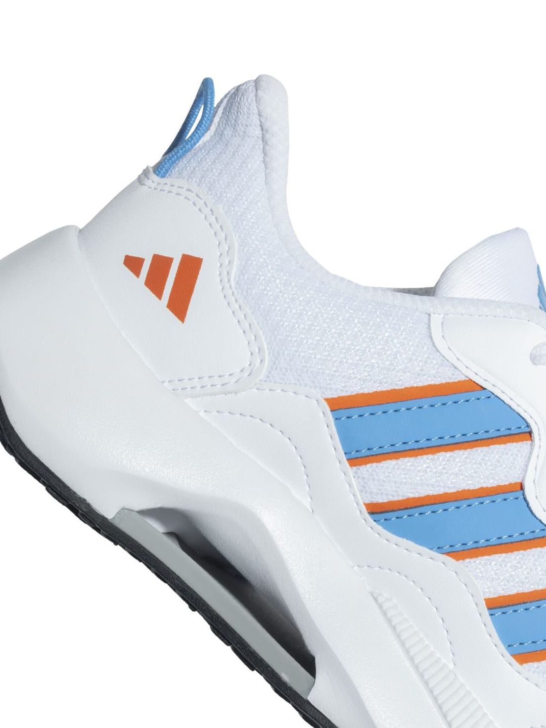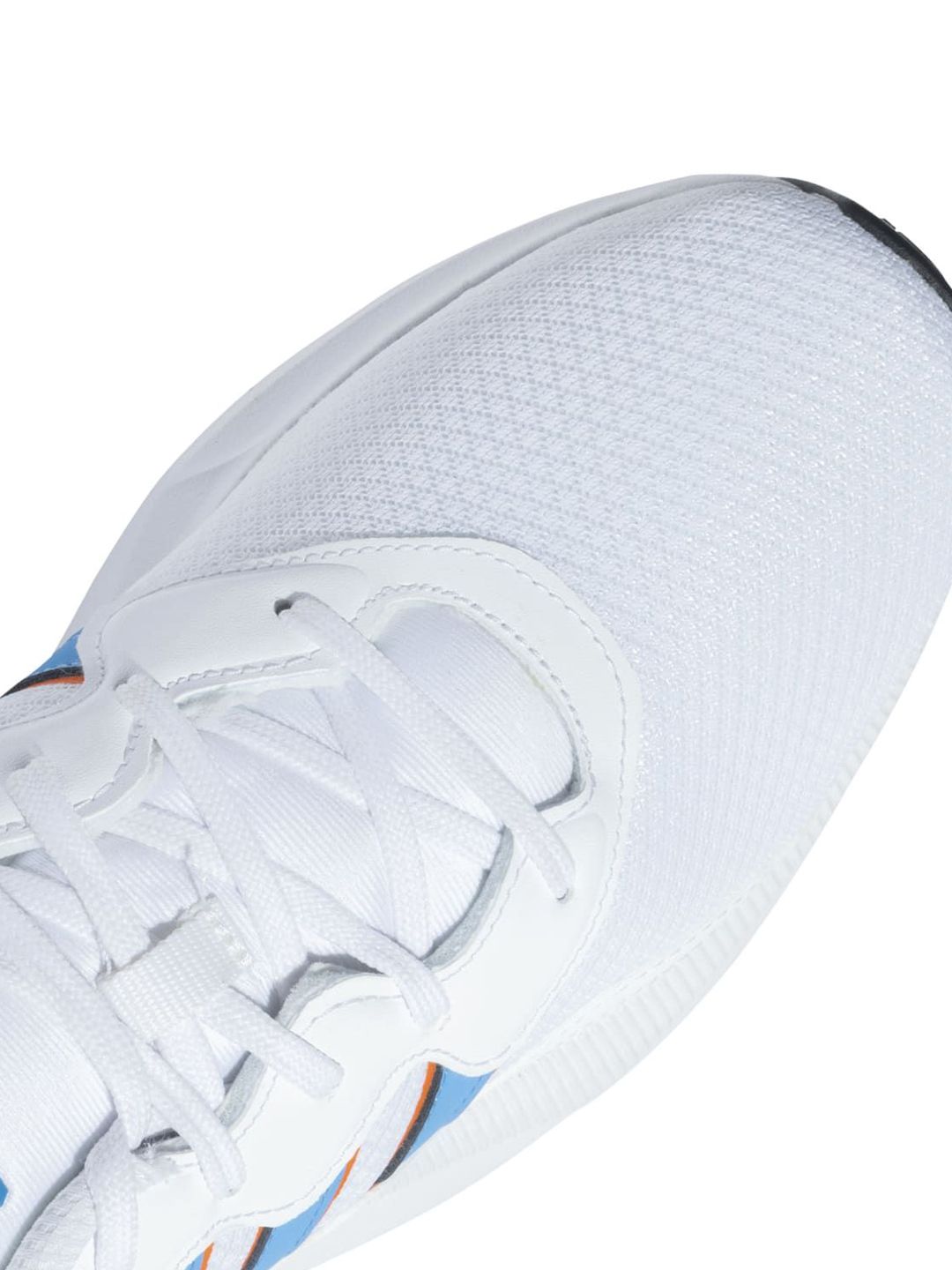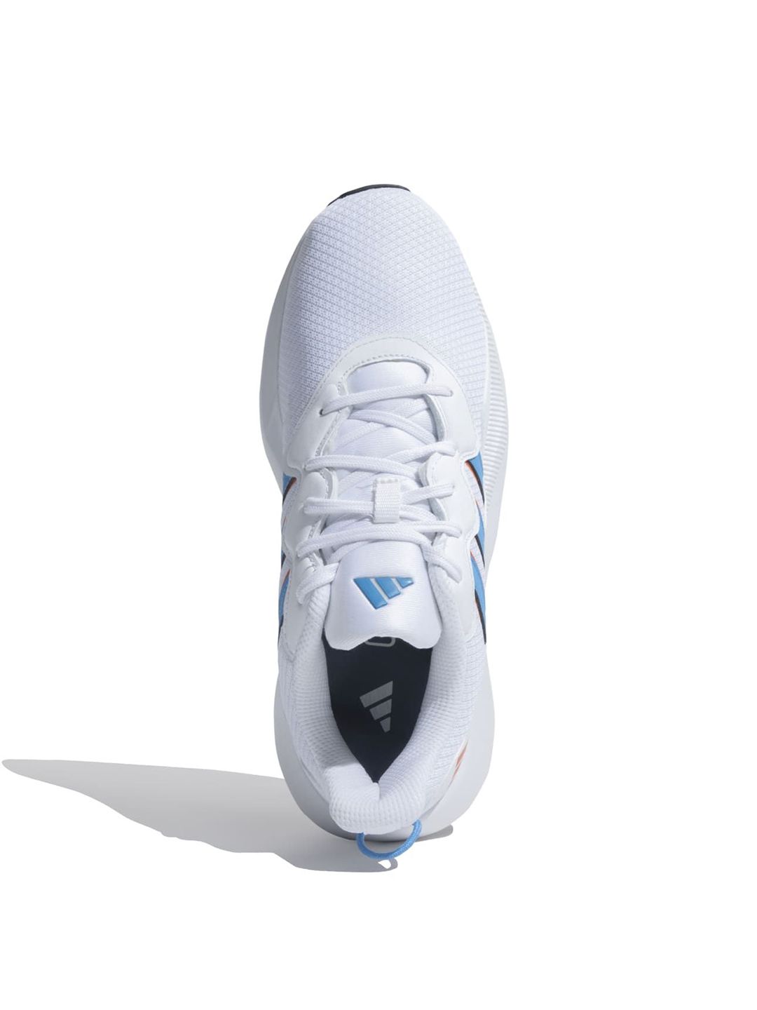 Product Design Details:A pair of white and blue round toe regular sports shoes with regular styling has a lace-up closure