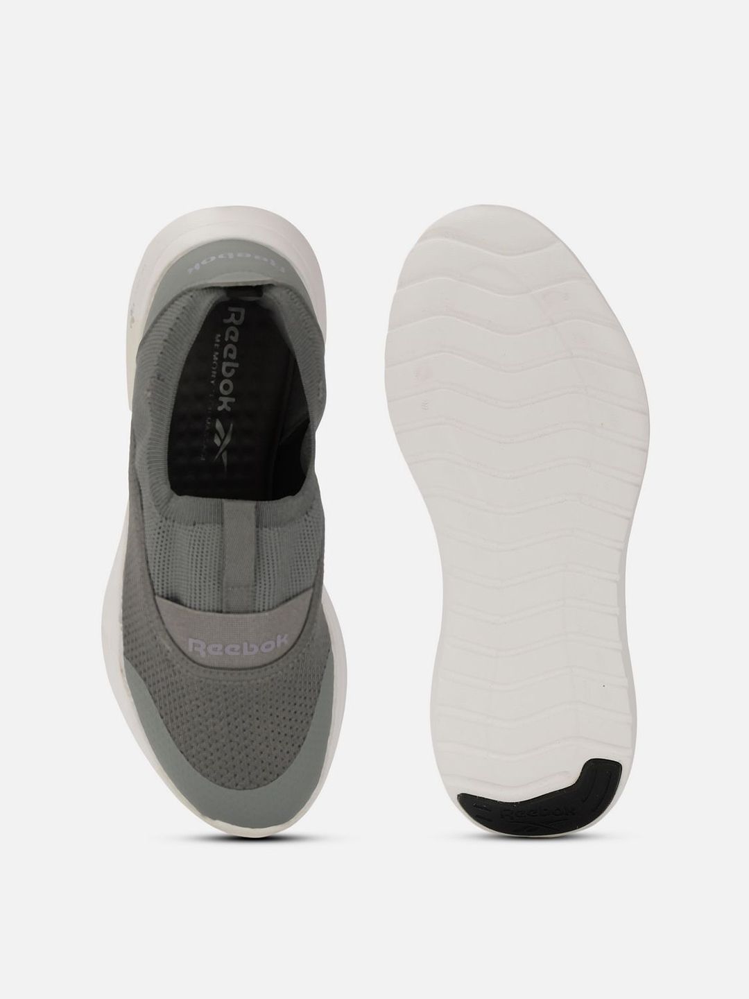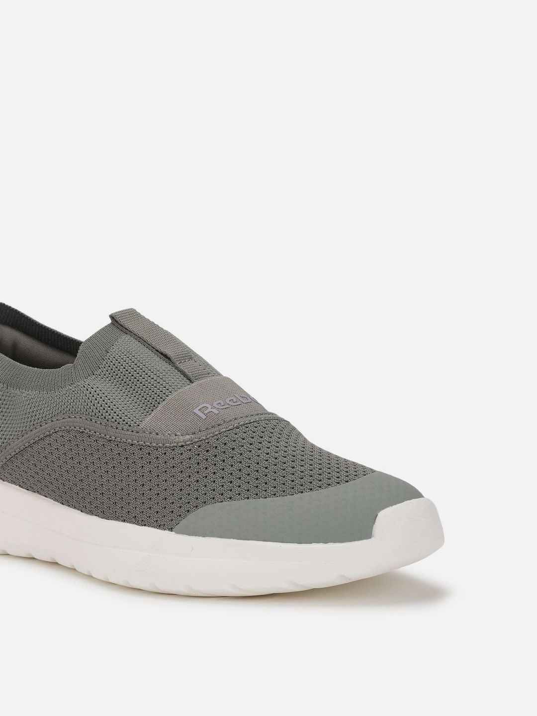 A pair of grey textured sports shoes secured with a slip on closureSynthetic upper materialCushioned foot bedTextured and patterned rubber outsole